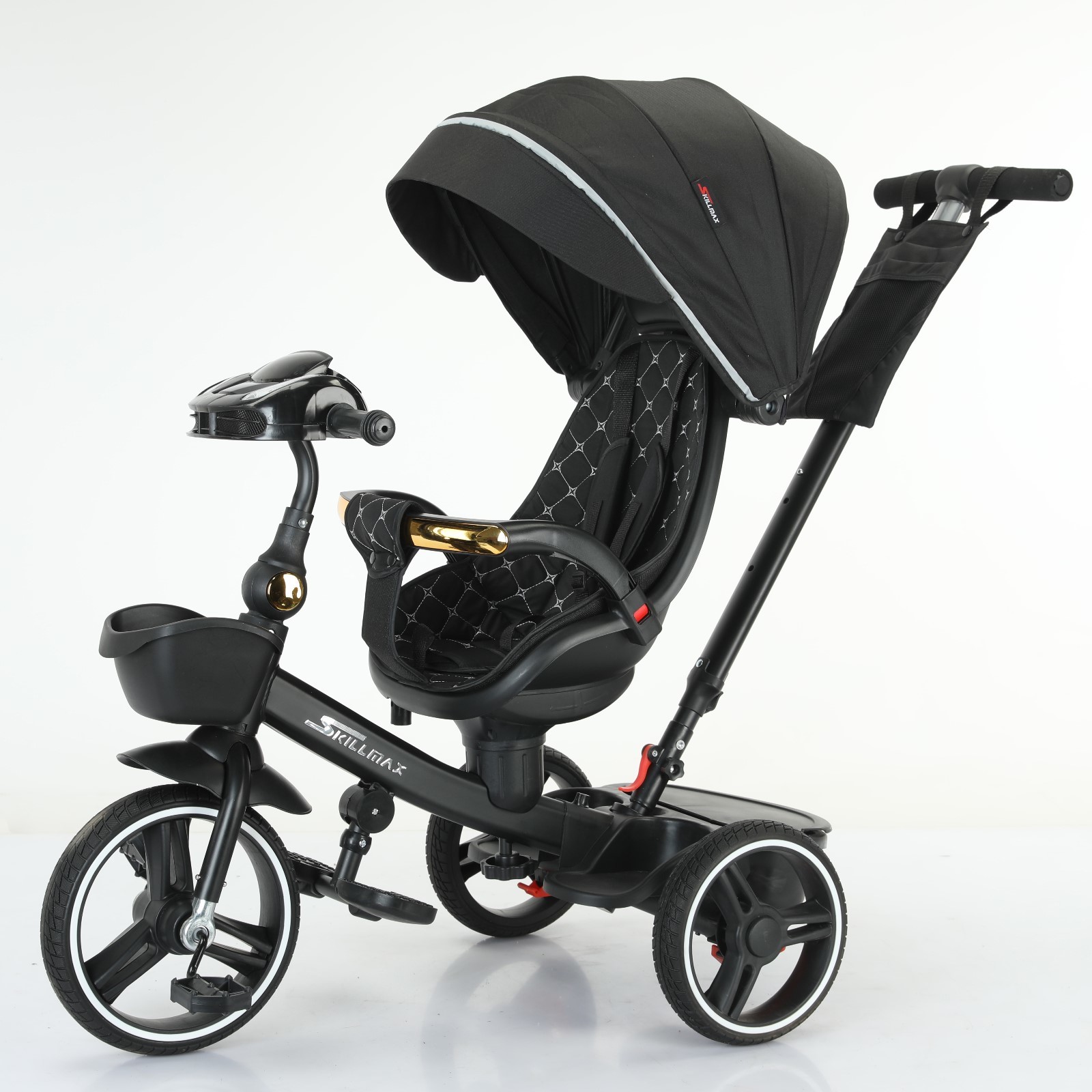 Велосипед детский трехколёсный skillmax t006, цвет чёрный. Велосипед трёхколёсный с ручкой детский очень удобный в эксплуатации для родителей и понравиться ребёнку. Все элементы съёмные, ребёнок может кататься просто на трёхколёсном велосипеде. Сиденье регулируется дальше-ближе, разворачивается «лицом к маме» или «лицом к миру». Широкое сиденье с мягкими накладками и удобной спинкой. Спинка фиксируется в трёх положениях, опускается в положение лёжа. Благодаря складному рулю и съёмной подставке для ног, ребёнка можно удобно разместить во время отдыха (две подножки съёмные). Переднее колесо с функцией свободного хода педали (педали отключаются). Тормоз задних колес для безопасной стоянки. Фары горят с батарейками (необходимо приобрести дополнительно). Съёмная двойная родительская ручка с мягкими накладками изменяется по высоте 3 положениях. Вместительная багажная корзина для хранения игрушек. Удлинённый капюшон для защиты от ветра и солнца. Особенности Можно использовать от 8-10 месяцев, когда малыш уверенно сидитПодойдёт в качестве первого велосипеда, с которым малыш научиться крутить педалиФункция разворота сидения к маме (поворот 180 градусов)Музыкальное сопровождениеТрёхточечные ремни безопасностиСкладная подножка для самых маленькихБлокировка педалейСъемные капор, бампер и ручка Цвет: Чёрный Для кого: Для девочки Для кого: Для мальчика Максимально допустимый вес, кг: 25 Материал рамы: Металл Складная рама: Нет Материал колёс: EVA Надувные колеса: Нет Ручка для родителей: Да Регулируемая спинка: Нет Тент: Да Страховочный обод: Да Доп. подставка для ног: Нет Свободный ход педалей: Да Рекомендуемый возраст, лет: 1 Рекомендуемый рост, см: 70 - 110 Стояночный тормоз: Да Фара: Да Разворот сиденья: Да Складная подножка: Да Светозвуковая панель: Да  развернуть описание ▼