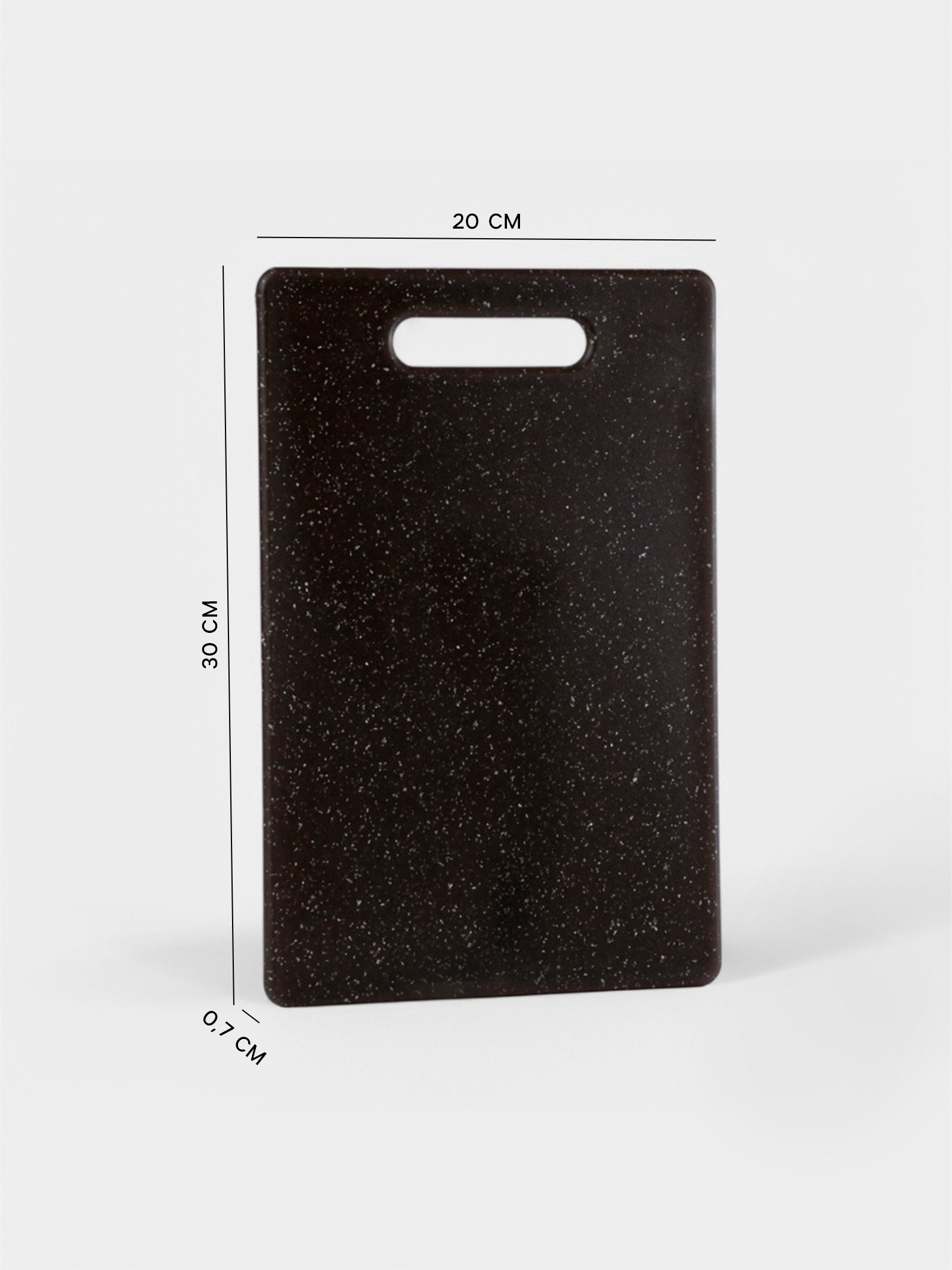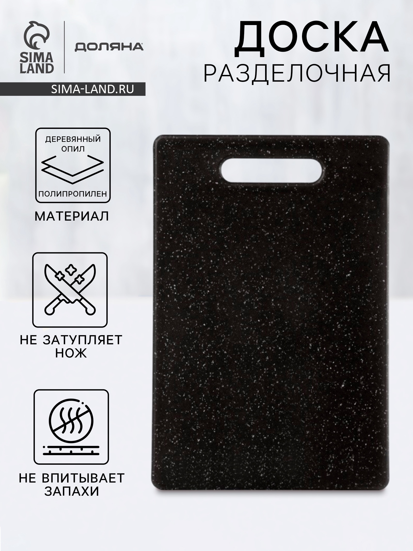 Доска разделочная доляна «морбио», пластик pp, 30 20 0.7 см, чёрная. Элегантный холст для кулинарного вдохновения, созданный с заботой о природе Представьте: на этой черной доске, выполненной из прочного пластика PP с добавлением экологичного древесного опила, как по волшебству, рождаются изысканные блюда. Использование древесного опила позволяет не только уменьшить количество пластика, но и гарантирует, что ни одно дерево не пострадало в процессе производства. Размер 30x20 см предоставляет достаточно места для комфортной работы, а толщина 0.7 см делает ее легкой и удобной в использовании. Преимущества, которые вы оцените: Экологичный материал: В составе – древесный опил, полученный без вреда для деревьев, что делает доску более экологичной.Стильный дизайн: Черный цвет и рисунок придают доске элегантный вид.Прочный материал: Пластик PP устойчив к царапинам и не впитывает запахи.Удобный размер: Подходит для нарезки любых продуктов.Легкость в уходе: Доску легко мыть вручную.Прекрасный подарок: Станет отличным подарком для любого кулинара, заботящегося об окружающей среде.Набор:Нет|Цвет:Чёрный|Длина, см:30|Ширина, см:20|Рисунок:Да|Материал:Пластик|Толщина, см:0.7|Тип нанесения рисунка:Прямая печать|Можно мыть в посудомоечной машине:Нет|Особенности:Без особенностей|Страна:Китай  развернуть описание ▼