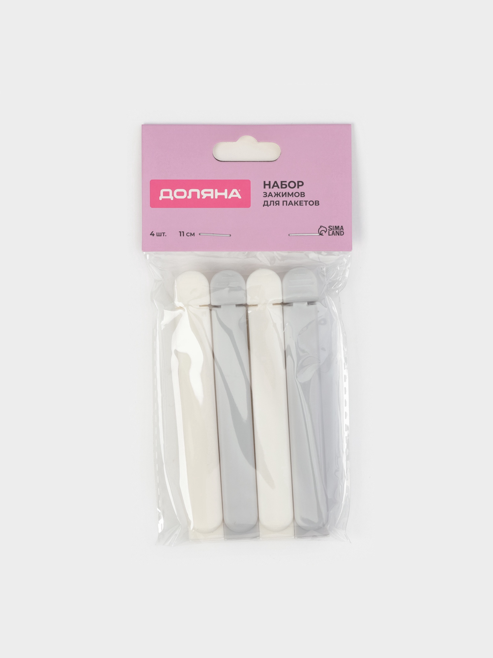 Зажимы для пакетов доляна, пластик, 11 6 1 см, набор 4 шт., белые/серые. Зажимы для пакетов, которые помогут вам поддерживать порядок на кухне и в быту. В наборе вы получите 4 зажима, выполненных в элегантных белом и сером цветах, которые легко впишутся в любой интерьер. Изготовленные из прочного пластика, они обеспечивают надежное закрытие пакетов, предотвращая попадание воздуха и влаги. Эффективное хранение: зажимы надежно фиксируют пакеты, сохраняя свежесть продуктов и предотвращая их порчу.Удобство использования: легкие и простые в применении, зажимы позволяют быстро закрывать пакеты одной рукой.Стильный дизайн: нейтральные цвета делают зажимы универсальными и подходящими для любого стиля кухни.Многофункциональность: идеально подходят не только для продуктов, но и для хранения мелочей, документов и других предметов.Экономия пространства: компактный размер зажимов позволяет удобно хранить их в ящике или на полке.Выбор зажимов для пакетов — это шаг к более организованному и аккуратному пространству. Не упустите возможность сделать свою кухню более функциональной и стильной! Цвет:Белый|Цвет:Серый|В наборе, шт.:4|Материал:Пластик|Страна:Китай  развернуть описание ▼