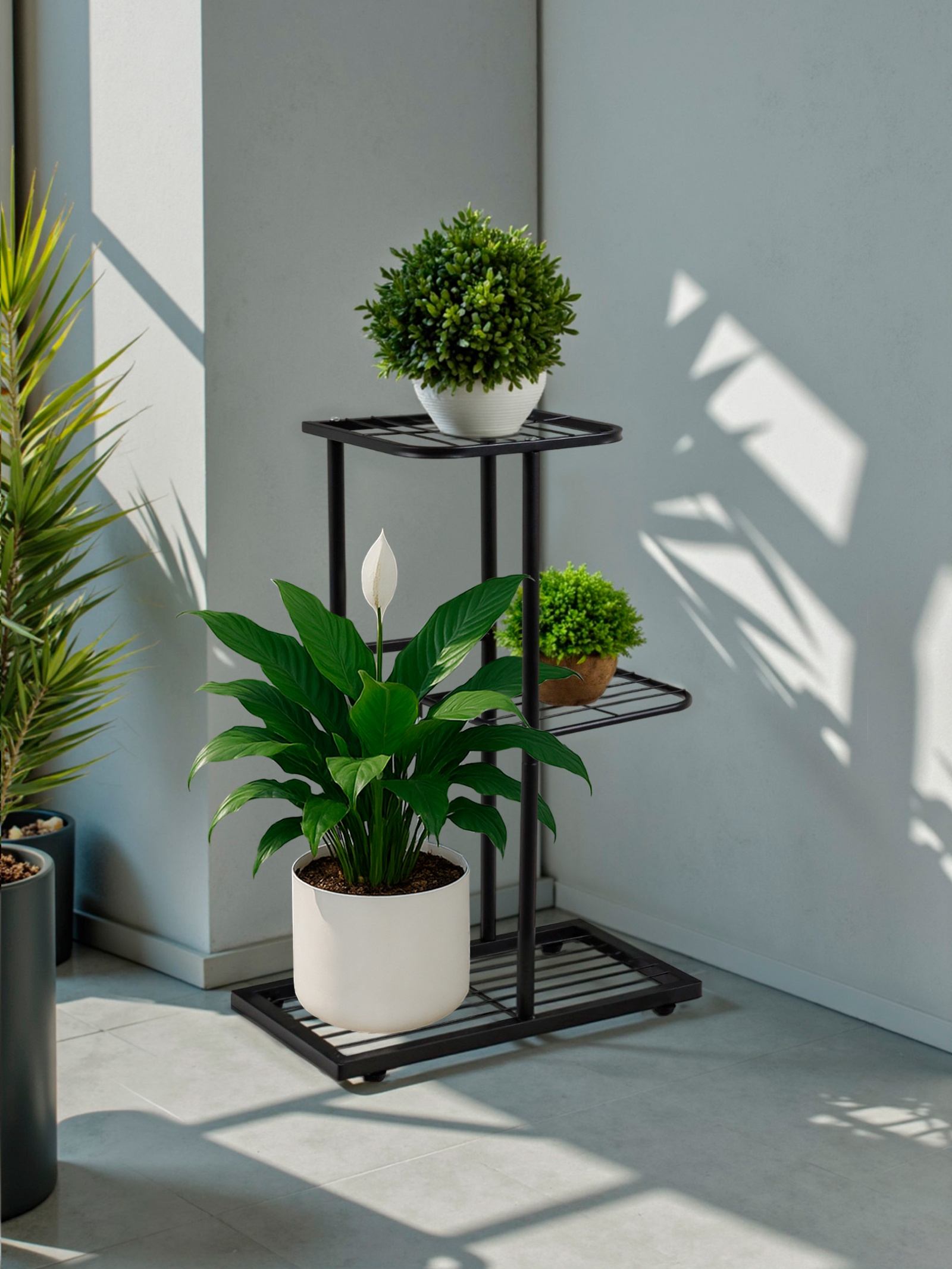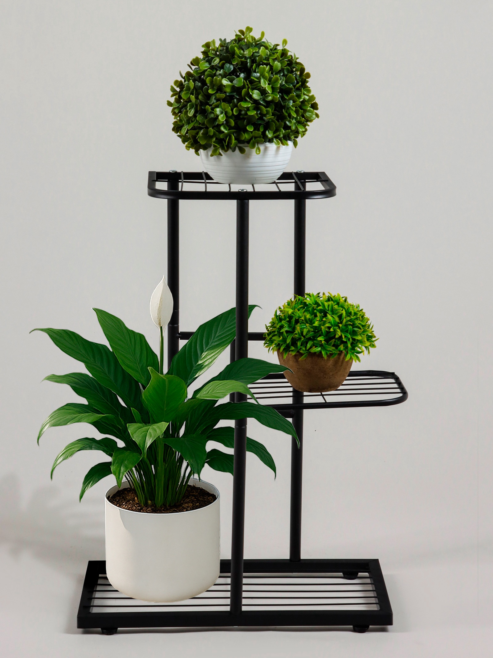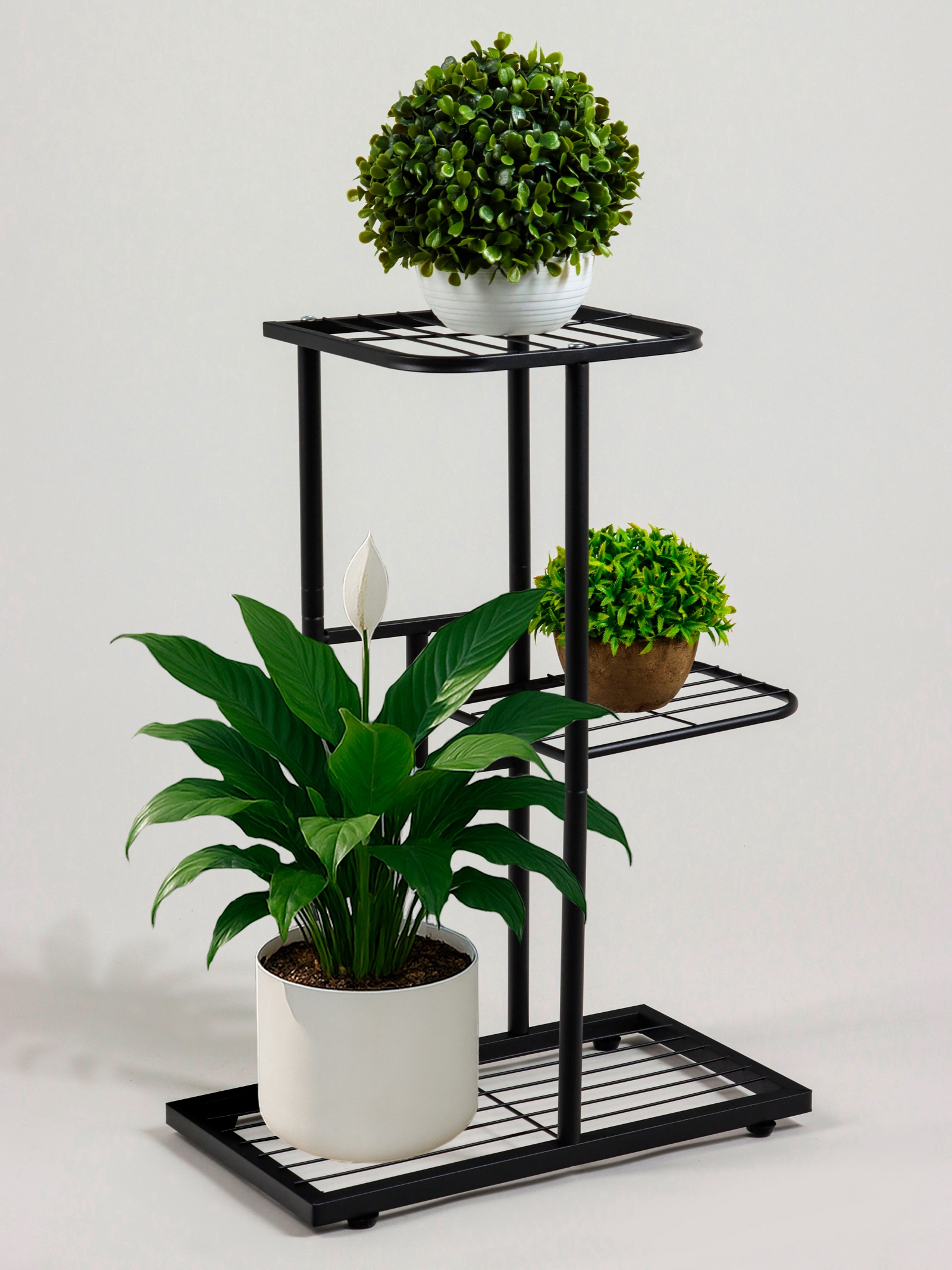Подставка для цветов greengo, 3 полки, 43 22 57 см, напольная, металл, чёрная. Напольная подставка для цветов с тремя полками станет стильным и функциональным дополнением интерьера. Её лаконичный дизайн и чёрный оттенок гармонично впишутся в современное пространство, подчеркнув эстетику комнаты или офиса. Устойчивая металлическая конструкция обеспечивает надёжность и долговечность, а три уровня полок позволяют эффектно разместить растения, книги или декоративные элементы. Особенности Прочная металлическая основа, устойчивая к нагрузкам.Три полки для размещения цветов или других предметов.Компактные размеры — подходит даже для небольших помещений.Чёрное покрытие, устойчивое к царапинам и выгоранию.На полках из металлической трубки не скапливается пыль и влага.На этом стеллаже можно компактно разместить много растений.Растения на этой этажерке получают максимальное количество солнечного света.Практичность и стиль Эта подставка сочетает в себе элегантность и функциональность. Её универсальный дизайн подойдёт для гостиной, спальни, балкона или офиса, а прочная конструкция выдерживает даже крупные растения в горшках. Чёрный цвет добавляет интерьеру лёгкий акцент, не перегружая пространство. Идеальный выбор для тех, кто ценит гармонию стиля и удобства. Цвет:Чёрный|Вид установки:Напольное|Материал:Металл|Страна:Китай  развернуть описание ▼