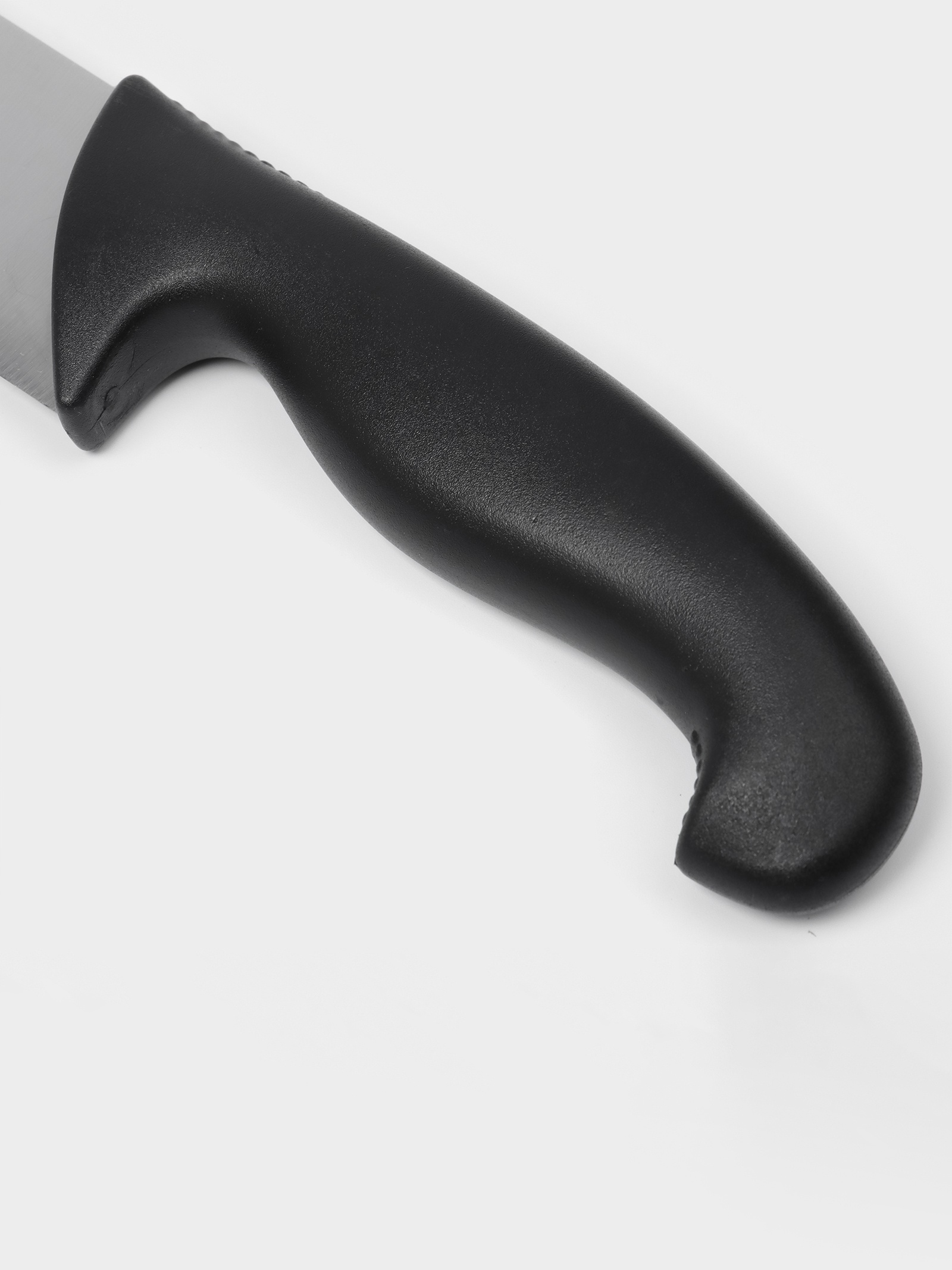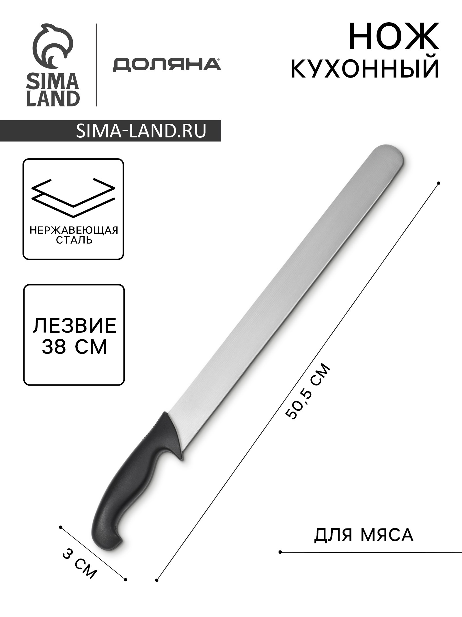 Нож кухонный для донер-кебаба sharp, лезвие 38 см, нержавеющая сталь, чёрная ручка. Профессиональный нож для донер-кебаба "Sharp": Быстрая и точная нарезка мяса! Нож "Sharp"имеет лезвие длиной 38 см, что обеспечивает легкий доступ к мясу на вертеле. Лезвие из нержавеющей стали отличается высокой прочностью и остротой, а эргономичная черная ручка обеспечивает удобный и надежный захват для комфортной работы даже в течение длительного времени. Особенности Экстра-длинное лезвие: для эффективной нарезки мяса на вертеле. Высококачественная нержавеющая сталь: обеспечивает остроту и долговечность. Эргономичная ручка: удобный и надежный захват. Профессиональное качество: предназначен для интенсивного использования. Легкость в уходе: легко очищается и дезинфицируется. Оптимизируйте процесс приготовления донер-кебаба! Этот нож – ваш секрет для быстрой, точной и безопасной нарезки мяса, что позволит вам создавать вкусные и аппетитные блюда, которые понравятся вашим клиентам. Цвет: Чёрный Длина лезвия, см: 38 Материал ручки: Пластик Тип покрытия: Без покрытия Материал лезвия: Нержавеющая сталь Тип ножа: Для мяса  развернуть описание ▼