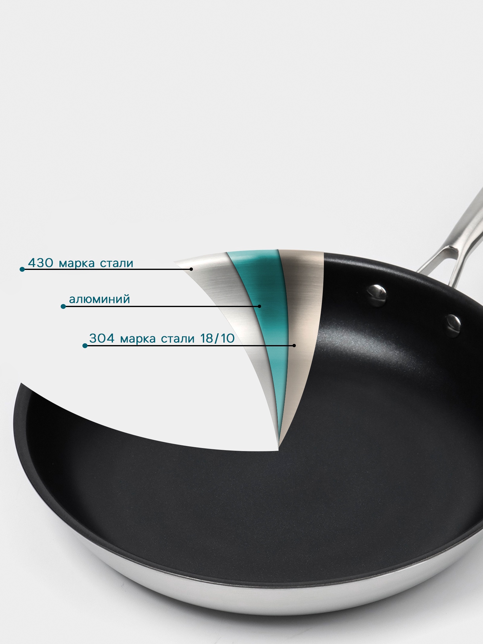 Сковорода 3ply Hanna Kn Vell, D=28 см, H=5.5 см, толщина 2.2 мм, индукция, антипригарное покрытие, нержавеющая сталь