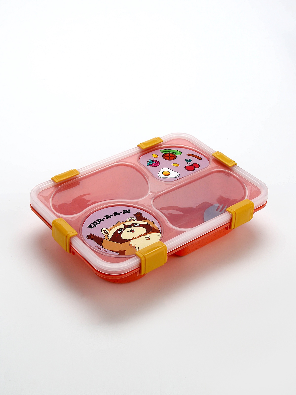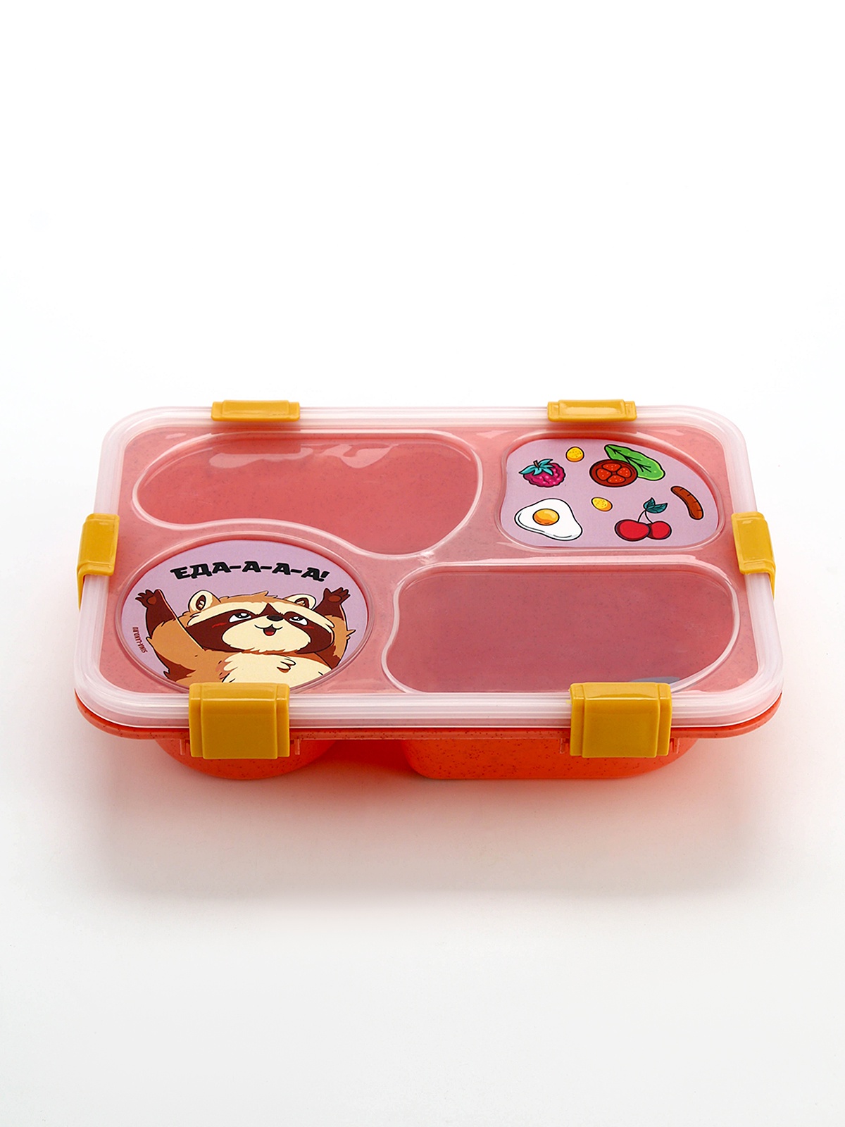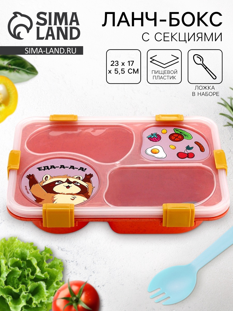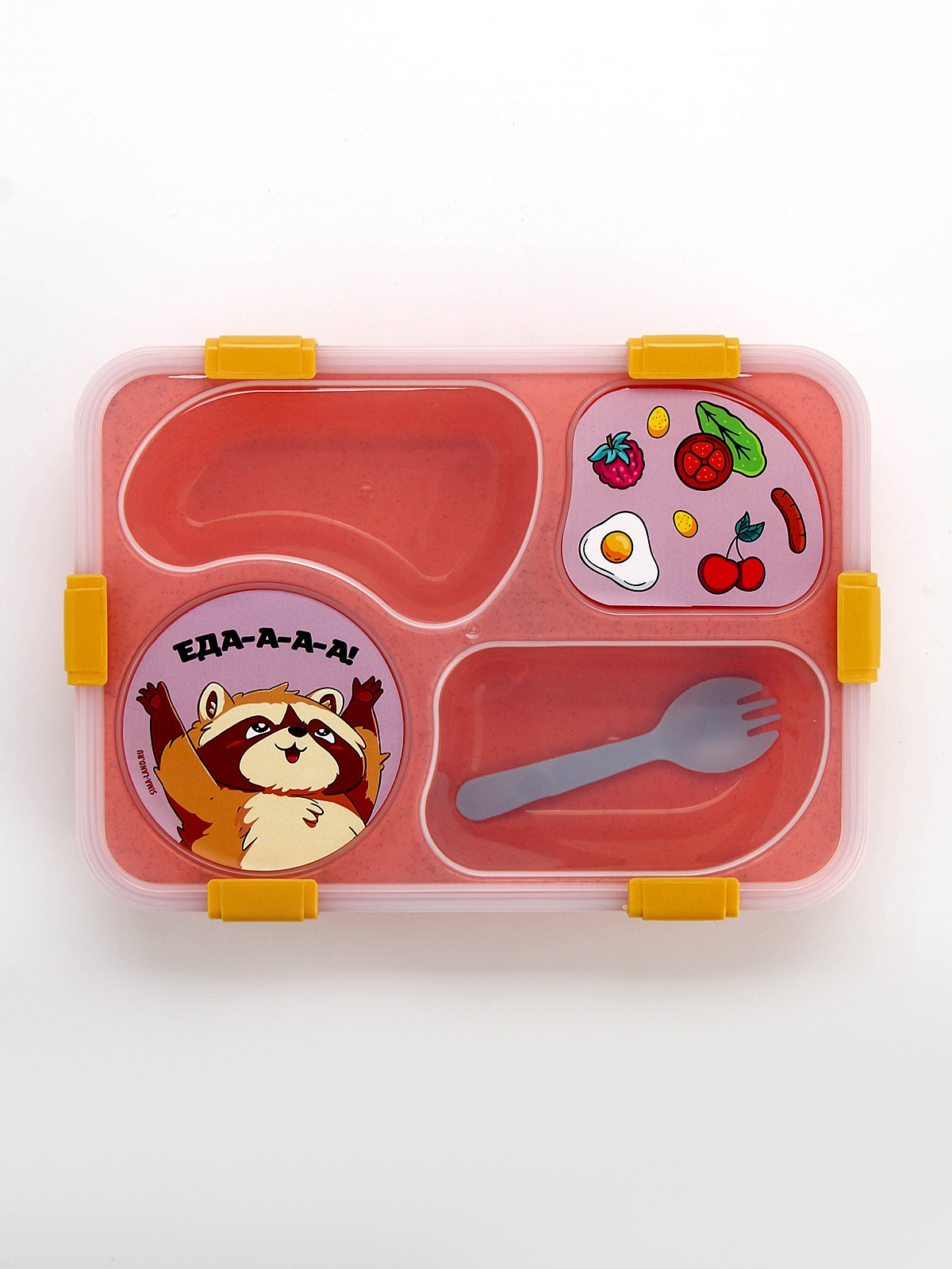Ланч - бокс с 4 секциями «еда!», 23 х 17 х 5,5 см, розовый. Набор:Да|Цвет:Красный|В наборе, шт.:2|Рисунок:Да|Материал:Пластик|Герметичная крышка:Да|Наличие столовых приборов:Да|Можно мыть в посудомоечной машине:Да|Можно использовать в СВЧ-печи:Да|Цвет крышки:Прозрачный|Особенности :С защёлкой|Особенности :Герметичный|Особенности :С ячейками|Особенности :С приборами|Страна:Китай  развернуть описание ▼