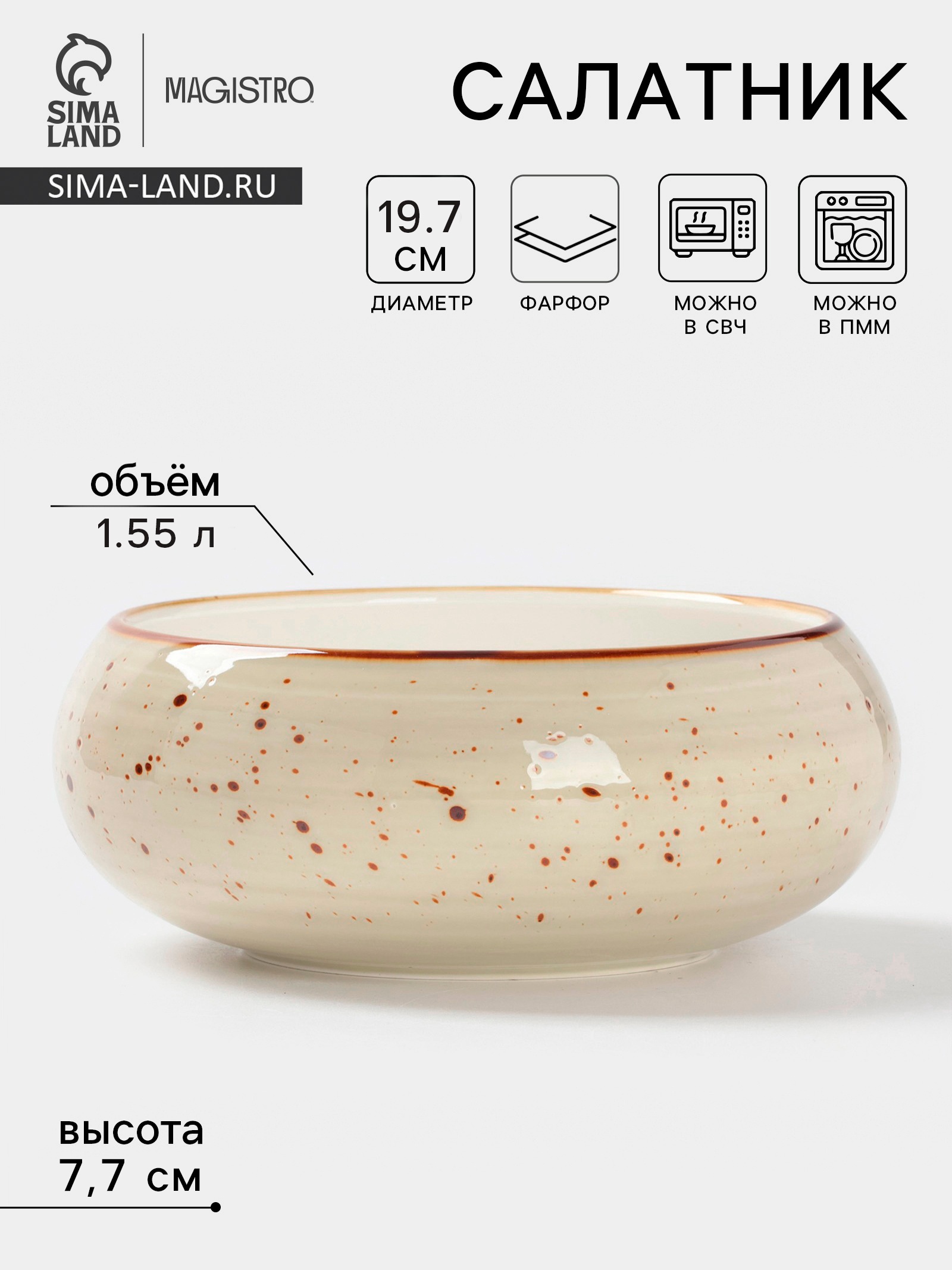 Салатник Magistro Mediterana, 1.55 л, D=19.7 см, фарфор, бежевый