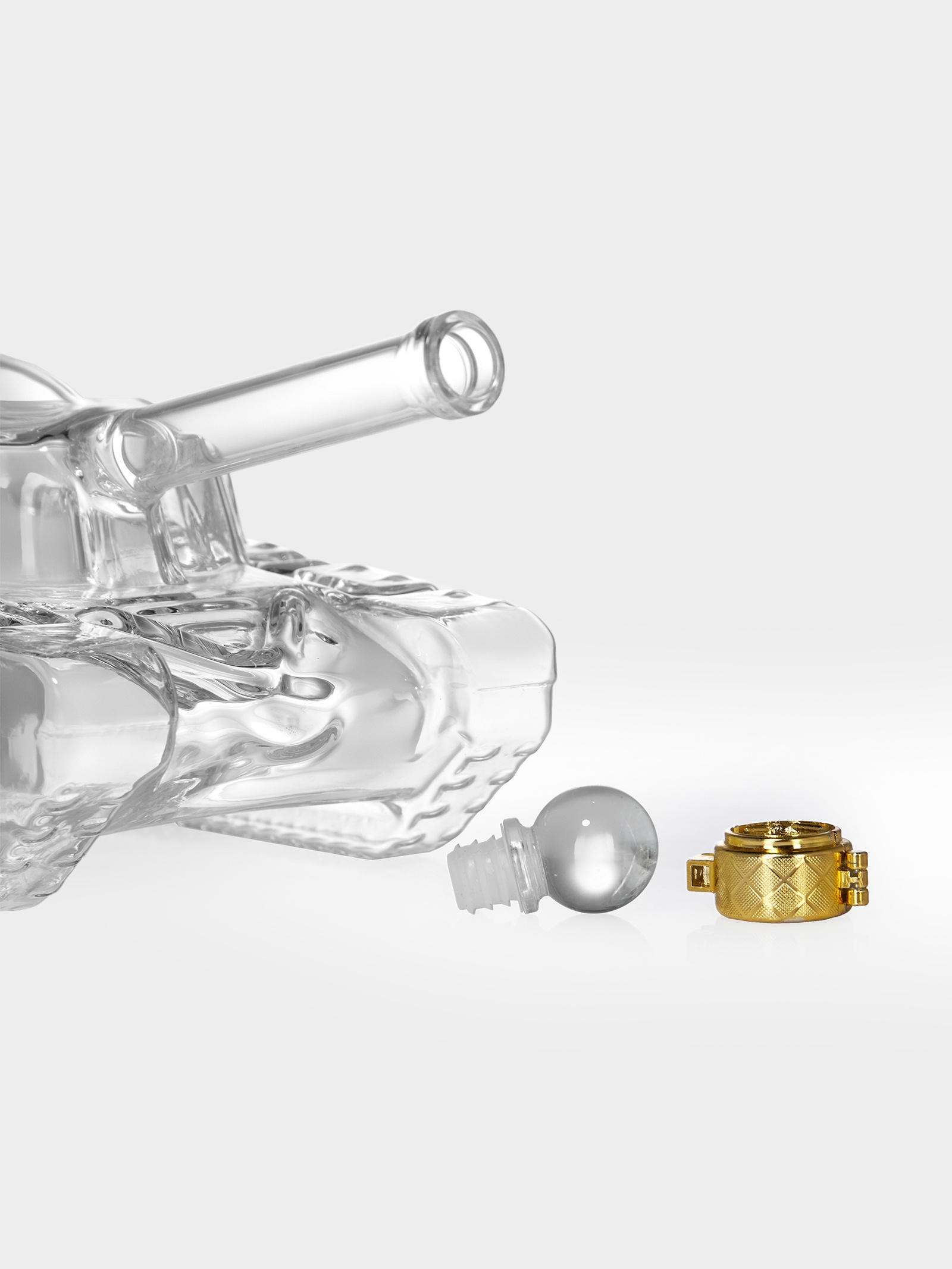 Стеклянный штоф 1 литр с крышкой — функциональная ёмкость для хранения и разлива жидкостей. Прозрачное стекло с рельефным корпусом и отсылка к танковым подразделениям в дизайне придают ему выразительность без излишеств.