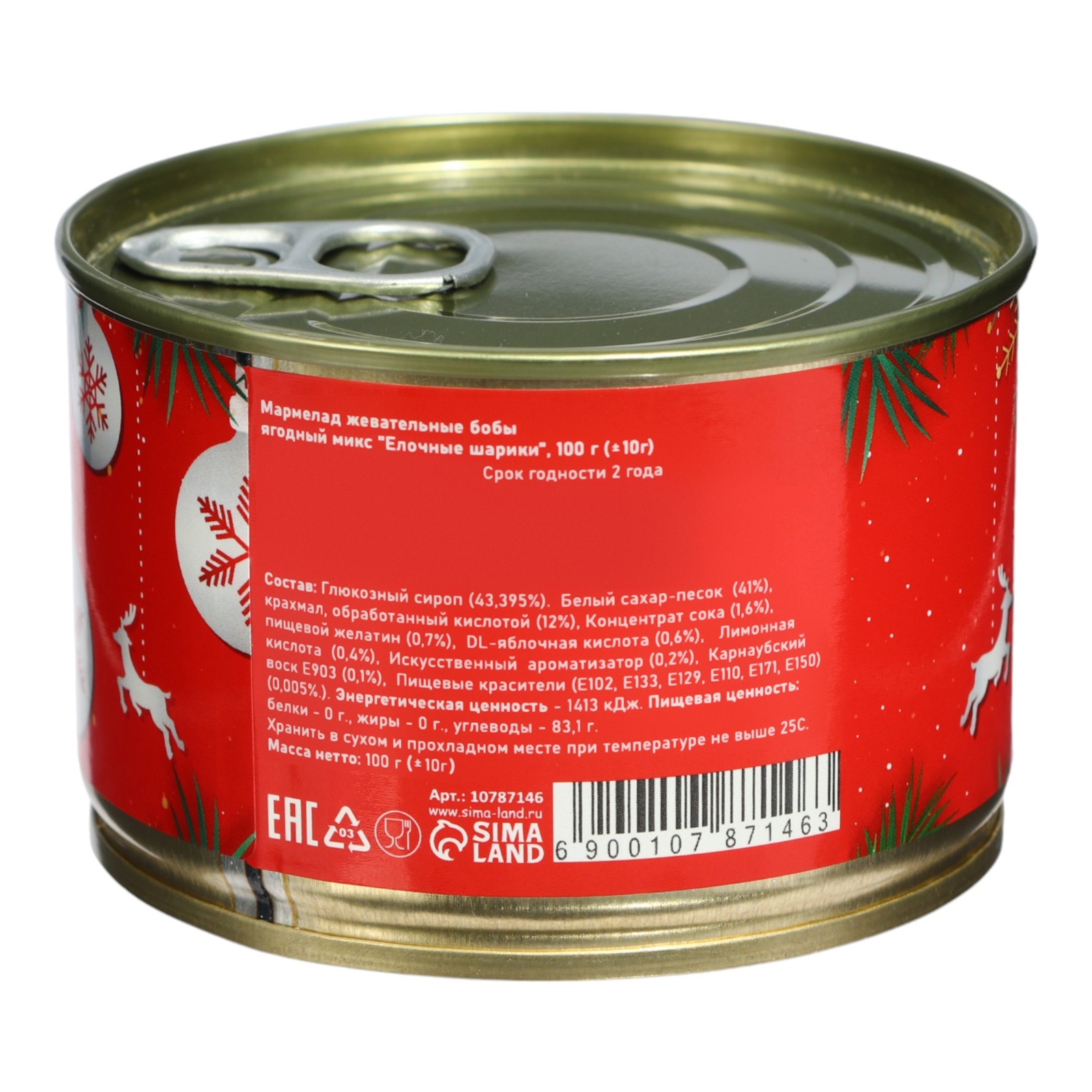 Мармелад бобы «с новым годом!», в консервной банке, 100 г. ПРИ ОФОРМЛЕНИИ ЗАКАЗА, ПРОСИМ ЗАПРАШИВАТЬ АКТУАЛЬНЫЕ СРОКИ ГОДНОСТИ У МЕНЕДЖЕРА Состав: сахар, патока крахмальная, желирующий агент: желатин, сок яблочный, регулятор кислотности: яблочная кислота, лимонная кислота; влагоудерживающий агент – сорбитовый сироп, глазирователь – карнаубский воск, аромаизаторы: клубника, апельсин, лимон; консервант – сорбиновая кислота, красители: понсо 4R, хинолиновый жёлтый, жёлтый «Солнечный закат» FCF. Содержит красители, которые могут оказывать отрицательное влияние на активность и внимание детей. Сдержит подсластитель. При чрезмерном употреблении может оказывать слабительное действие. Содержит консервант – диоксид серы. Вес нетто, г:100|Тематика:Новогодняя|Символ года:Нет|Тематика праздника:Рождество|Тематика праздника:Новый год|Вкус:Ягодный микс|Вид:Жевательный|Страна:Россия  развернуть описание ▼