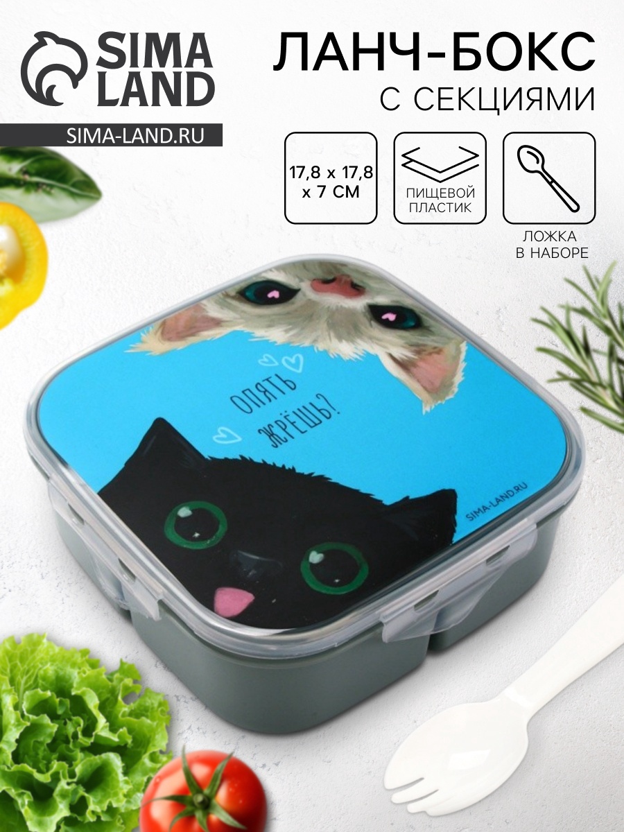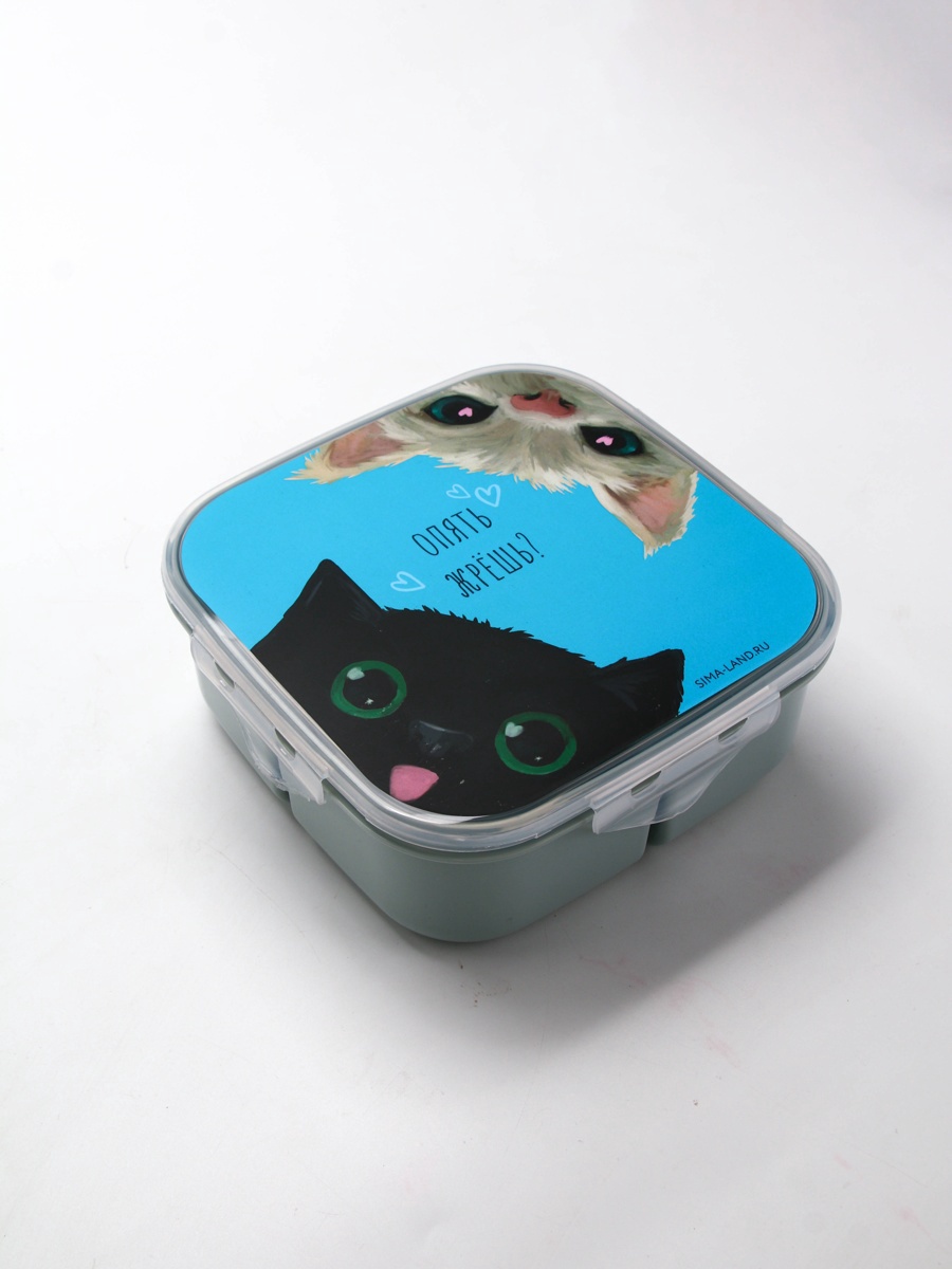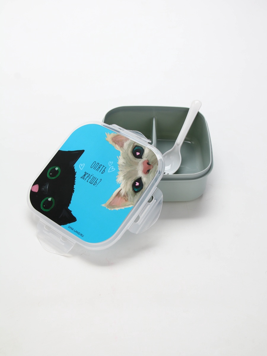 Ланч - бокс с секциями и ложкой «коты», 17.8 17.8 7 см. Ланч-бокс с секциями и ложкой — идеальный выбор для тех, кто ценит удобство и качество. Этот ланч-бокс состоит из нескольких секций, что позволяет разделить еду на порции и удобно хранить различные блюда. В комплекте идёт ложка, которая облегчает процесс приёма пищи. Преимущества ланч-бокса: Компактность и лёгкость: благодаря компактным размерам и небольшому весу, ланч-бокс легко помещается в сумку или рюкзак, не занимая много места.Многофункциональность: ланч-бокс разделён на несколько секций, что позволяет хранить разные виды еды отдельно друг от друга.Удобство использования: ложка, входящая в комплект, облегчает приём пищи, а также помогает избежать контакта рук с едой.Безопасность: ланч-бокс изготовлен из высококачественных материалов, которые не выделяют вредных веществ при контакте с пищей.Гигиеничность: ланч-бокс легко моется как вручную, так и в посудомоечной машине, что обеспечивает его чистоту и свежесть. Но использовать ланч-бокс в посудомоечной машине можно без крышки для сохранения безупречного вида товара.Не упустите возможность приобрести этот удобный и функциональный ланч-бокс для себя или в подарок своим близким! Набор:Да|Цвет:Серый|В наборе, шт.:2|Рисунок:Да|Материал:Пластик|Герметичная крышка:Да|Наличие столовых приборов:Да|Можно мыть в посудомоечной машине:Да|Можно использовать в СВЧ-печи:Да|Цвет крышки:Голубой|Особенности :С ячейками|Особенности :С приборами|Особенности :С защёлкой|Особенности :Герметичный|Страна:Китай  развернуть описание ▼