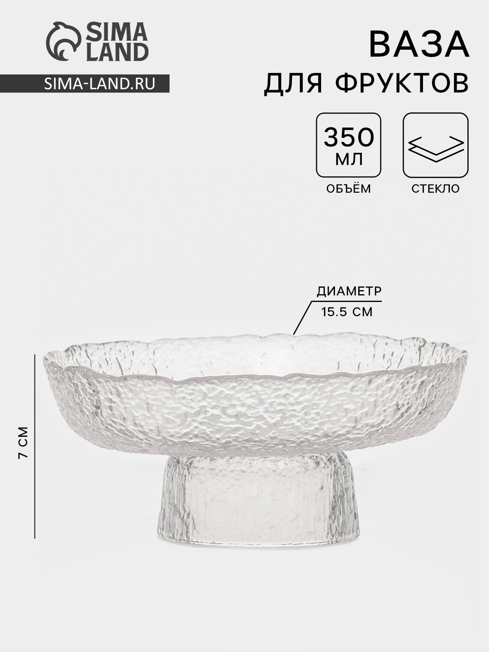 Ваза для фруктов «фрея», 350 мл, d=15.5. стекло, прозрачная. Идеальное сочетание функциональности и эстетики, которое сделает ваш интерьер еще более приятным и уютным. Ее диаметр 15. 5 см позволяет разместить разнообразные фрукты, создавая яркий акцент на столе. Изготовленная из прозрачного стекла, она привнесет легкость и элегантность в ваш дом. Рельефная текстура добавляет изысканности, делая вазу не только функциональной, но и декоративной. Преимущества: Идеальный размер: диаметр 15. 5 см для удобного размещения фруктов. Элегантный дизайн: прозрачное стекло и рельефная текстура для стильного оформления стола. Универсальность: круглая форма и отсутствие рисунка легко впишутся в любой интерьер. Практичность: легко моется вручную, сохраняя свой первоначальный вид. Функциональность и декор: сочетает в себе удобство использования и эстетическую привлекательность. Цвет: Прозрачный parts count: 0 Материал: Стекло Можно мыть в посудомоечной машине: Нет Текстура: С рельефом Форма: Круг  развернуть описание ▼