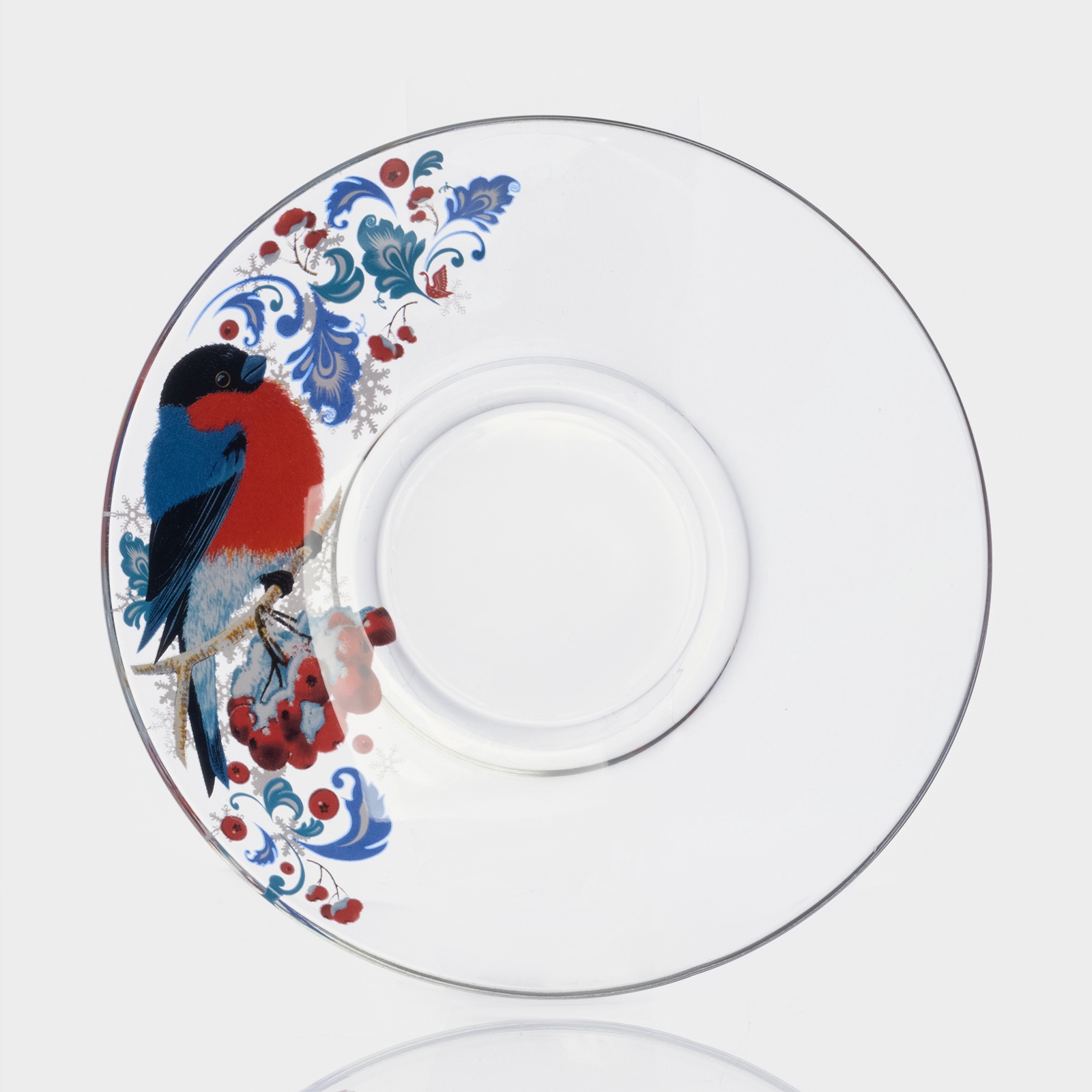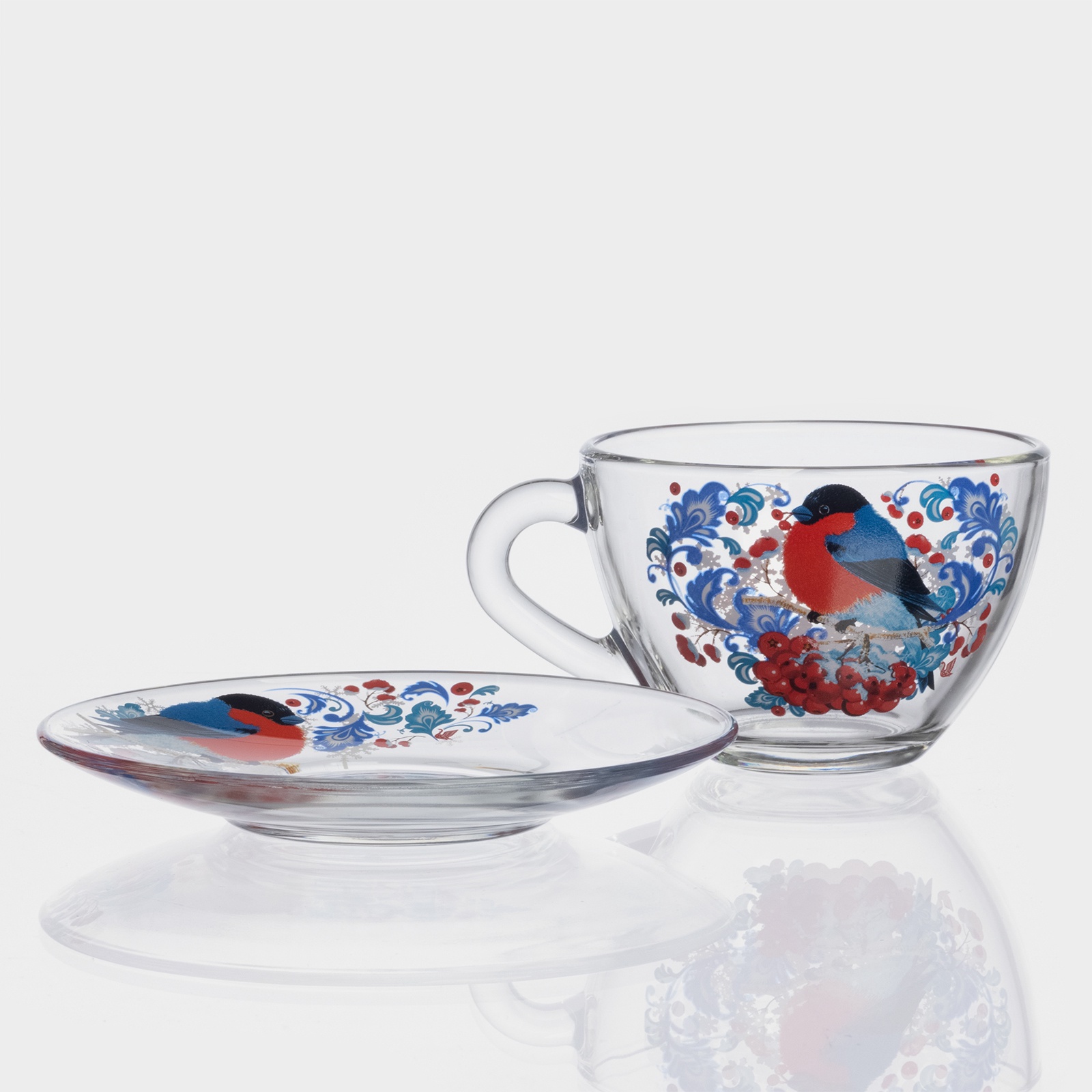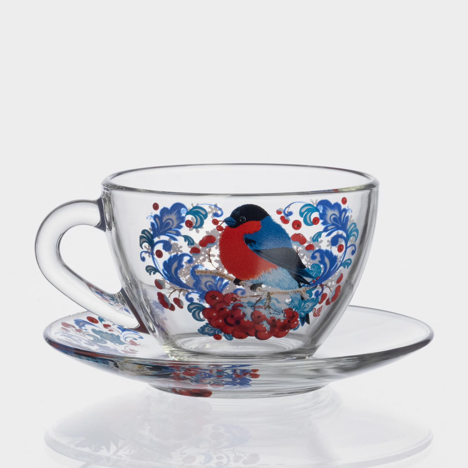 Чайная пара новогодняя стеклянная «снегири на рябине», 200 мл, блюдце D=13 см