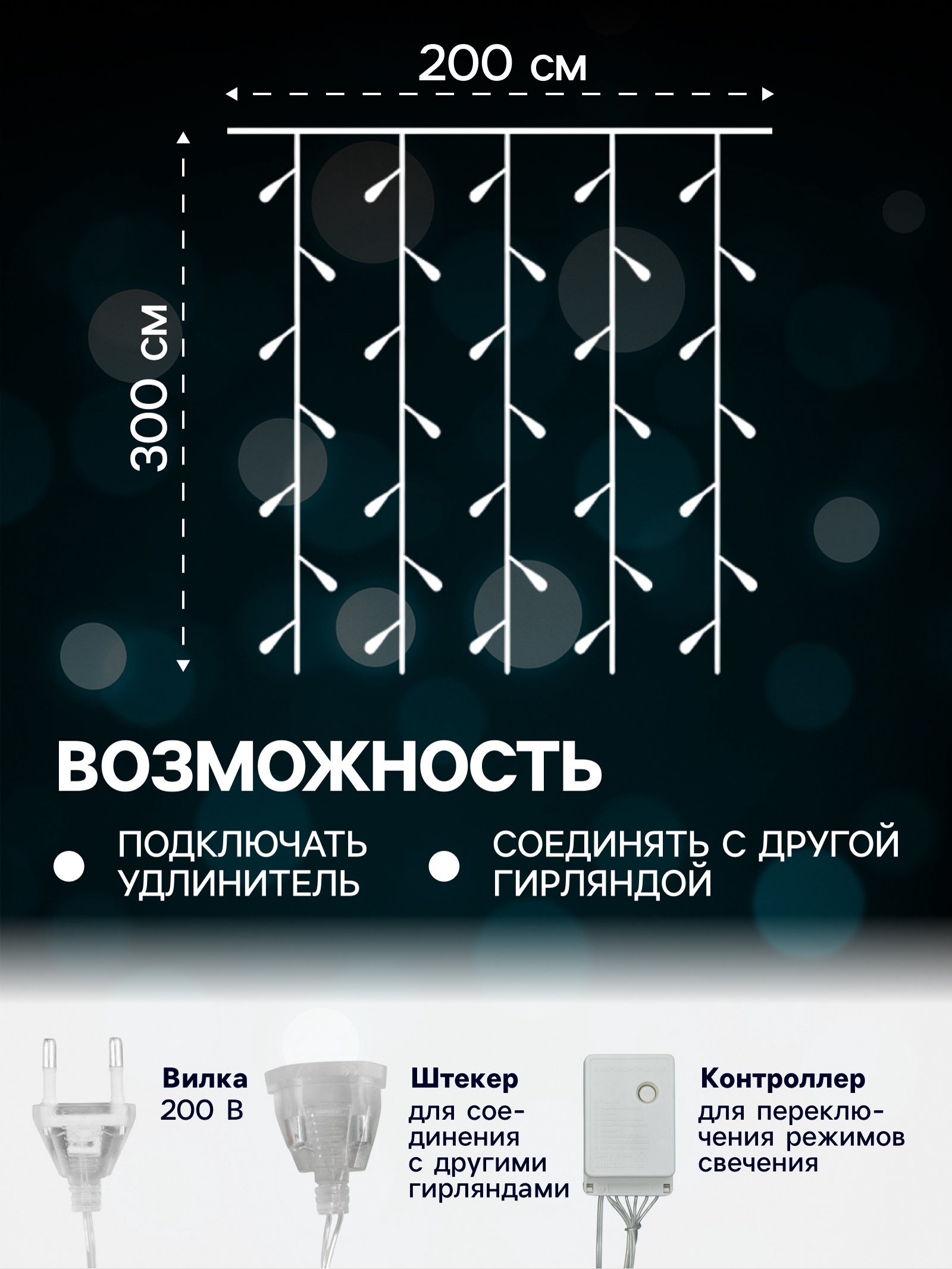 Гирлянда «занавес» 2 3 м, Ip20, прозрачная нить, 720 Led, свечение мульти, 8 режимов, 220 в