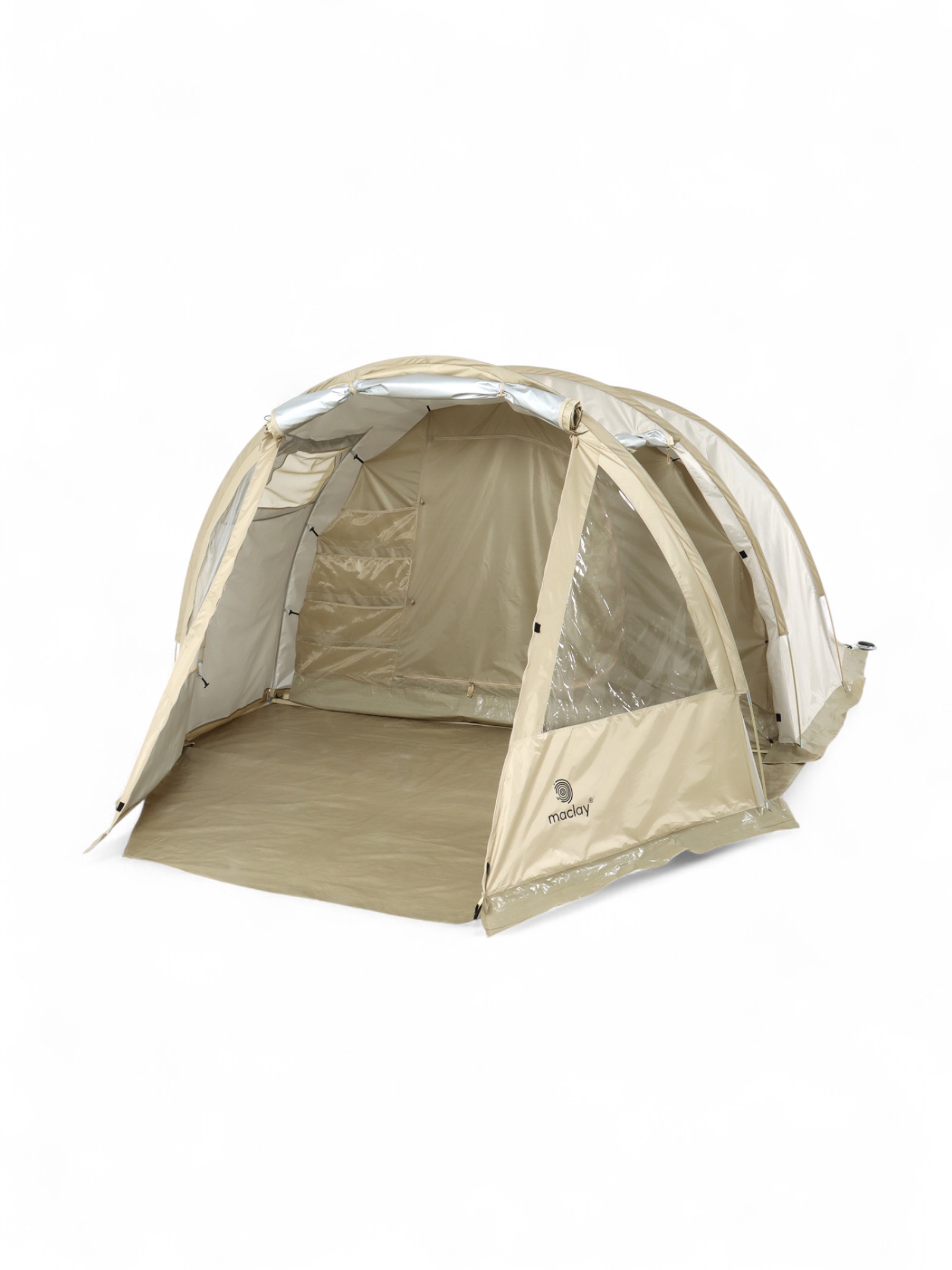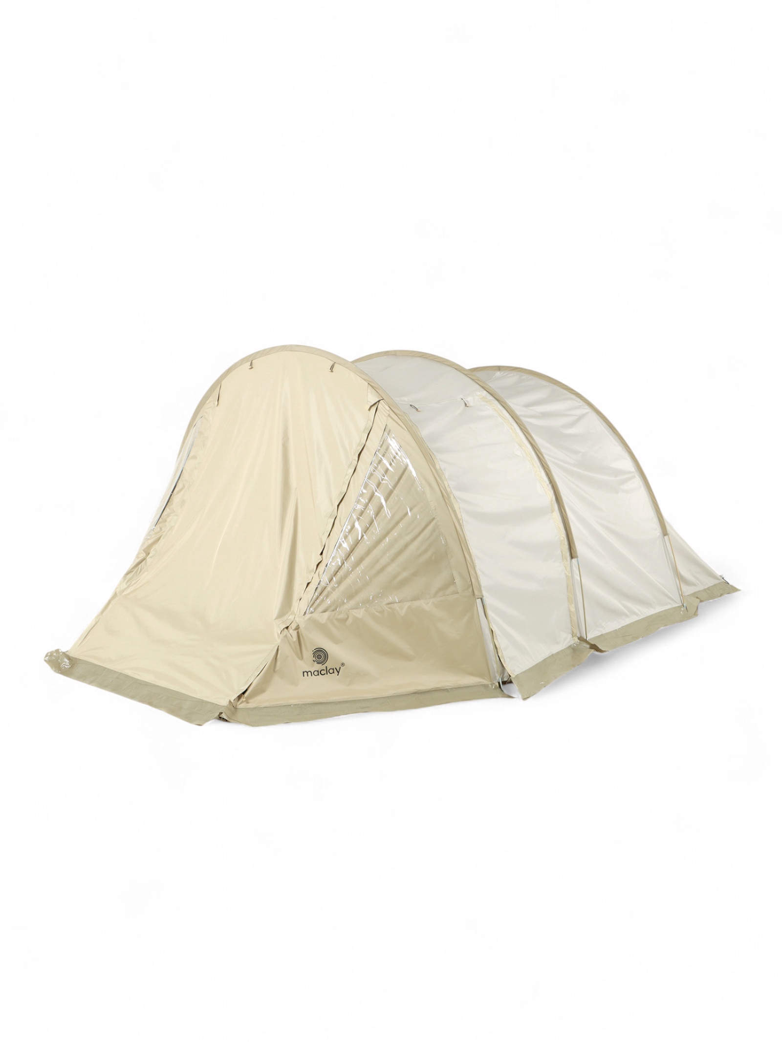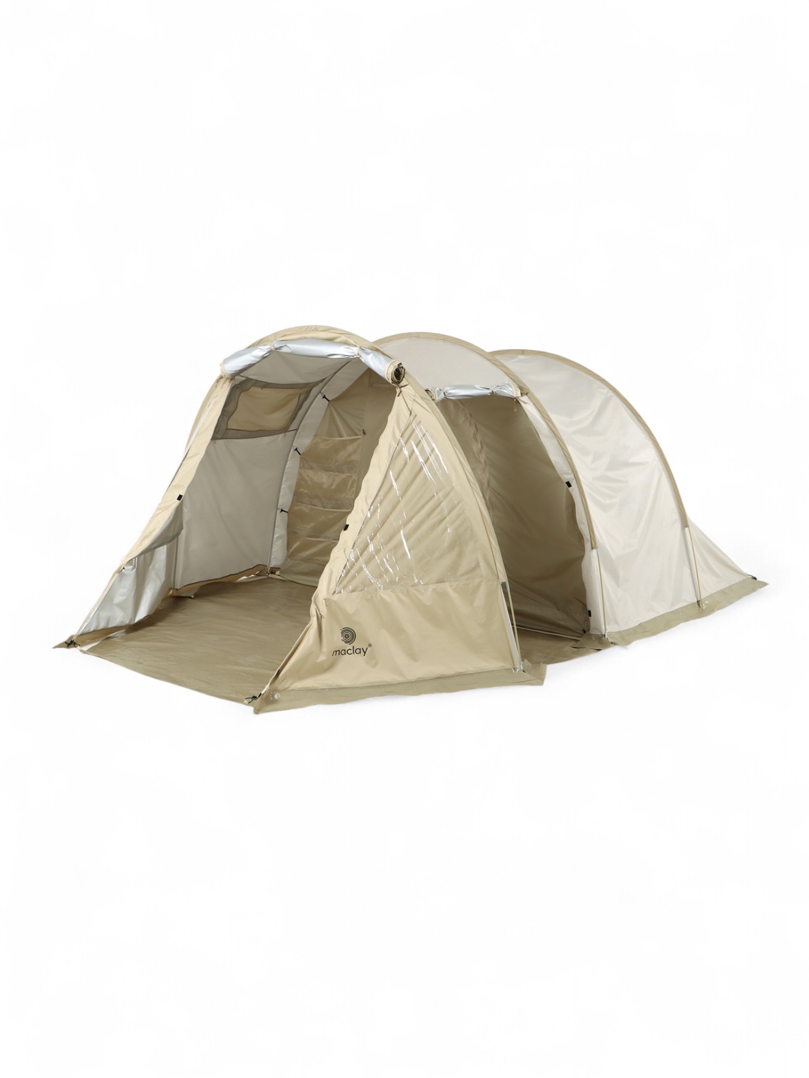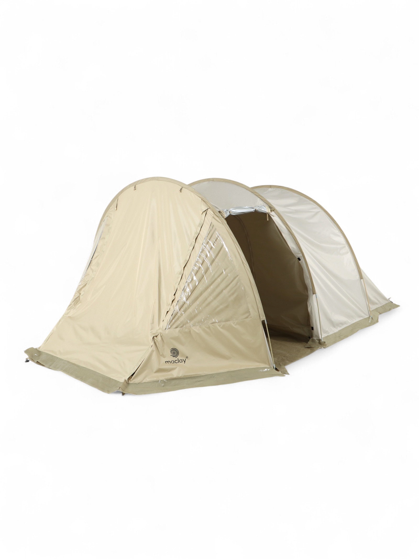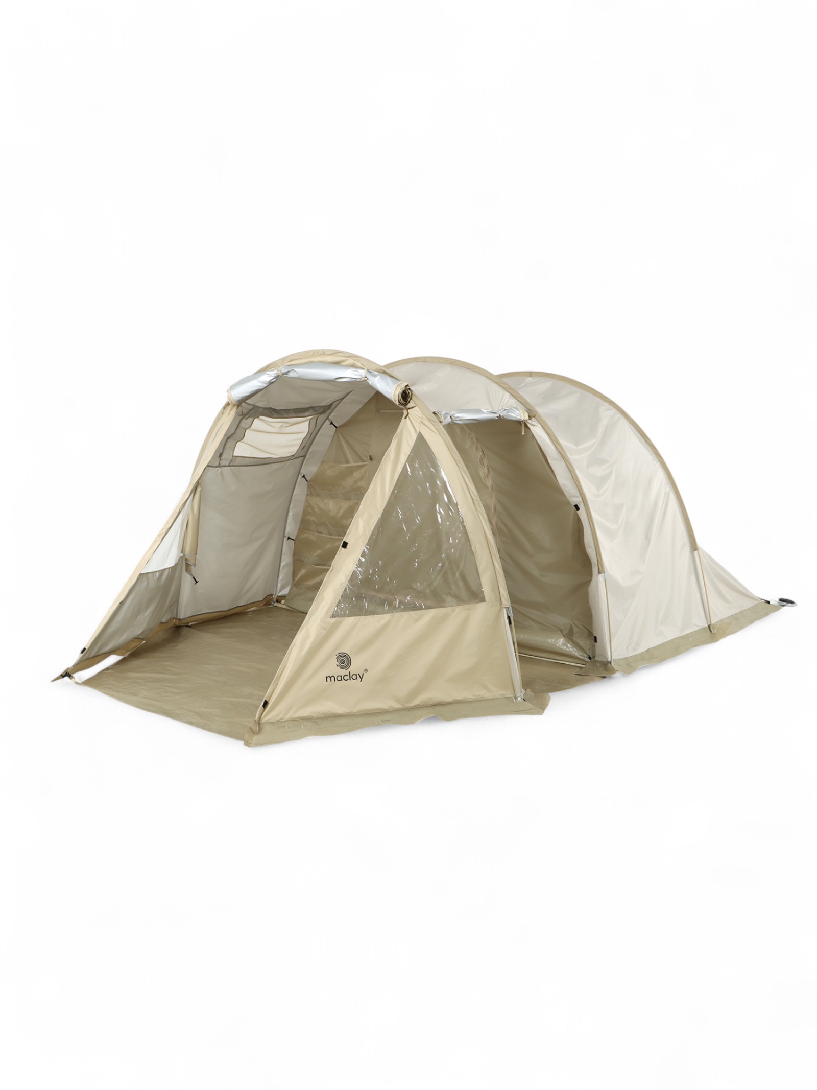 Палатка туристическая 3-местная maclay turgoyak cool 3, 380 210 170 см, кемпинговая, двухслойная, с тамбуром, бежевая. Кемпинговая влагоотталкивающая палатка turgoyak cool 3 разработана для комфортного размещения трёх человек. Перед входом в спальное отделение предусмотрен просторный тамбур для хранения личных вещей и укрытия от дождя. В комплектацию изделия входят стальные стойки для фиксации входной зоны в открытом положении. Преимущества Тент выполнен из прочного полиэстера с добавлением рипстопа, устойчивого к разрывам и растяжениям. На тент нанесено напыление СЕРЕБРО и огнестойкое покрытие.Пол палатки выполнен из армированного полиэстера и обладает высокой влагостойкостью.Палатка оснащена окнами из мягкого ПВХ повышенной прочности, что предотвращает появление заломов при хранении.В спальном отделении есть 2 кармана для личных вещей и подвес для фонарика или вентилятора.Для организации пространства в тамбуре предусмотрены карманы для мелочей.Москитные сетки на входе в спальное отделение и вентиляционных окнах.Все швы проклеены для предотвращения протечки тента.В комплект входит чехол с инструкцией по сборке для комфортного хранения и транспортировки изделия.Вместимость, чел.:3|Цвет:Бежевый|Количество слоёв:2|Количество входов:3|Влагозащита тента, мм водного столба:4000|Влагозащита дна, мм водного столба:10000|Материал каркаса:Фиберглас|Количество тамбуров палатки:1|Материал внешнего тента:Полиэстер + рипстоп|Конструкция палатки:Полубочка (тоннель)|Москитная сетка:Да|Назначение палатки:Кемпинговые|Установка:Ручная|Тип каркаса:Внешний|Сезон:Летняя|Страна:Китай  развернуть описание ▼