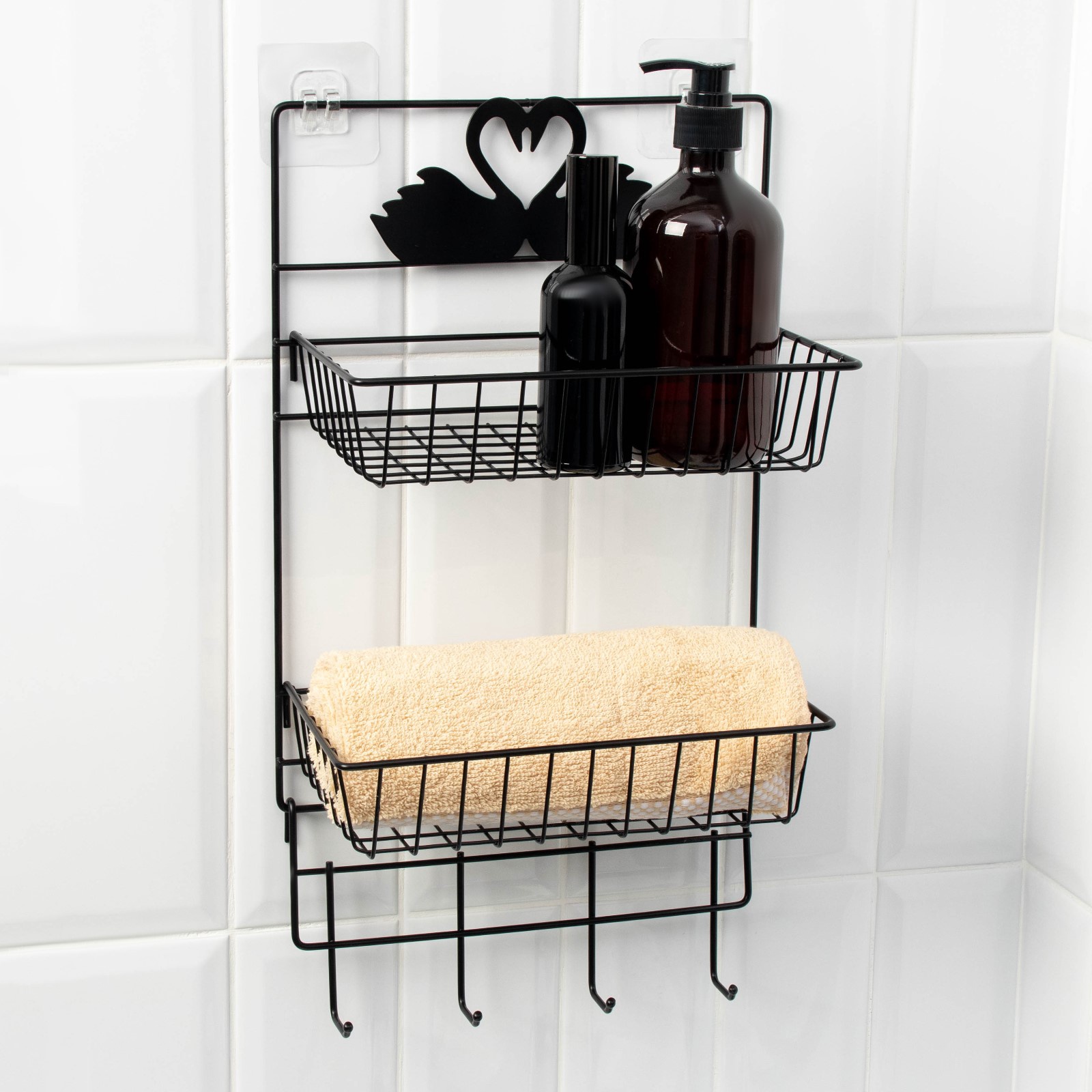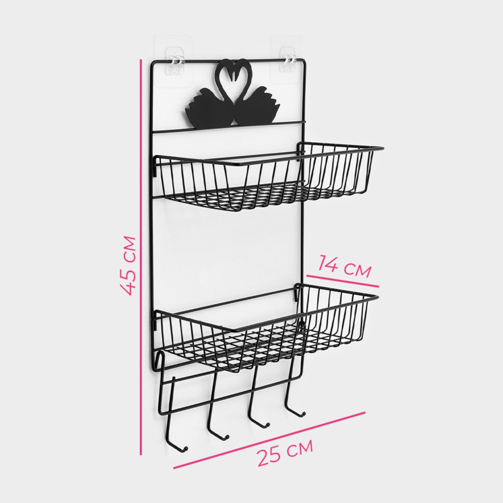 Полка для ванной доляна, двухъярусная, 4 крючка, 47 25 14 см, чёрная. Кто из нас не сталкивался с армиями шампуней и полчищами тюбиков, громоздящихся в ванной комнате на зеркале, на стиральной машине или где-то ещёx Согласитесь, что один вид такого беспорядка портит впечатление об уютном доме. Не лучше ли, когда все расположено чётко на своих местах, и глаза не разбегаются в поисках нужного бутылькаx Полка для ванной — готовое решение для тех, кто твёрдо решил стать хозяином положения в собственной квартире, и, наконец, разложить всё по полочкам. Она станет отличным хранилищем для: шампуней, гелей и прочих принадлежностей для ванной комнаты: специальные стенки не позволят скользкому тюбику или бутылёчку упасть или скатиться вниз;косметики и парфюма: элегантный дизайн полки подчёркивает женственность хозяйки;небольших детских игрушек для ванной: металлический корпус и прочное крепление не позволят малышу случайно сорвать или повредить полку.Каждый член семьи может занять собственную полку. Больше не будет никакой путаницы! Заказывайте полку сейчас и убедитесь сами, что порядок в ванной комнате — это легко и просто! Цвет:Чёрный|Форма:Прямоугольная|Ширина, см:25|Высота, см:45|Количество секций:2|Крышка:Нет|Материал:Металл|Угловая полка:Нет|Крепления входят в комплект:Да|Влагостойкость:Да|Вид крепления:Липучки|Поставляется в разобранном виде:Нет|Конструкция полки:Прямая|Страна:Китай  развернуть описание ▼