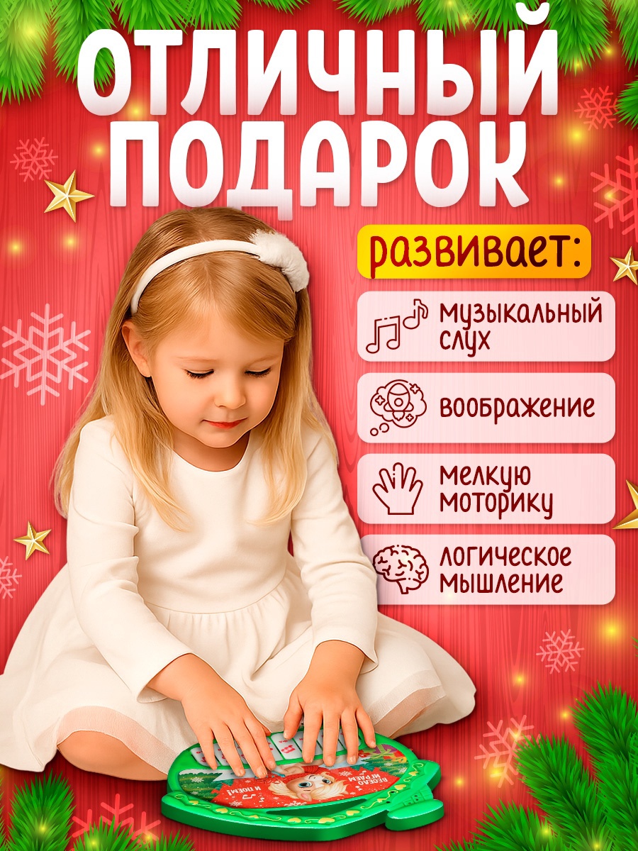 Пианино детское музыкальное «с новым годом лошади!», звук. Новогоднее волшебство в каждой ноте! Детское пианино «С Новым годом лошадки!» — это яркий музыкальный инструмент для малышей от 3 лет. Зелёное пластиковое пианино с символом 2026 года — лошадкой — подарит праздничное настроение и познакомит ребёнка с миром музыки. Особенности игрушки 8 клавиш и 16 новогодних песен: два режима игры — пианино и мелодии — развлекут малыша. Можно играть самостоятельно или слушать весёлые новогодние композиции.Яркий дизайн с символом года — лошадка на корпусе создаёт праздничную атмосферу. Пианино станет тематическим подарком на новогодние праздники.Прочный пластиковый корпус выдерживает активную игру. Для работы нужны 2 батарейки АА (не входят в комплект).Играем и развиваемся Пианино помогает развивать слух, чувство ритма и моторику пальцев. Ребёнок учится различать звуки, запоминает мелодии. Отличный подарок на Новый год для мальчиков и девочек — музыкальный, яркий и практичный. Цвет:Зелёный|Для кого:Унисекс|Возраст:От 3 лет|Количество батареек:2|Количество клавиш:8|Материал:Пластик|Дополнительные функции:Звуковые эффекты|Типоразмер батареек:AA (LR6)|Вид:Пианино|Батарейки в комплекте:Нет|Дополнительные функции:Музыкальные эффекты|Страна:Китай  развернуть описание ▼