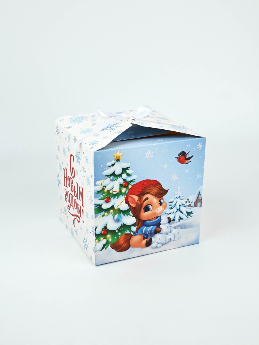Цвет:Голубой|Цвет:Белый|Форма:Куб|Плотность, г/м :250|Длина, см:18|Ширина, см:18|Высота, см:18|Тематика:Новогодняя|Символ года:Символ года 2026 (Лошадь)|Тематика праздника:Новый год|Материал:Картон|Вид:Складные коробки|Размер:Средний (18-24 см)|Окошко:Нет|Крышка-дно:Нет|Страна:Китай
