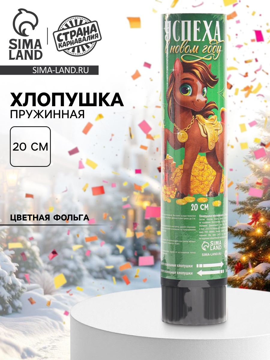 Хлопушка пружинная «с новым годом», богатства, 20 см. Набор:Нет|Длина, см:20|Символ года:Символ года 2026 (Лошадь)|Тематика праздника:Новый год|Материал:Бумага|Материал:Фольга|Материал:Металл|Материал:Пластик|Тематика хлопушки:Новый год|Вид хлопушки:Пружинная|Наполнение:Бумага|Наполнение:Фольга|Цвет наполнения:Разноцветный|Страна:Китай  развернуть описание ▼