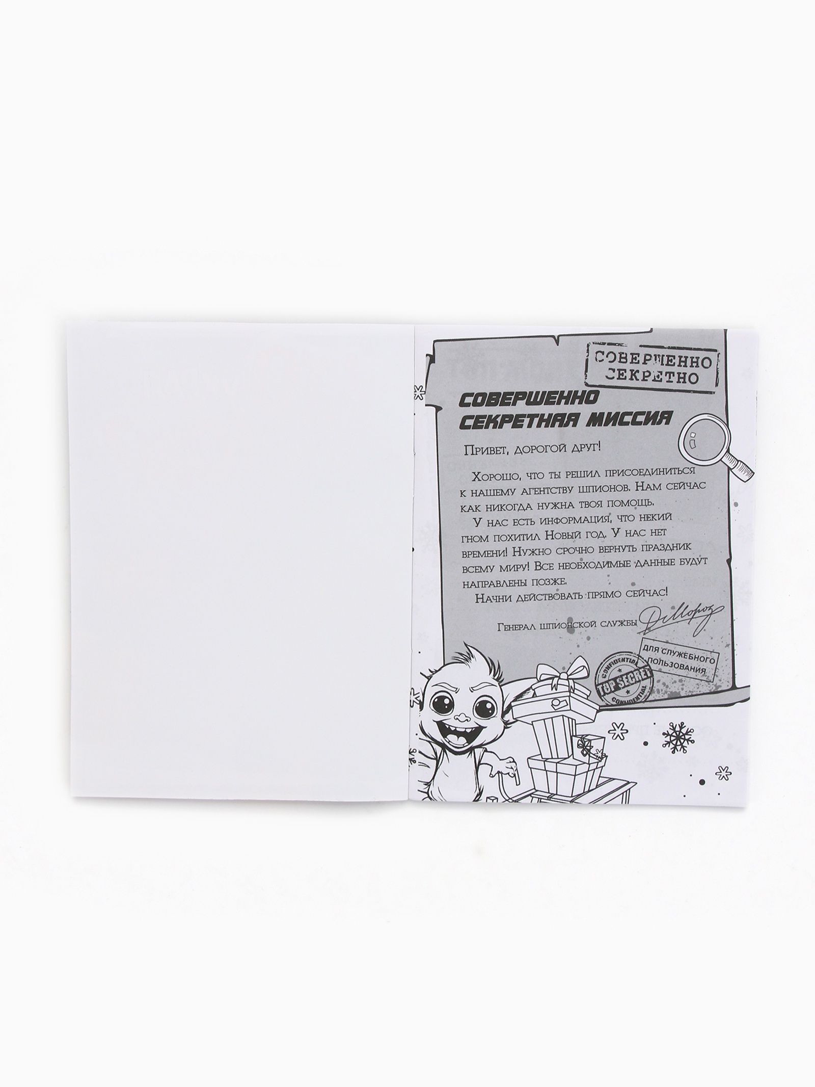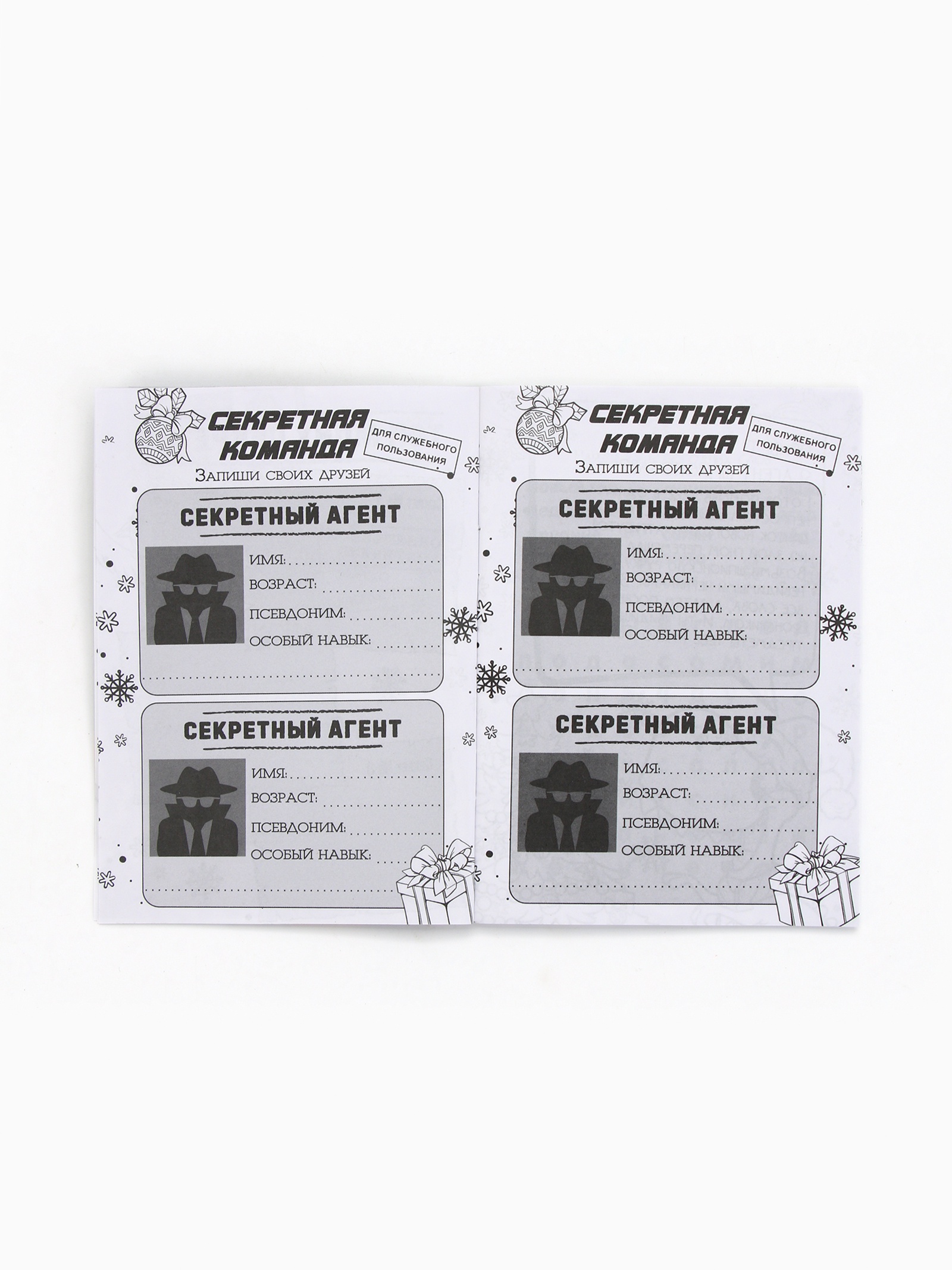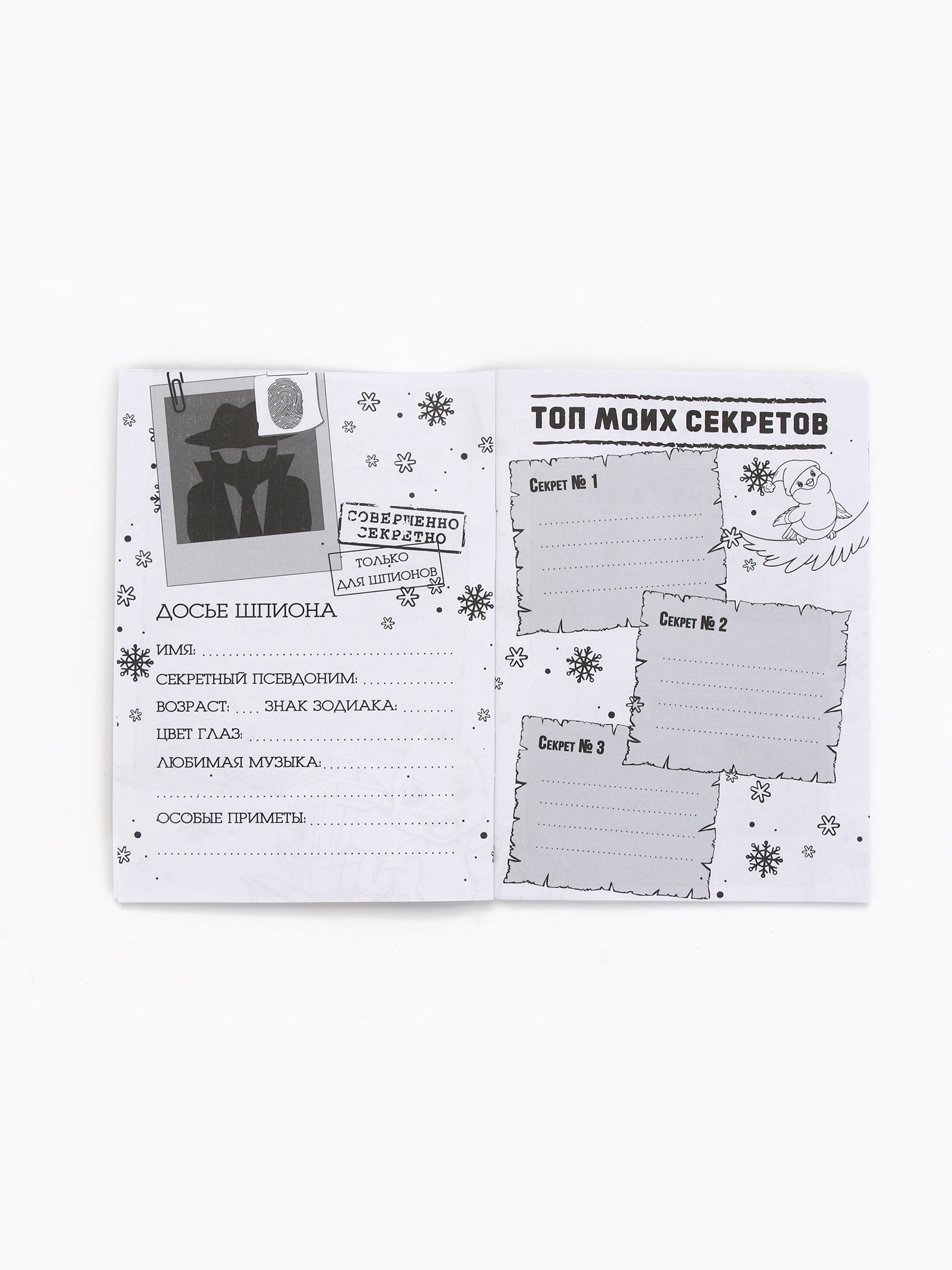 В наборе есть блокнот формата А6 на 16 листов для записи секретных дел, а также ручка, которая пишет особыми чернилами, видимыми только под ультрафиолетовым светом. С этим набором вы сможете хранить свои тайны, которые никто не сможет прочитать. В блокноте также есть шпионские задания: анкета и почётная грамота.