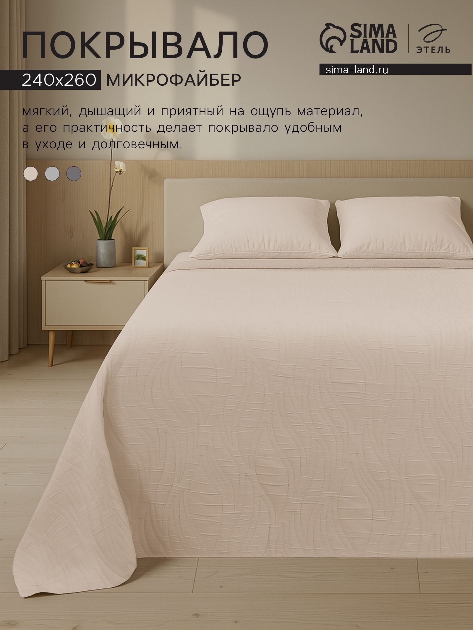 Покрывало «этель» gentle wave, 240 260 см, бежевое. Элегантное покрывало для кровати в бежевом цвете — идеальное решение для создания уюта и стиля в вашем интерьере. С размерами 240 260 см оно подходит для евромакси кроватей, обеспечивая полное покрытие и аккуратный вид. Изготовлено из высококачественного микрофибры, это покрывало не только привлекает внимание своим дизайном, но и дарит невероятный комфорт. Особенности Плотность материала 280 г/м обеспечивает отличную теплоизоляцию, создавая уют в любое время года.Однотонный бежевый цвет легко вписывается в любой интерьер, от классического до современного.Стильная отстрочка по краям придаёт покрывалу завершённый вид и увеличивает его прочность.Упаковка в PVC-сумку позволяет удобно хранить и транспортировать покрывало, защищая его от пыли и повреждений.Микрофибра: комфорт и практичность Материал, из которого изготовлено покрывало, — микрофибра, состоящая из полиэстера. Эта ткань отличается высокой прочностью и износостойкостью, что делает её идеальным выбором для повседневного использования. Микрофибра не только приятна на ощупь, но и обладает отличными дышащими свойствами, что способствует комфортному сну. Она легко очищается и быстро сохнет, что значительно упрощает уход за изделием. Кроме того, микрофибра устойчива к загрязнениям и не требует частой стирки. Уход за покрывалом Для поддержания покрытия в идеальном состоянии достаточно следовать простым рекомендациям: стирка при температуре 30 °C, глажка при 110 °C и барабанная сушка на низкой температуре. Это поможет сохранить его первоначальный вид и структуру. Не используйте отбеливатели, чтобы не повредить ткань. Создайте атмосферу уюта Это покрывало станет не только практичным элементом вашего интерьера, но и стильным акцентом в спальне. Нежный бежевый оттенок добавляет тепла и гармонии, создавая атмосферу спокойствия и уюта. Используйте его как самостоятельный элемент декора или в сочетании с другими текстильными изделиями, чтобы подчеркнуть индивидуальность вашего пространства. Цвет:Бежевый|Ткань:Микрофайбер|Плотность, г/м :280|Длина, см:260|Ширина, см:240|Размер:Евро|Тематика:Однотонная|Вид упаковки:PVC-сумка|Декоративные элементы:Отстрочка|Рекомендации по уходу:Стирка при 30 °С|Рекомендации по уходу:Глажка при 110 °С|Рекомендации по уходу:Барабанная сушка при низкой температуре|Рекомендации по уходу:Не отбеливать|Состав ткани:Полиэстер|Страна:Россия  развернуть описание ▼