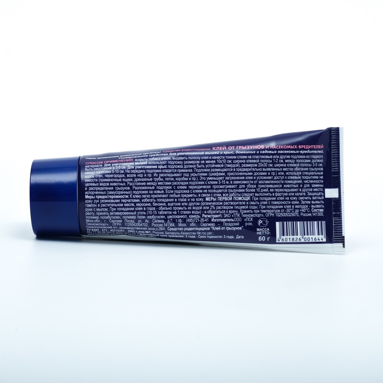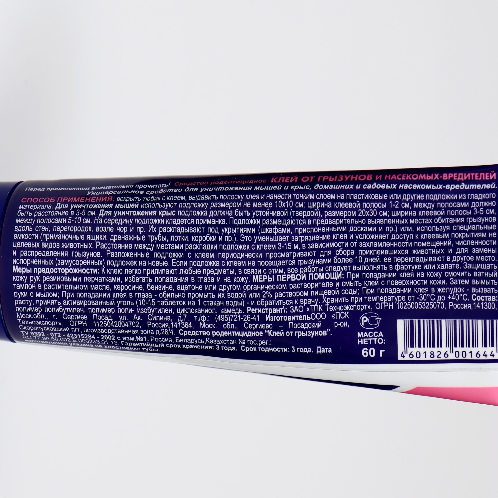 Клей от грызунов и насекомых чистый дом туба 60 г. Указания по применению: вскрыть тюбик с клеем, выдавить полоску клея и нанести тонким слоем на пластиковые или другие подложки из гладкого материала; для уничтожения мышей используют подложку размером не менее 10x10 см; ширина клеевой полосы 1-2 см, между полосами должно быть расстояние в 3-5 см. Для уничтожения крыс подложка должна быть устойчивой (твёрдой), размером 20x50 см; ширина клеевой полосы 5-5 см, между полосами 5-10 см; на середину подложки кладётся приманка. Подложки размещаются в предварительно выявленных местах обитания грызунов вдоль стен, перегородок, возле нор и пр. Их раскладывают под укрытиями (шкафами, прислоненными досками и пр. ) или, используя специальные ёмкости (приманочные ящики, дренажные трубы, лотки, коробки и пр. ). Это уменьшает загрязнение клея и усложняет доступ к клеевым покрытиям не целевых видов животных; расстояние между местами раскладки подложек с клеем 3-15 м, в зависимости от захламлённости помещений, численности и распределения грызунов; разложенные подложки с клеем периодически просматривают для сбора приклеившихся животных и для замены испорченных (замусоренных) подложек на новые. Если подложка с клеем не посещается грызунами более 10 дней, её перекладывают в другое место. Вес, г: 60 Область применения: От всех насекомых Область применения: От грызунов Вид средства: Клей  развернуть описание ▼