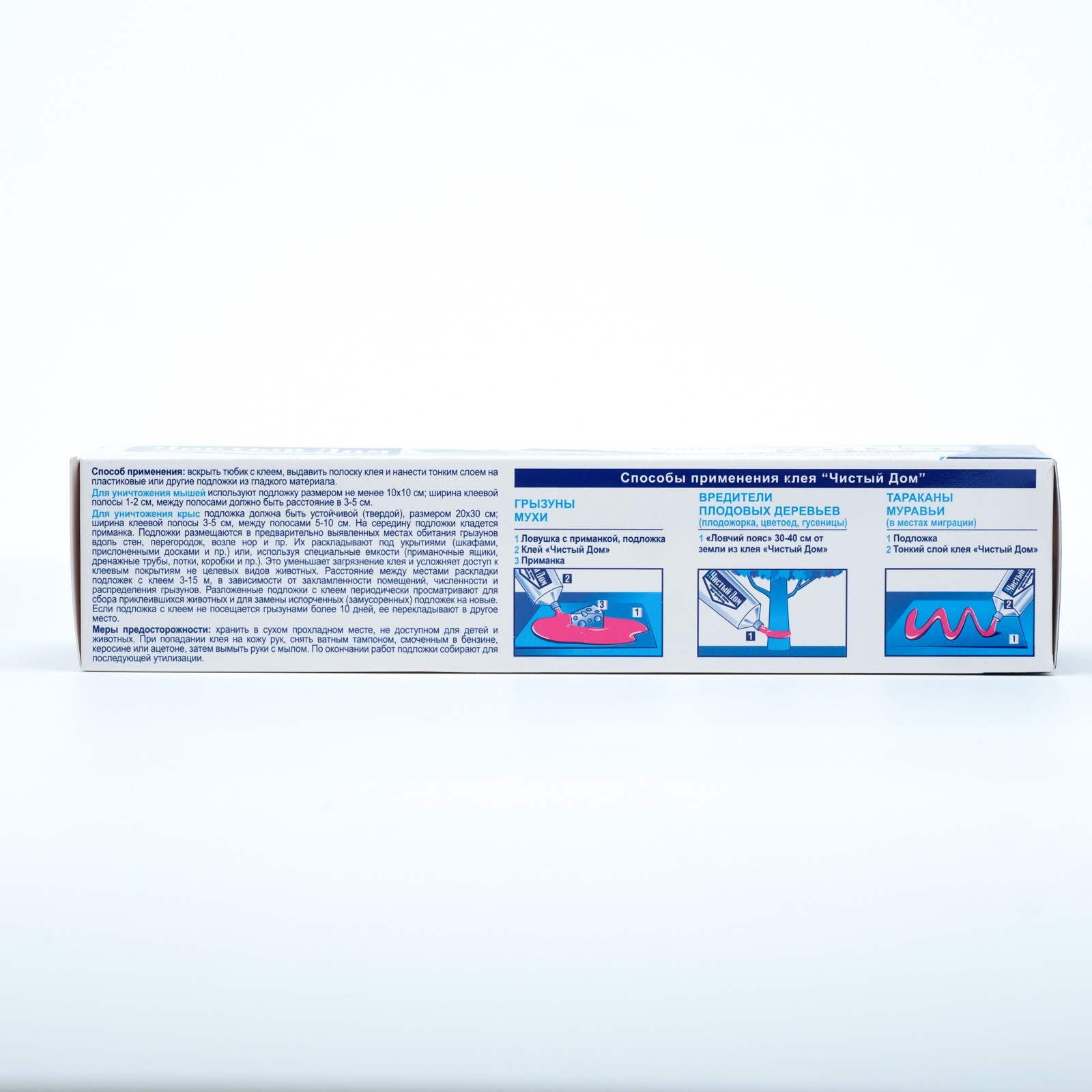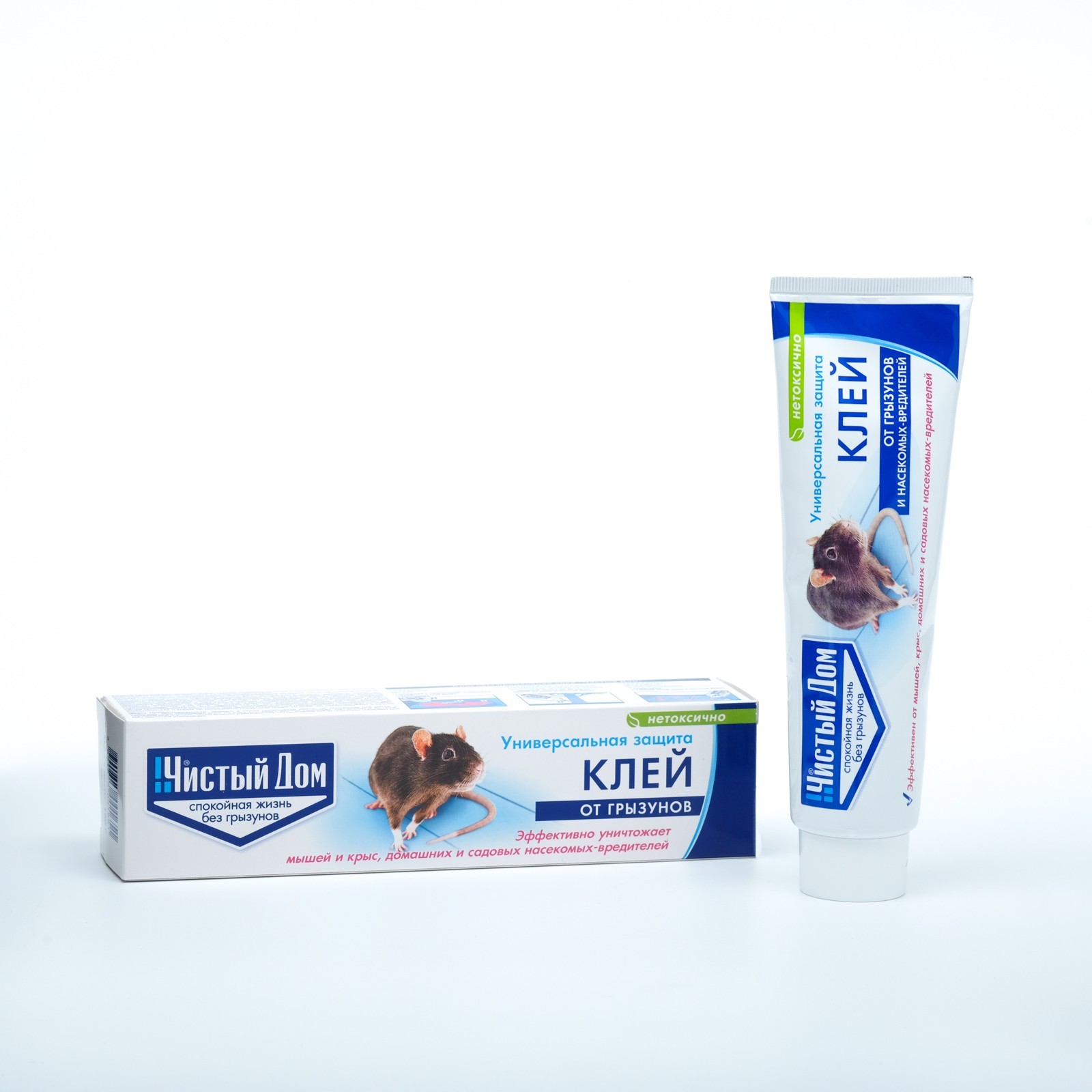 Клей от грызунов и насекомых чистый дом туба 130 г. Указания по применению: вскрыть тюбик с клеем, выдавить полоску клея и нанести тонким слоем на пластиковые или другие подложки из гладкого материала; для уничтожения мышей используют подложку размером не менее 10x10 см; ширина клеевой полосы 1-2 см, между полосами должно быть расстояние в 3-5 см. Для уничтожения крыс подложка должна быть устойчивой (твёрдой), размером 20x50 см; ширина клеевой полосы 5-5 см, между полосами 5-10 см; на середину подложки кладётся приманка. Подложки размещаются в предварительно выявленных местах обитания грызунов вдоль стен, перегородок, возле нор и пр. Их раскладывают под укрытиями (шкафами, прислоненными досками и пр. ) или, используя специальные ёмкости (приманочные ящики, дренажные трубы, лотки, коробки и пр. ). Это уменьшает загрязнение клея и усложняет доступ к клеевым покрытиям не целевых видов животных; расстояние между местами раскладки подложек с клеем 3-15 м, в зависимости от захламлённости помещений, численности и распределения грызунов; разложенные подложки с клеем периодически просматривают для сбора приклеившихся животных и для замены испорченных (замусоренных) подложек на новые. Если подложка с клеем не посещается грызунами более 10 дней, её перекладывают в другое место. Вес, г: 130 Область применения: От грызунов Область применения: От всех насекомых Вид средства: Клей  развернуть описание ▼