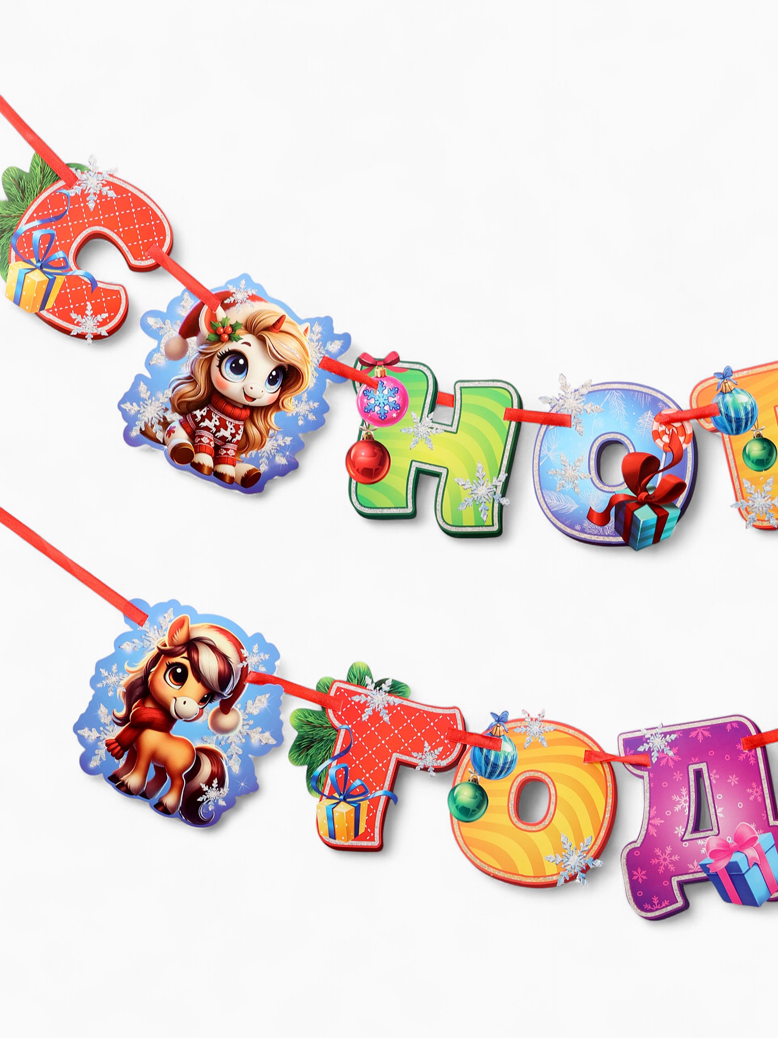 Гирлянда на ленте с блестками «с новым годом!», лошадки, 250 см.