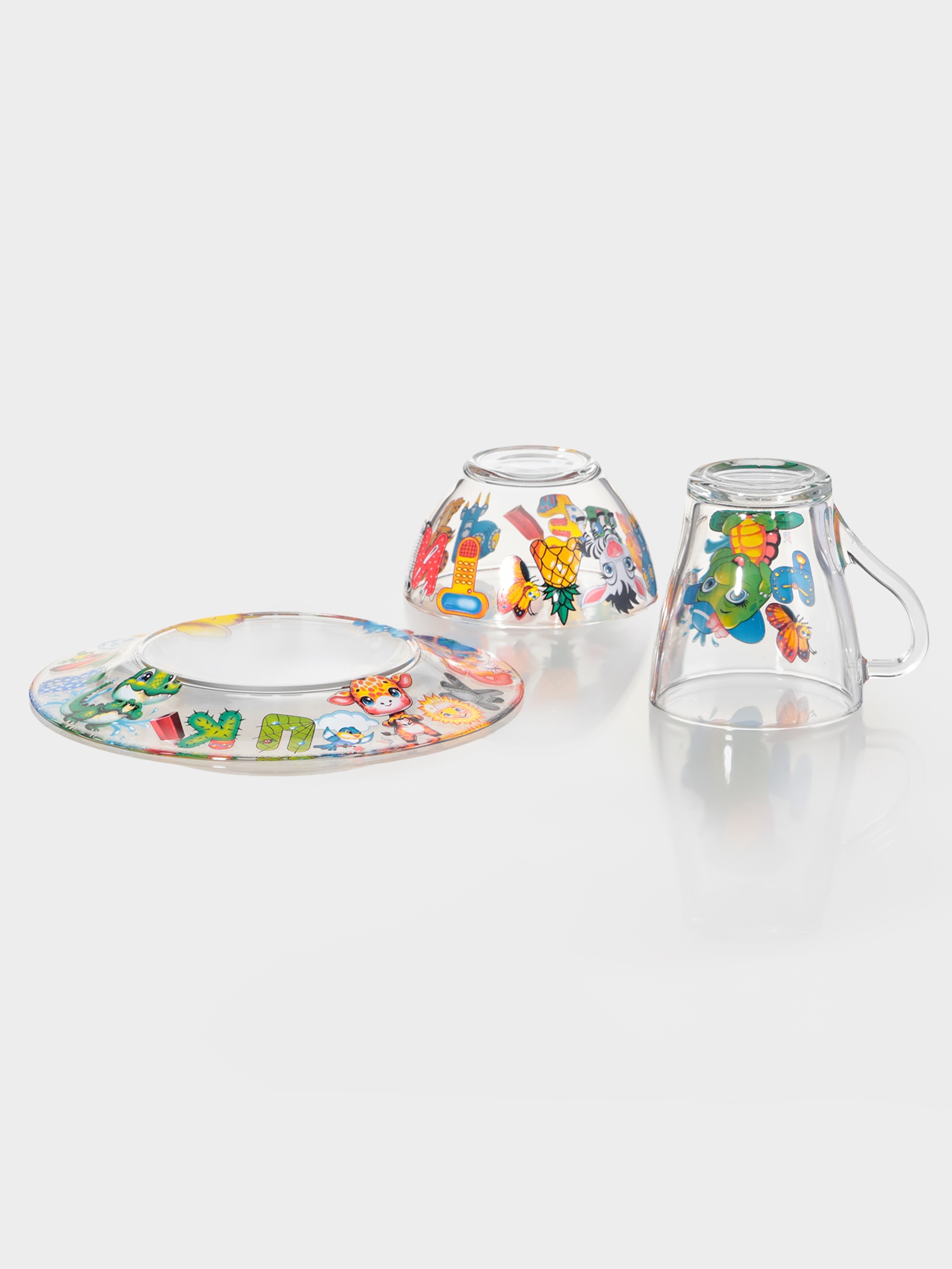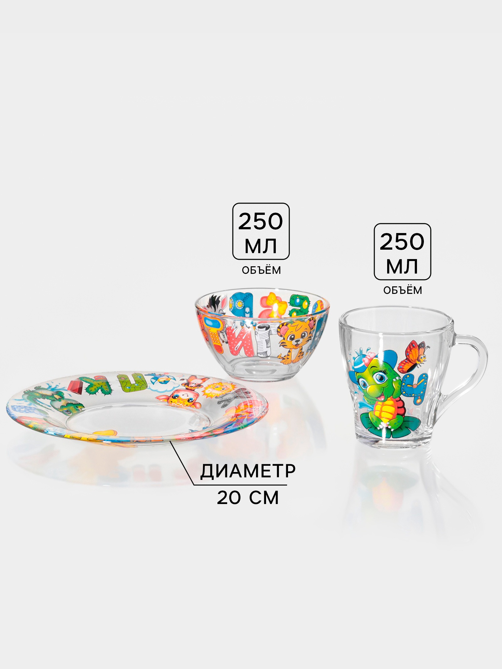 Набор посуды декостек «абвгдейка», 3 предмета, стекло, прозрачный. Набор посуды – это идеальное решение для тех, кто ценит оригинальность и качество. Этот набор посуды не только украсит ваш стол, но и станет отличным подарком. Прозрачные стеклянные предметы с интересным ярки дизайном добавят акцентов в каждый приём пищи и заинтересуют ребёнка. Преимущества: Яркий дизайн: каждый предмет украшен рисунками на тему букв и животных, что делает их не только функциональными, но и привлекательными для ребёнка. Это отличный способ сделать обед более интересным. Качественное стекло: изготовленные из прочного материала, эти изделия легко чистятся и сохраняют свой первоначальный вид даже после многократного использования. Лёгкий уход: благодаря гладкой текстуре посуда легко очищается. Цвет: Прозрачный parts count: 0 Количество персон: 1 В наборе, шт.: 3 Тематика: Буквы, письма, газеты Тематика: Животный мир Материал: Стекло Для детей до 3 лет: Нет Температурное ограничение: Нет Можно мыть в посудомоечной машине: Да Можно использовать в СВЧ-печи: Да Текстура: Гладкая Особенности: Без особенностей  развернуть описание ▼