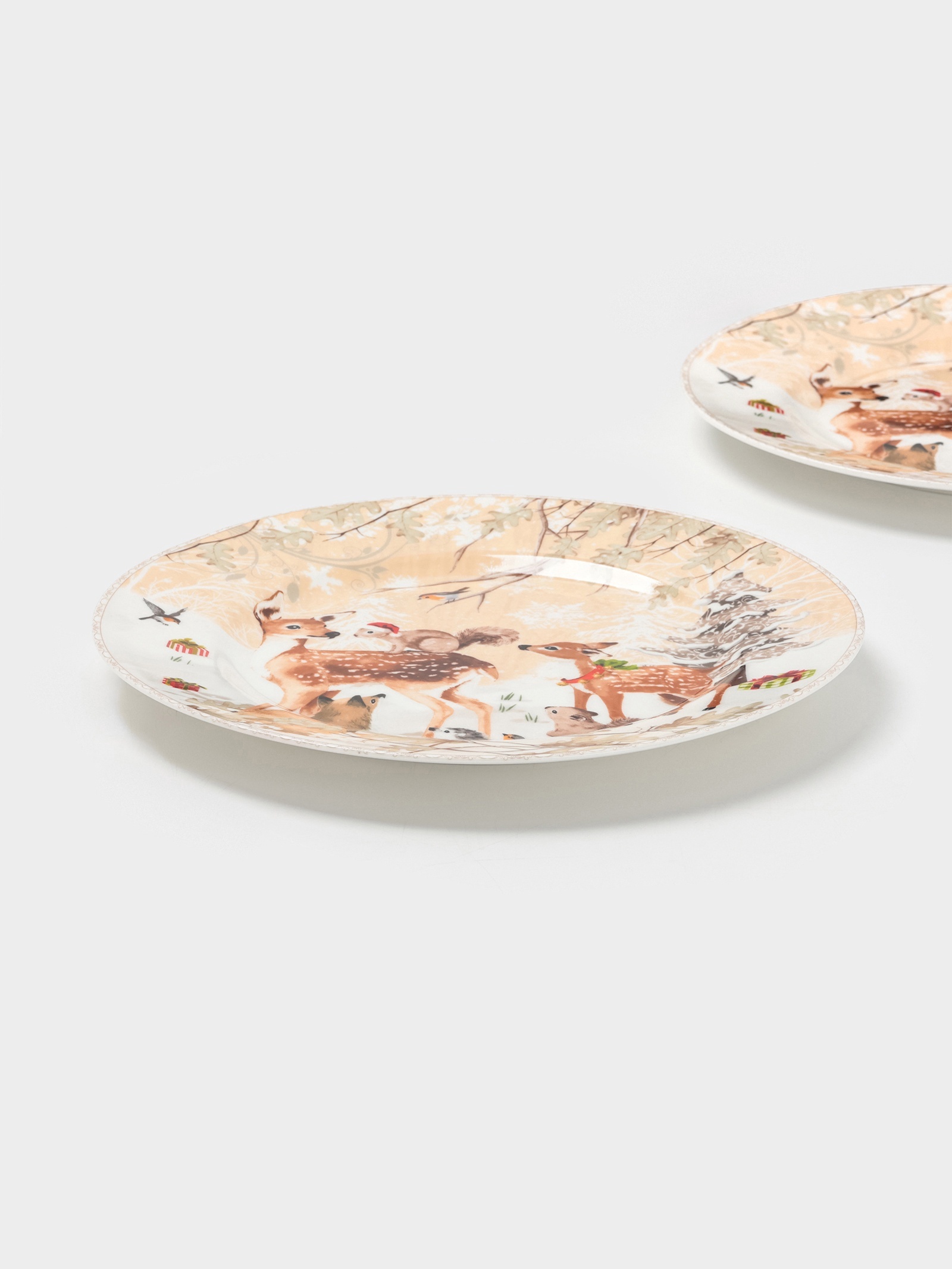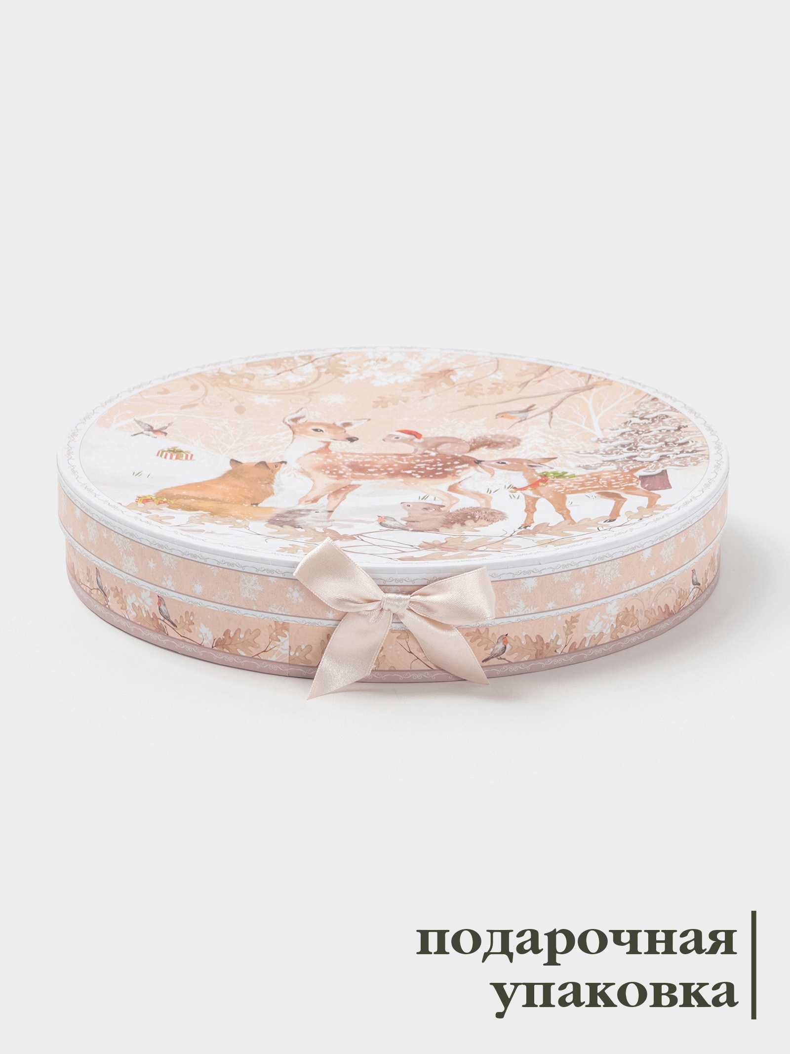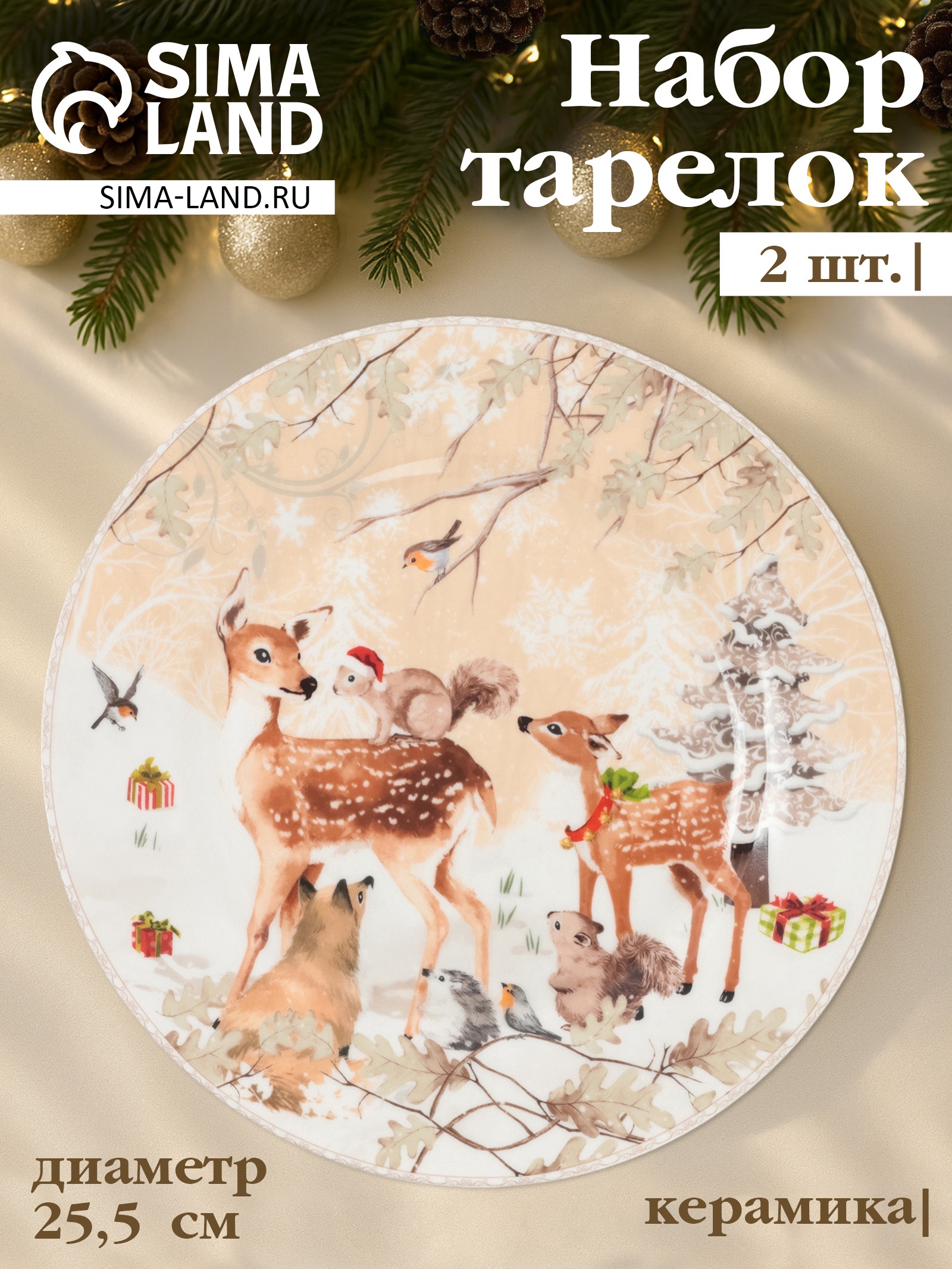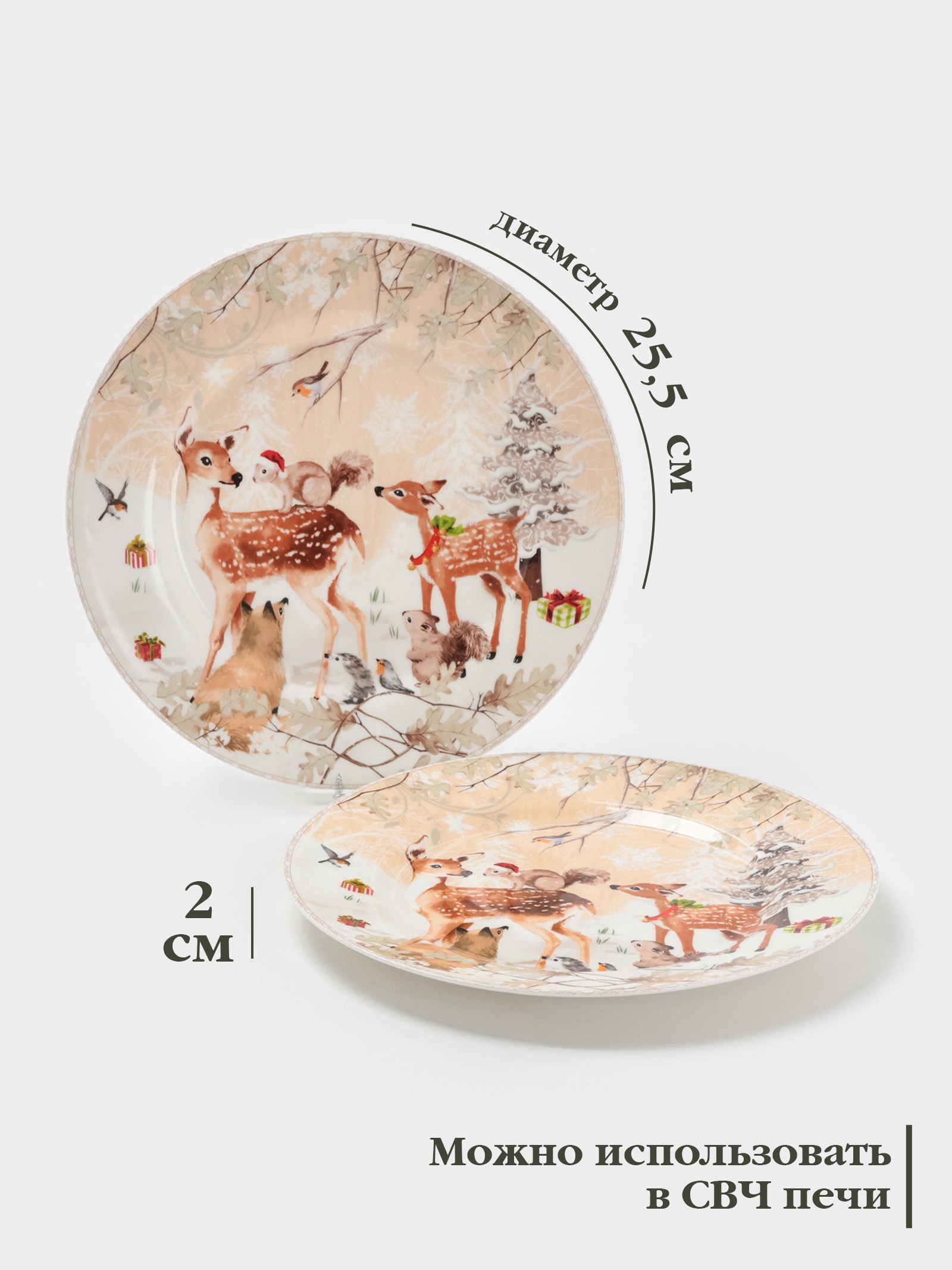 Набор тарелок новогодних «лесное чудо», 2 шт., d=25.5 см, керамика, подарочная упаковка, бежевый. Погрузитесь в атмосферу зимнего леса с набором новогодних тарелок «Лесное чудо» — парой керамических блюд диаметром 25, 5 см для уютного семейного обеда. Бежевый оттенок и сказочные животные на поверхности создают ощущение тепла и волшебства, а подарочная упаковка делает набор готовым решением для мягкого подарка. Эти плоские тарелки подходят для подачи горячих блюд и выполнены из прочной керамики с декоративной печатью. Гладкая текстура и круглая форма обеспечивают удобство в использовании, а совместимость с микроволновой печью делает их практичным выбором для повседневной жизни. Новогодний уют на обеденном столе: две тарелки с лесной тематикой создают атмосферу праздника и напоминают о сказочных зимних историях. Сдержанная эстетика: бежевая палитра и изящные рисунки сказочных животных гармонично вписываются в любой интерьер и не перегружают визуальное восприятие. Комфорт для двоих: размер и форма тарелок идеально подходят для парного обеда или ужина, делая каждую трапезу немного особенной. Тёплый подарок: набор в подарочной упаковке — выбор для тех, кто ценит уют в мелочах и любит создавать атмосферу дома. С набором тарелок «Лесное чудо» каждый обед становится моментом уюта, когда за вкусной едой можно представить себя в сказочном зимнем лесу, где живут добрые зверушки и витает волшебство. Цвет: Бежевый Диаметр, см: 25.5 В наборе, шт.: 2 Количество персон: 2 Тематика: Новогодняя Тематика: Сказочные животные Материал: Керамика С присоской: Нет Для детей до 3 лет: Нет Вид тарелки: Плоская Можно мыть в посудомоечной машине: Нет Можно использовать в СВЧ-печи: Да Текстура: Гладкая Особенности: Деколь Матовая поверхность: Нет Для горячего: Да Форма: Круг  развернуть описание ▼