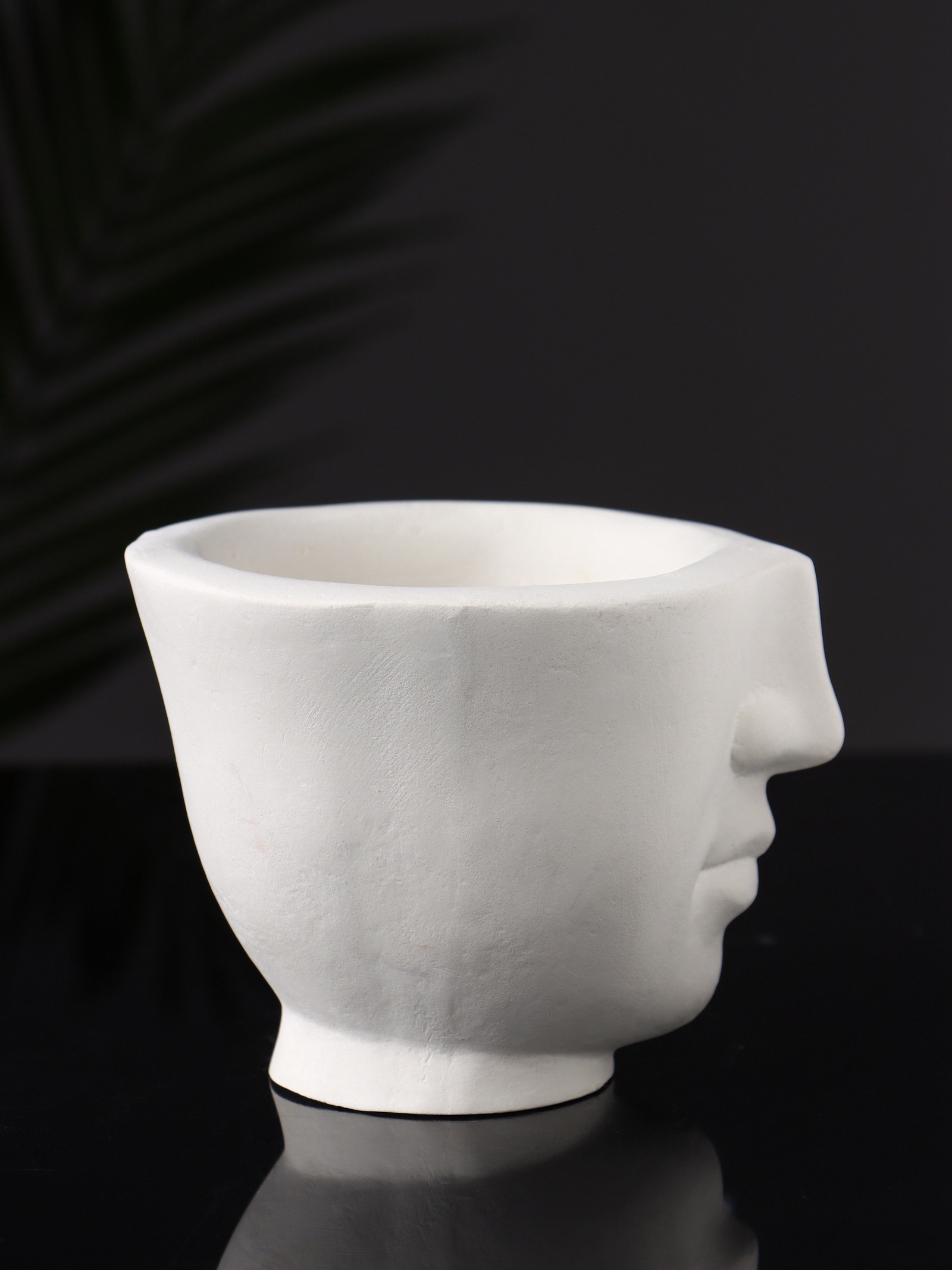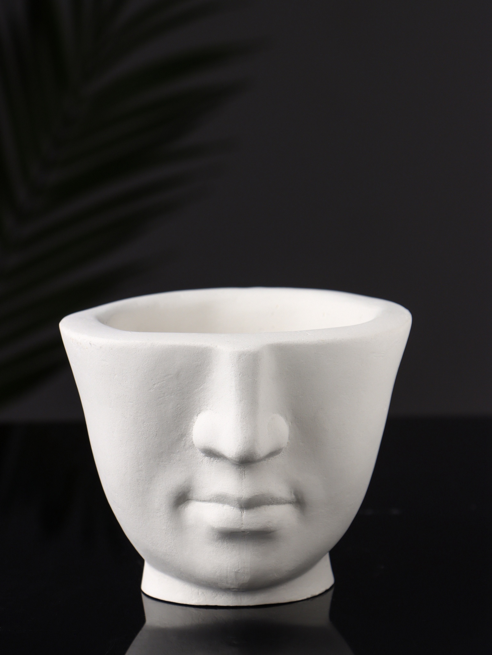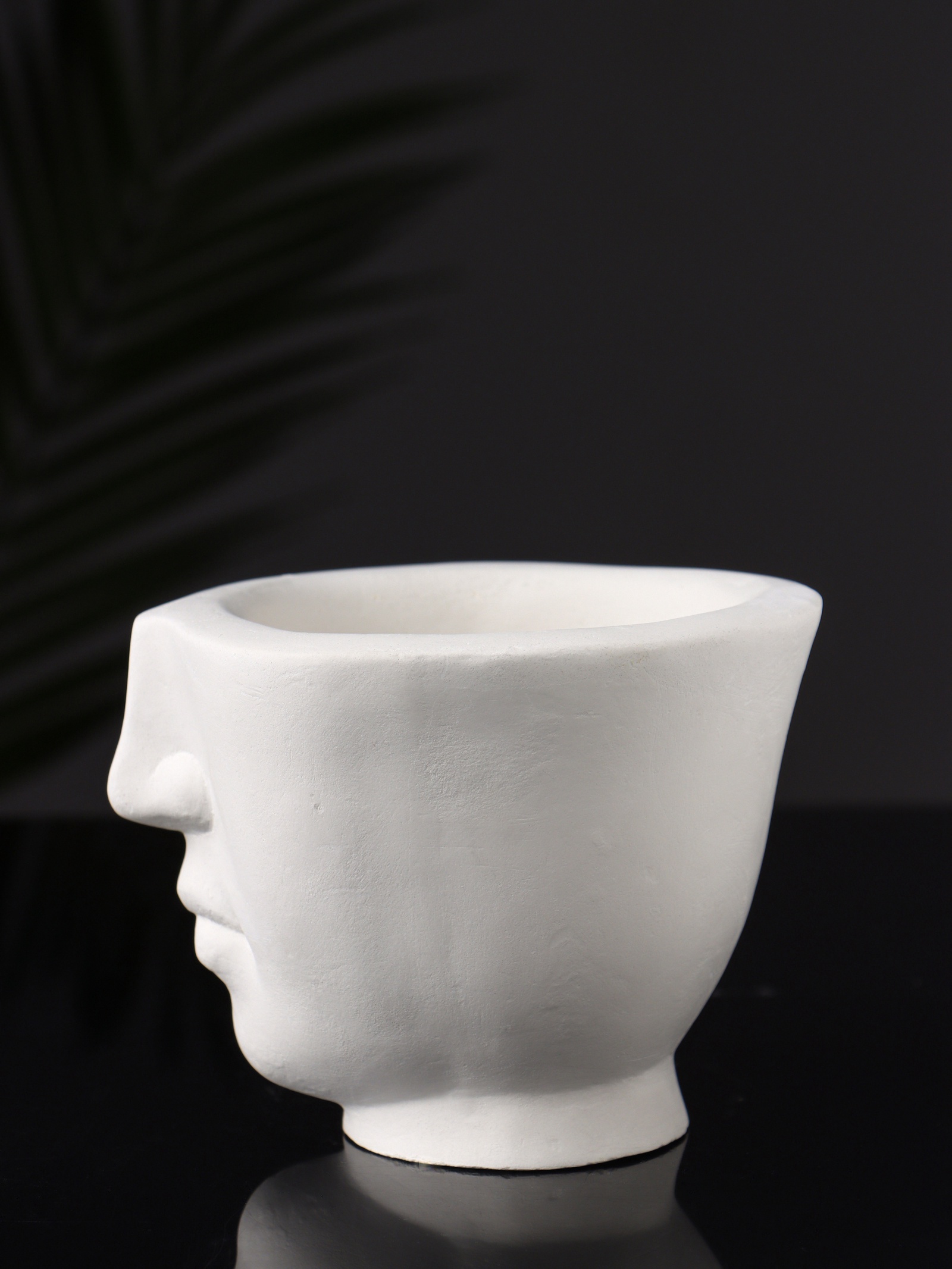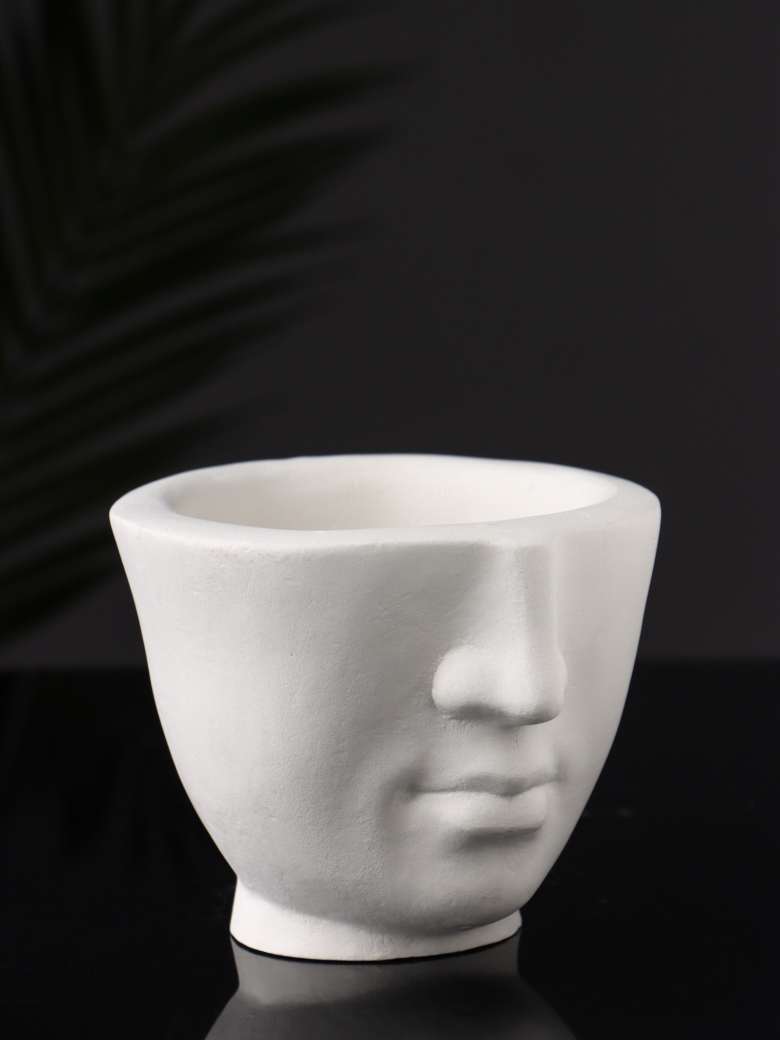 Фигурное кашпо для цветов «лицо», гипс, 9 11 см. Это кашпо — не просто сосуд для растений, а скульптурный объект, способный преобразить пространство. Стилизованное гипсовое лицо с плавными чертами и благородной матовой поверхностью становится изысканным обрамлением для миниатюрных растений, превращая их в «живые волосы» или «зеленую бороду». Компактный размер (9 11 см) делает его идеальным акцентом для книжных полок, рабочих столов или туалетных столиков, где хочется добавить ноту арт-иронии. Белоснежный гипс подчеркивает современную эстетику, а отсутствие системы полива дает свободу в выборе растений — от суккулентов до воздушных тилландсий. Дизайнерский шик: абстрактная форма лица в духе ар-деко создает модный контраст с природной зеленью.Тактильное удовольствие:гипс приятно холодит руки, а его шероховатая текстура добавляет скульптурной выразительности.Креативный потенциал: позволяет обыгрывать образ — от «проросшей» античной головы до брутального кашпо с кактусами «иголками».Стабильность материала: гипс не выцветает со временем, сохраняя музейную белизну.Инстаграм-эффект: такой арт-объект неизменно привлекает внимание и становится темой для фотографий.Выбирая это кашпо, вы приобретаете не просто аксессуар для цветов, а компактное произведение искусства. Оно станет тем самым говорящим деталем в интерьере, который раскрывает характер хозяина — с долей самоиронии и любовью к нестандартным решениям. Цвет:Белый|Высота, см:9|Вид установки:Настольное|Материал:Гипс|Можно оставлять зимой на улице:Нет|Особенности:Фигурное|Тип полива:Без системы полива|Страна:Россия  развернуть описание ▼