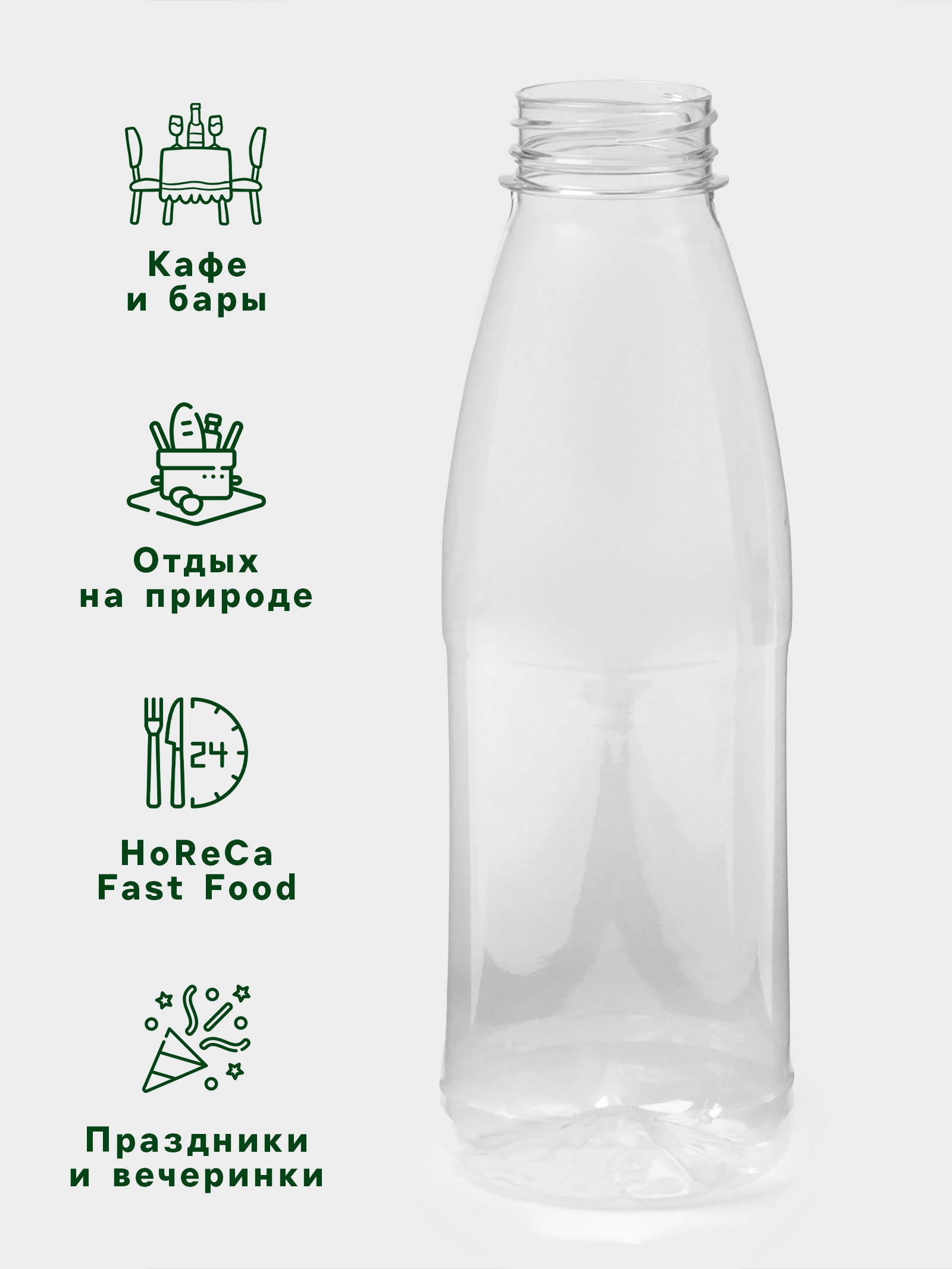 Бутылка одноразовая «круглая», пластик пэт, 500 мл, горло 0.38 см, прозрачная. Прозрачная круглая ПЭТ-бутылка объёмом 500 мл — практичное решение для розлива напитков и хранения жидкостей. Удобный формат подходит для воды, холодного чая, лимонадов и других безалкогольных напитков. Основные преимущества Классическая круглая форма — удобно держать в руке и ставить в подстаканникиУзкое горлышко 38 мм предотвращает проливание при транспортировкеЛёгкий пищевой пластик — безопасен для контакта с напиткамиПрозрачные стенки позволяют видеть содержимое и контролировать остатокСферы применения Идеальна для предприятий общепита, уличных торговцев напитками, организаторов мероприятий. Подходит для: - Фасовки прохладительных напитков на вынос - Использования в офисных кулерах - Приготовления домашних лимонадов и холодных чаев Особенности использования Рекомендуется для холодных напитков. Не предназначена для горячих жидкостей и мытья в посудомоечной машине. Перед первым применением промойте прохладной водой. Цвет: Прозрачный Фасовка, шт.: 100 Объём, мл: 500 Материал: Пластик Материал: ПЭТ Температурное ограничение: Нет Можно мыть в посудомоечной машине: Нет  развернуть описание ▼