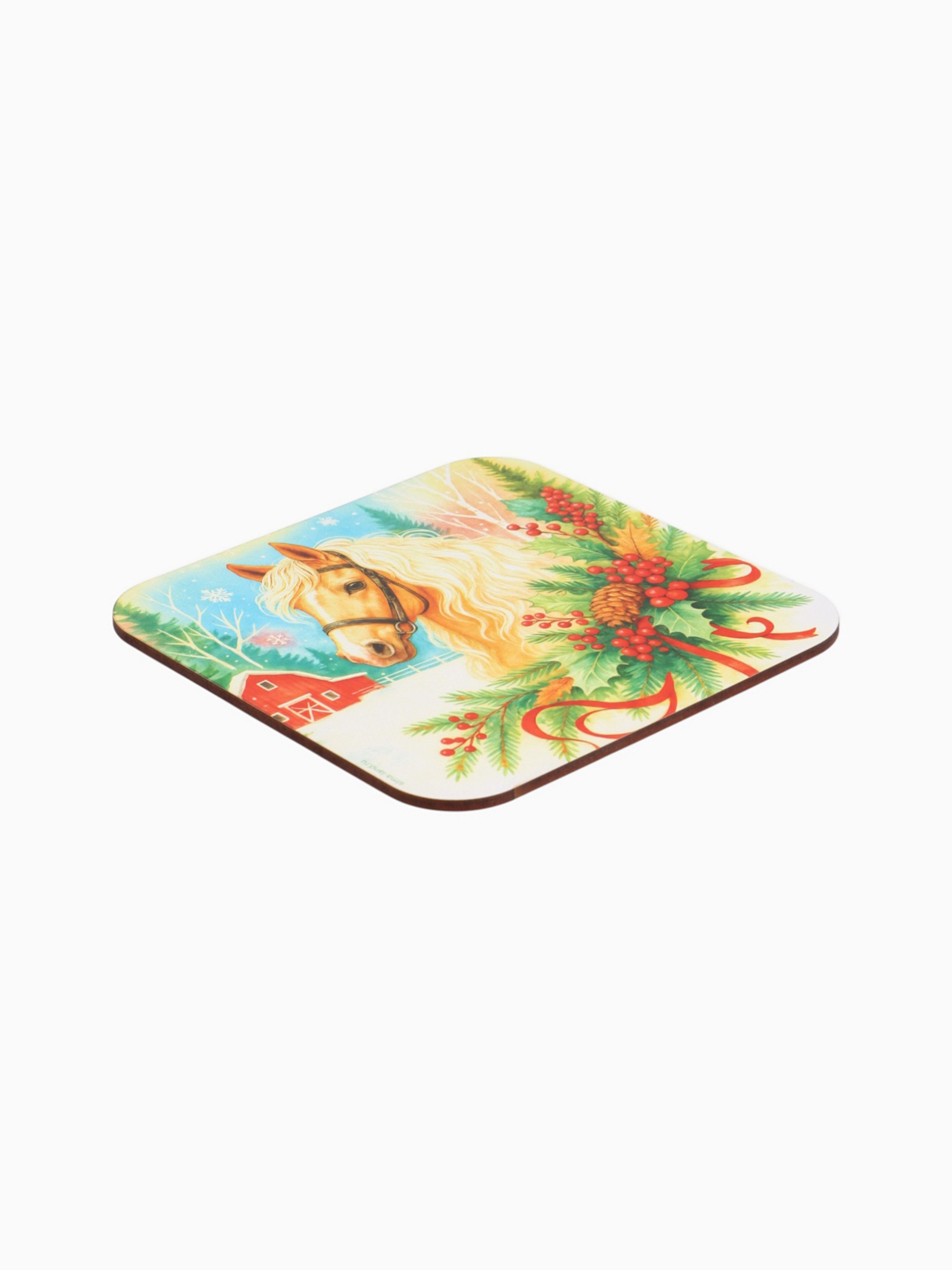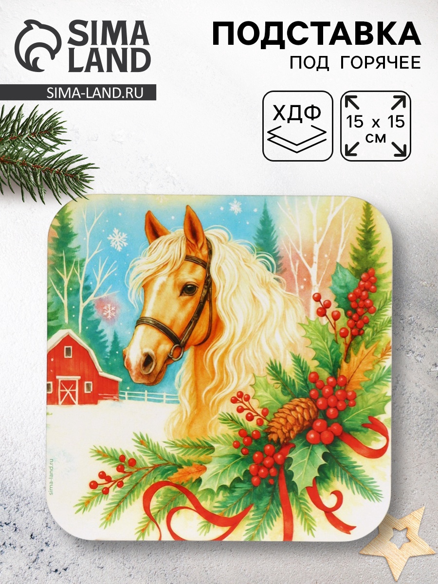 Подставка под горячее новогодняя «лошадка», 15 15 см. Подставка под горячее новогодняя «Лошадка», 15 15 см Создайте уют и волшебную атмосферу на кухне с новогодними подставками под горячее из ХДФ размером 15x15 см. Эти стильные аксессуары не только защитят вашу мебель, но и добавят праздничного настроения. Размер 15x15 см идеально подходит для размещения под горячие кастрюли, сковородки, чайники и другие кухонные принадлежности. Компактные и удобные, они легко впишутся в любой интерьер. Гладкая поверхность подставок легко очищается, что делает их практичным выбором для ежедневного использования. Они также устойчивы к пятнам и запахам. Набор:Нет|Цвет:Разноцветный|Размер, см:15 х 15|Рисунок:Да|Символ года:Символ года 2026 (Лошадь)|Тематика праздника:Новый год|Вид дерева:ХДФ|Материал:ХДФ|Можно мыть в посудомоечной машине:Нет|Страна:Россия  развернуть описание ▼