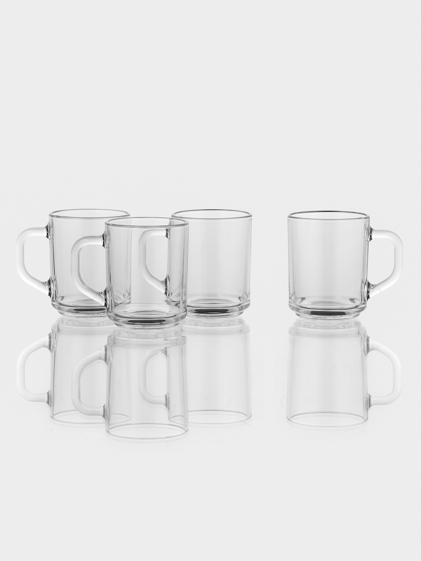 Прозрачное стекло и гладкая текстура создают лёгкий визуальный интерес, не перегружая образ — кружки уместны и на кухне, и в гостях.