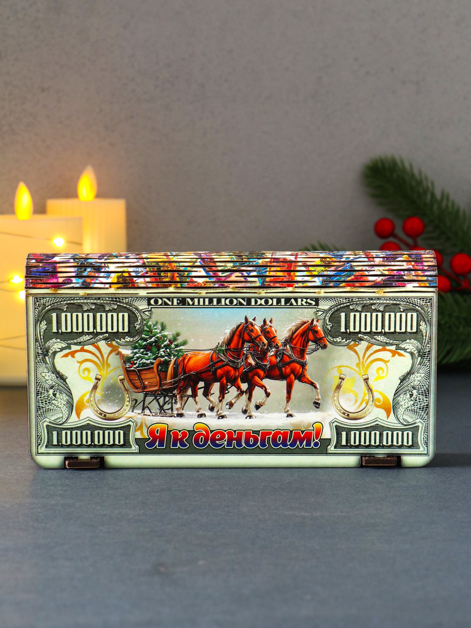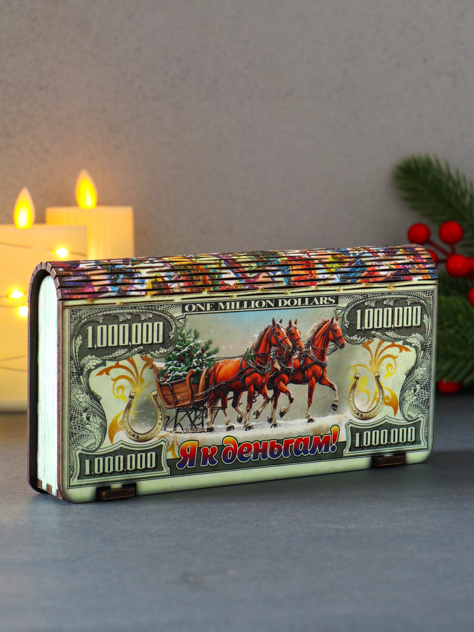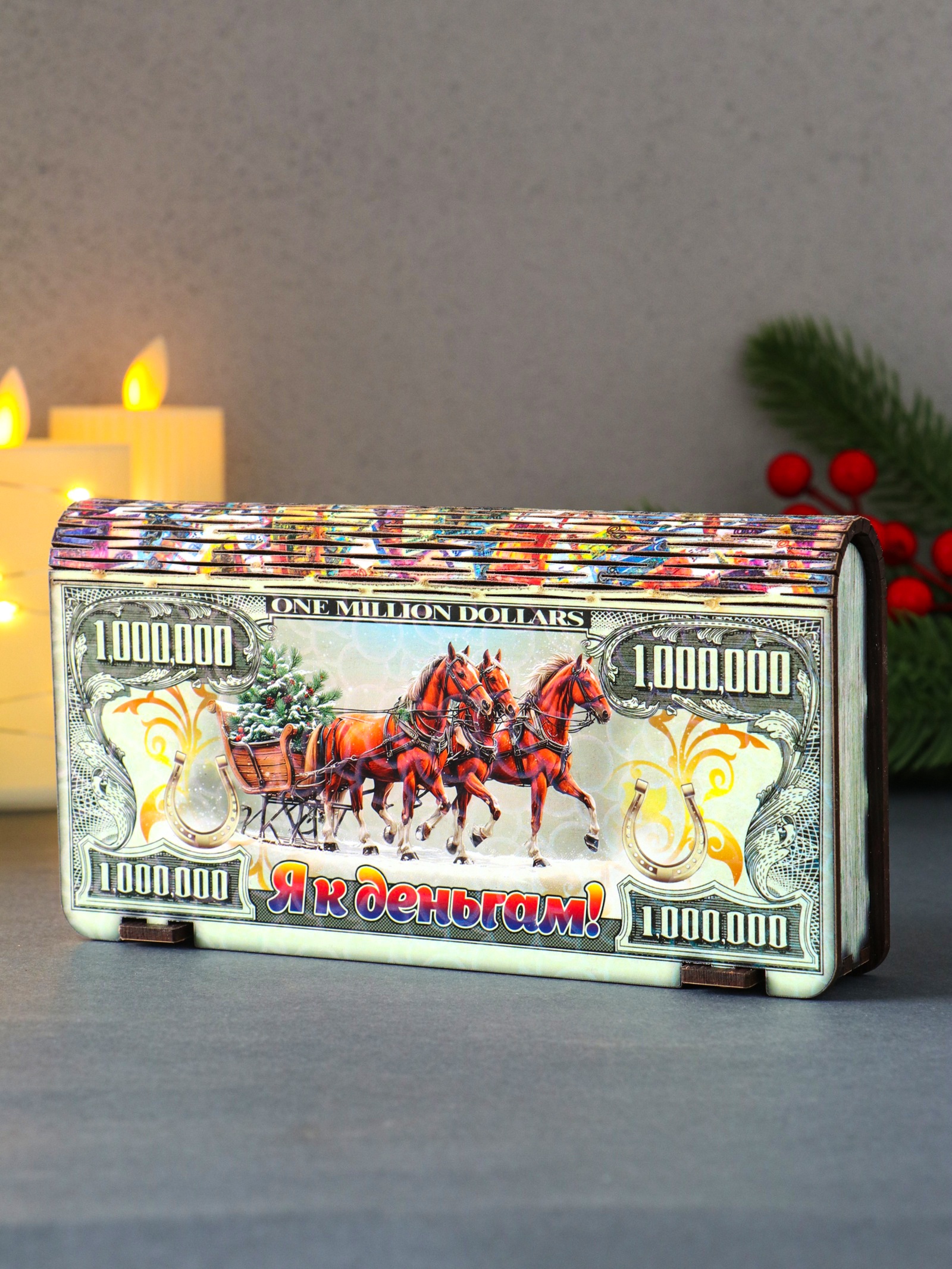 Купюрница подарочная «1000000 $ с конями: я к деньгам», 18 9.5 3.5 см. Набор:Нет|Цвет:Разноцветный|Форма:Прямоугольная|Длина, см:18|Ширина, см:9.5|Высота, см:3.5|Тематика:Новогодняя|Тематика:Животный мир|Тематика:Надписи, цифры, буквы|Тематика:Деньги|Тематика праздника:Новый год|Вид дерева:ХДФ|Материал:ЛХДФ|Покрытие:Лак|Покрытие:Бумага|Особенности шкатулки:Для денег|Страна:Россия  развернуть описание ▼