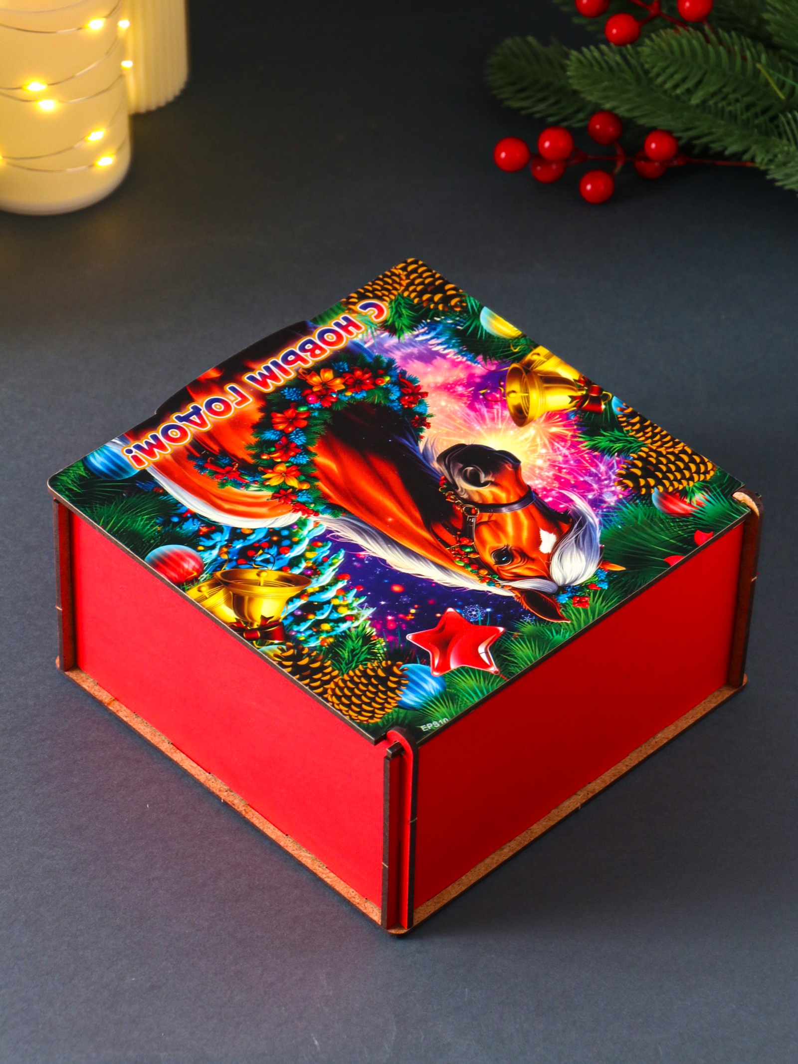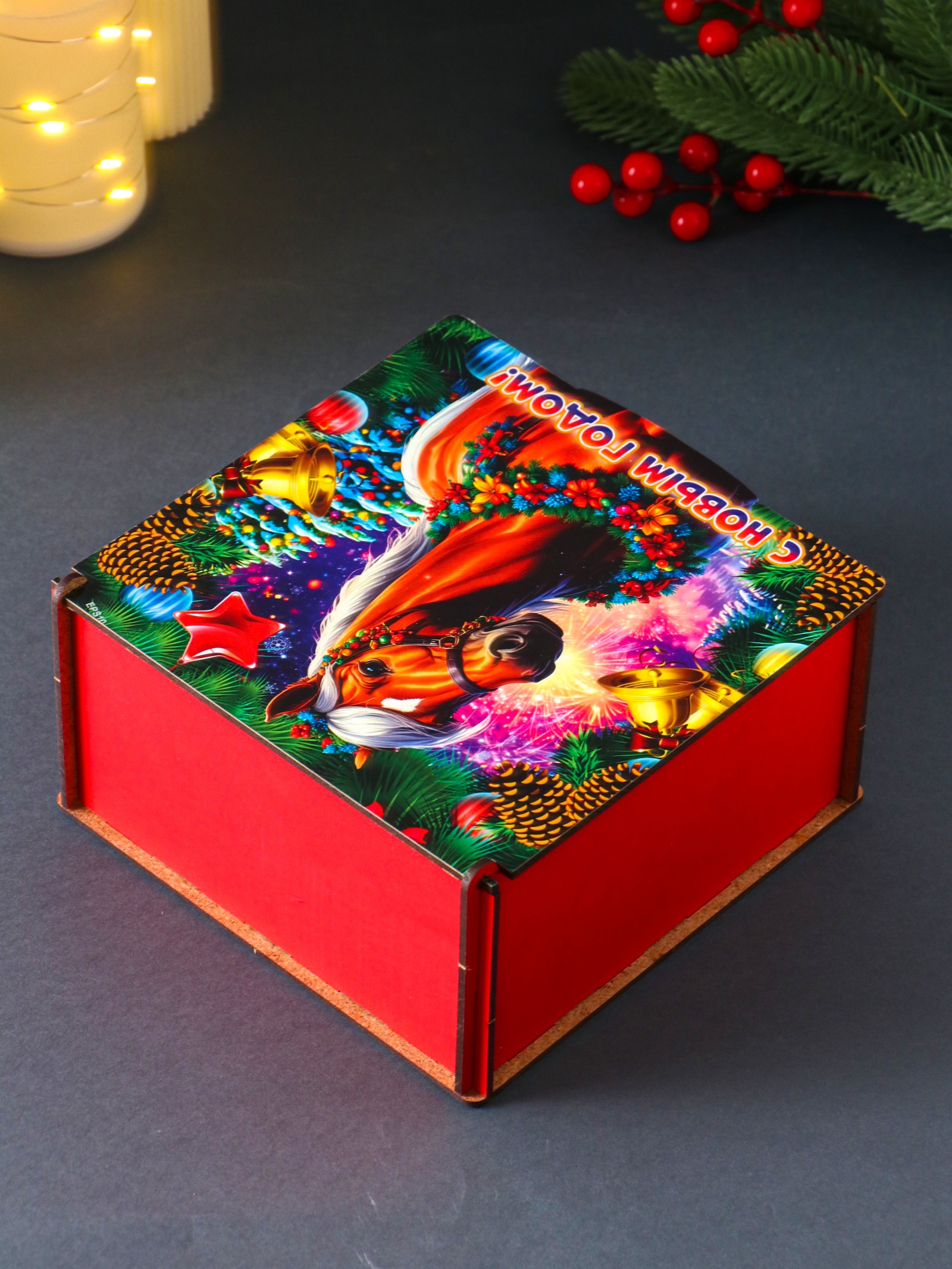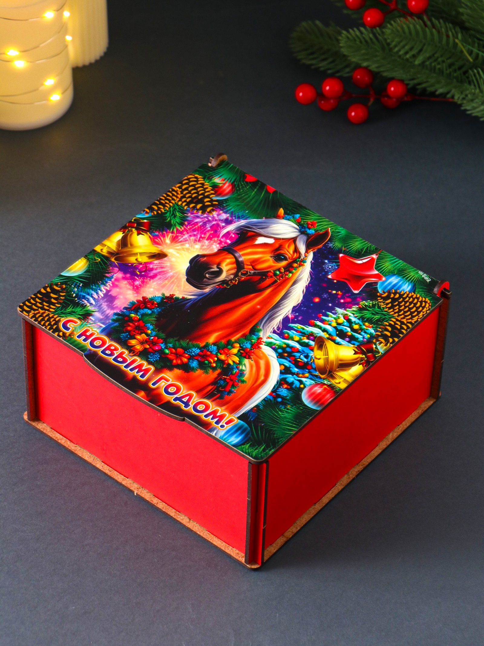 Коробка подарочная новогодняя «шкатулка с лошадью. с новым годом», 18 18 9.5 см. Цвет:Красный|Цвет:Разноцветный|Форма:Квадратная|Длина, см:18|Ширина, см:18|Высота, см:9.5|Тематика:Новогодняя|Тематика:Животный мир|Тематика:Надписи, цифры, буквы|Символ года:Символ года 2026 (Лошадь)|Тематика праздника:Новый год|Материал:Дерево|Вид:Квадратные|Размер:Средний (18-24 см)|Страна:Россия  развернуть описание ▼
