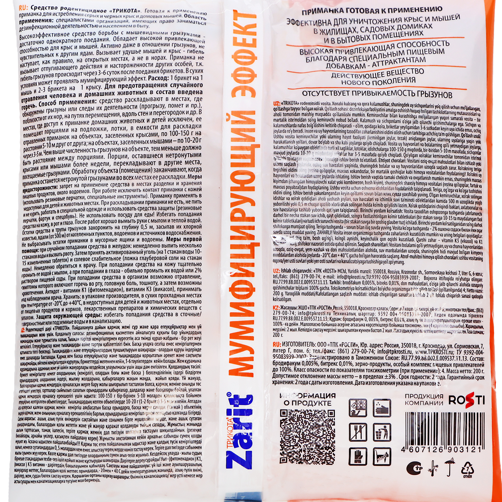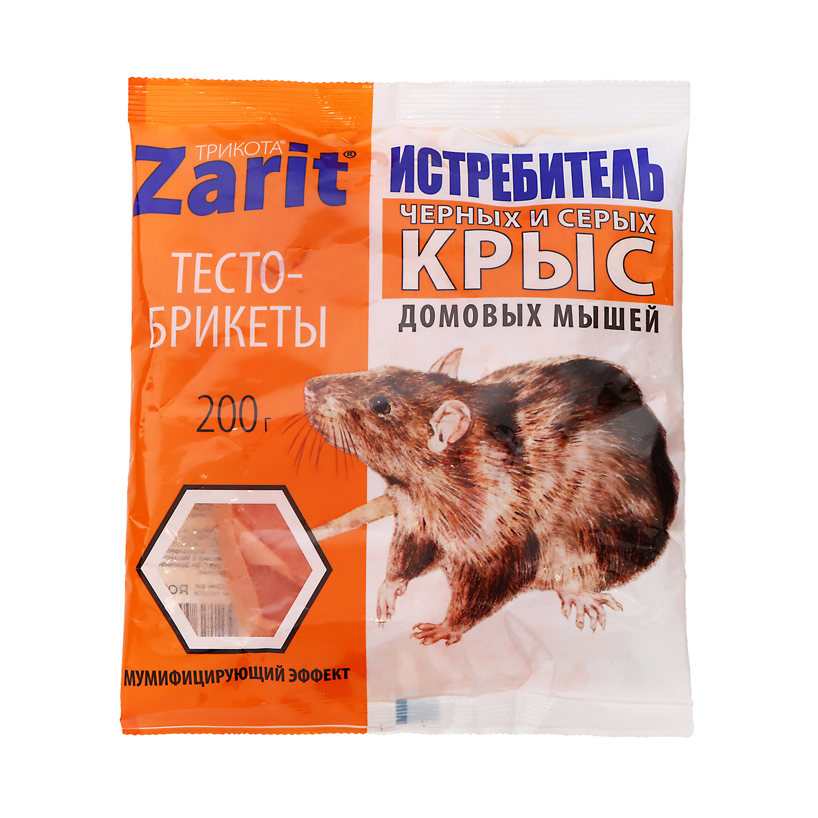 Тесто-брикет от грызунов "zarit", набор, 200 г. Область применения: Брикеты для истребления серых и черных крыс и домовых мышей. Описание: высокоэффективное средство борьбы с мышевидными грызунами - достаточно однократного поедания. Обладает высокой привлекающей способностью для крыс и мышей. Активно даже в отношении грызунов, не чувствительных к другим ядам. Вызывает удушье мышей и крыс - гибель наступает, как правило, на открытых местах, а не в норах. Приманка не вызывает отпугивающего действия и настороженности других особей, т. к. гибель грызунов происходит через 3-6 суток после поедания брикетов. Расход: 1 брикет на 1 мышь и 2-3 брикета на 1 крысу. Для предотвращения случайного отравления человека и домашних животных в состав брикетов введена горечь. Способ применения: Брикеты раскладывают в местах, где обнаружены грызуны или следы их деятельности (погрызы, помет и пр. ), поблизости от их нор, на путях перемещения, вдоль стен, перегородок и др. В местах, где доступ к приманке домашних животных и детей исключен, ее помещают порциями на подложки, лотки, в емкости для раскладки отравленных приманок: на объектах, заселенных крысами — по 100-150 г на расстоянии 5-10 м друг от друга; на объектах, заселенных мышами — по 10-20 г (1-2 брикета) через 3-5 м. Порции, оставшиеся нетронутыми более недели, перекладывают в другие места, посещаемые грызунами. Обработку объекта (помещения) заканчивают, когда приманка останется нетронутой грызунами во всех местах ее раскладки. Павших грызунов, использованные подложки, емкости и остатки средства сжечь или закопать в землю на глубину не менее 0, 5 м вдали от водоемов. При попадании на кожу смыть теплой водой с мылом. При попадании средства в глаза обильно промыть их водой. Вес, г: 200 Область применения: От грызунов Вид средства: Тесто-брикет  развернуть описание ▼