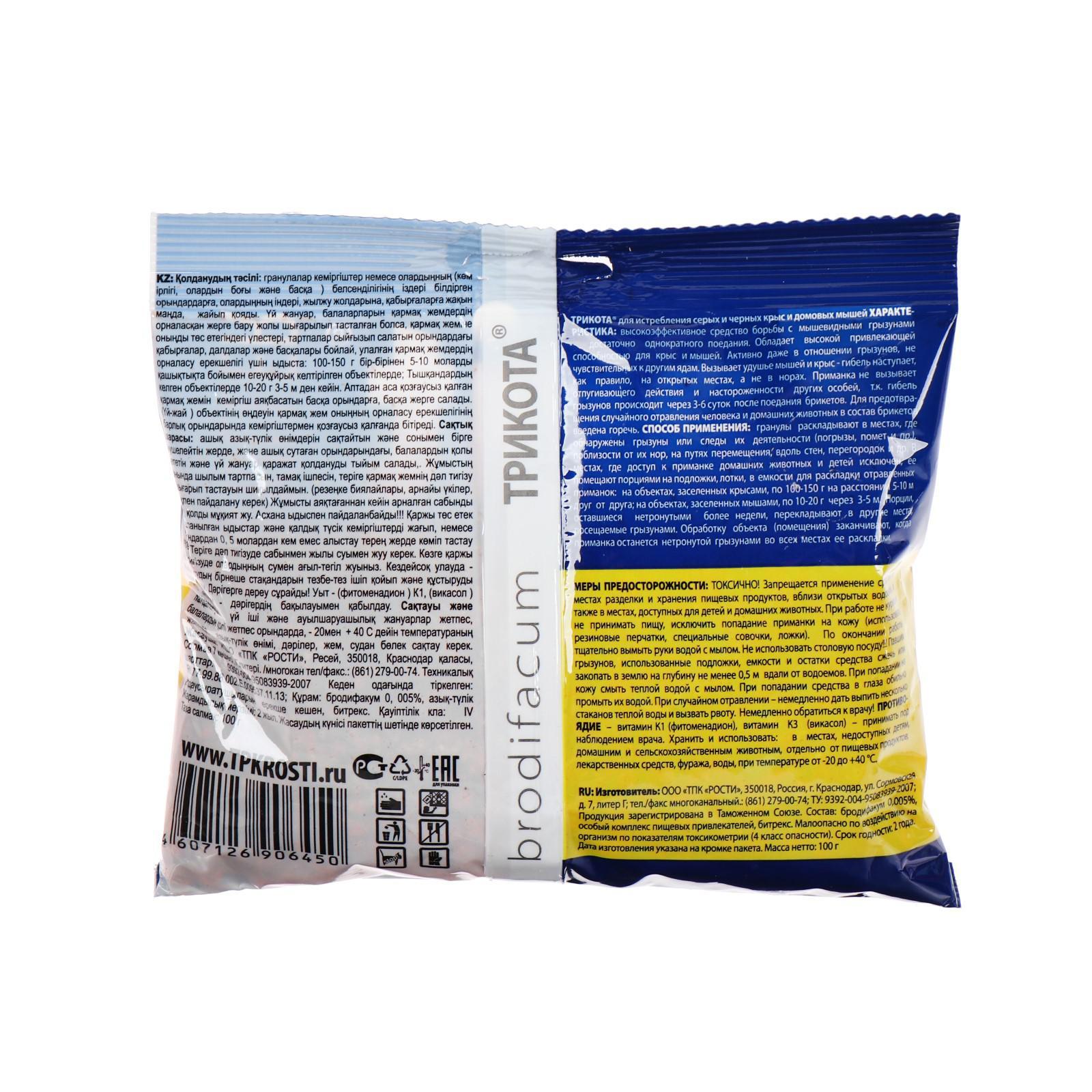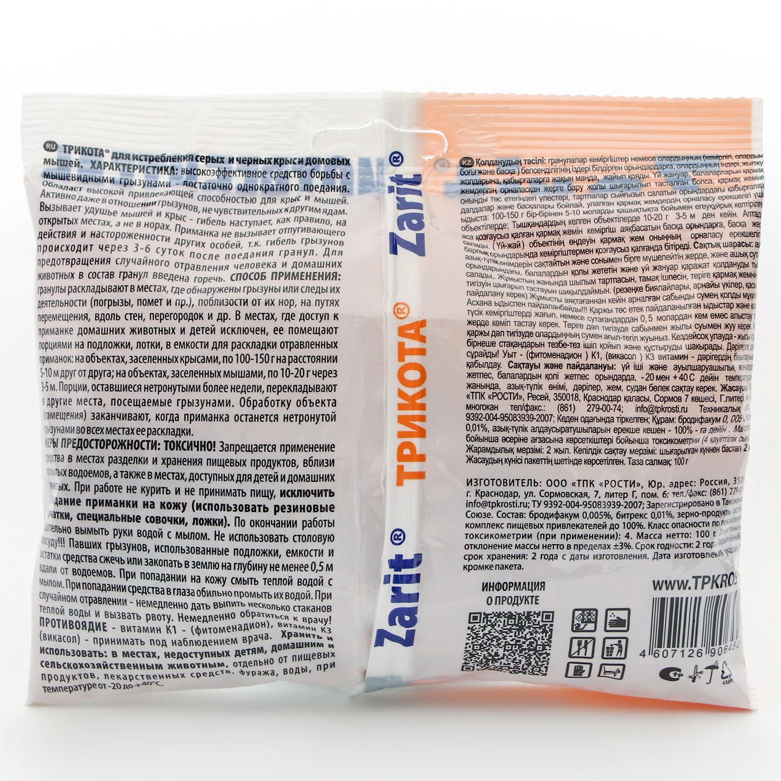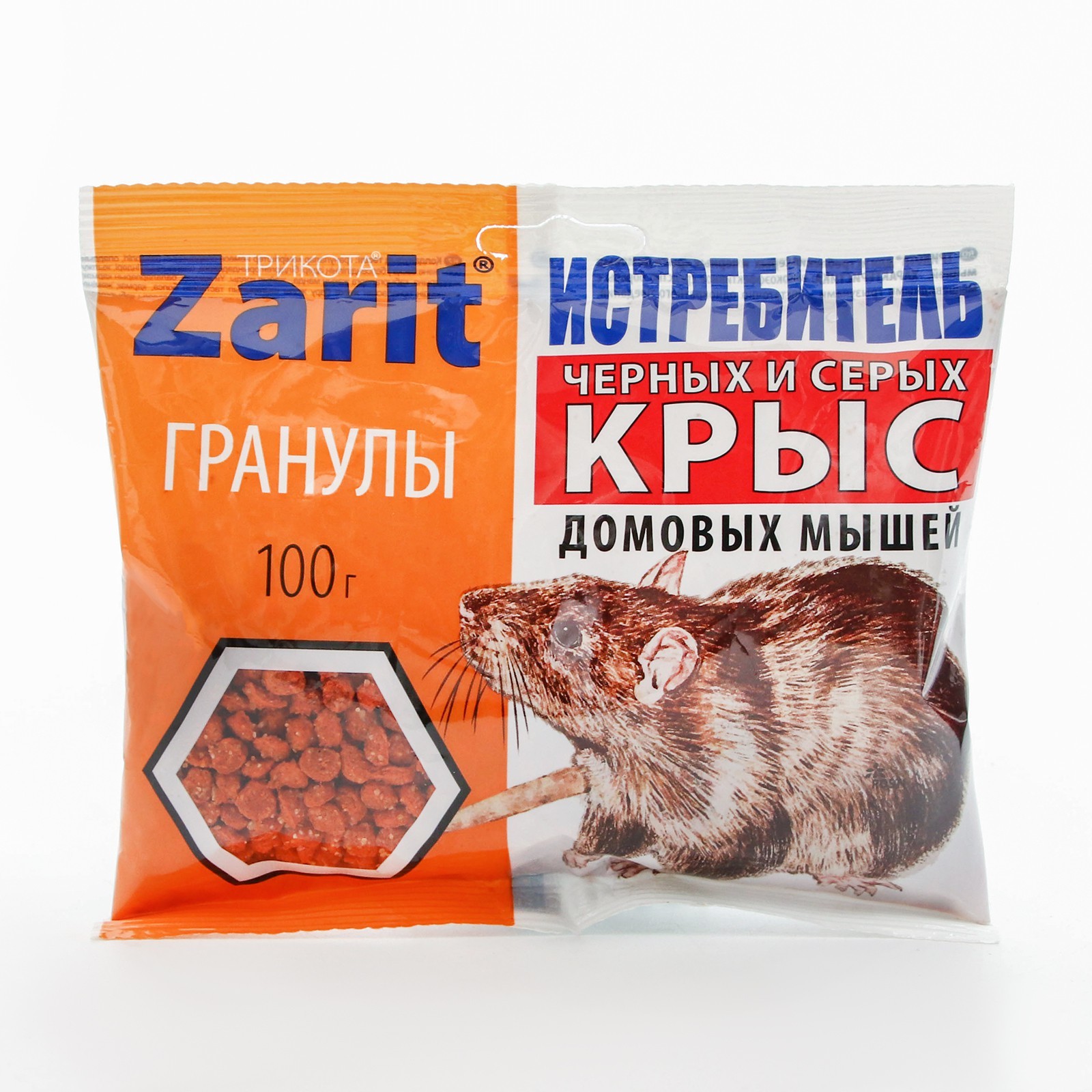 Гранулы от грызунов "zarit", трикота, 100 г. Трикота предназначена для истребления серых и черных крыс и домовых мышей. Это высокоэффективное средство борьбы с мышевидными грызунами - достаточно однократного поедания. Обладает высокой привлекающей способностью для крыс и мышей. Активно даже в отношении грызунов, не чувствительных к другим ядам. Вызывает удушье мышей и крыс - гибель наступает, как правило, на открытых местах, а не в норах. Приманка не вызывает отпугивающего действия и настороженности других особей, т. к. гибель грызунов происходит через 3-6 суток после поедания гранул. Для предотвращения случайного отравления человека и домашних животных в состав гранул введена горечь. Способ применения: гранулы раскладывают в местах, где обнаружены грызуны или следы их деятельности (погрызы, помет и пр. ), поблизости от их нор, на путях перемещения, вдоль стен, перегородок и др. В местах, где доступ к приманке домашних животных и детей исключен, ее помещают порциями на подложки, лотки, в емкости для раскладки отравленных приманок: на объектах, заселенных крысами, по 100-150 г на расстоянии 5-10 м друг от друга; на объектах, заселенных мышами, по 10-20 г через 3-5 м. Порции, оставшиеся нетронутыми более недели, перекладывают в другие места, посещаемые грызунами. Обработку объекта (помещения) заканчивают, когда приманка останется нетронутой грызунами во всех местах ее раскладки. Меры предосторожности: запрещается применение средства в местах разделки и хранения пищевых продуктов, вблизи открытых водоемов, а также в местах, доступных для детей и домашних животных. При работе не курить и не принимать пищу, исключить попадание приманки на кожу (использовать резиновые перчатки, специальные совочки, ложки). По окончании работы тщательно вымыть руки водой с мылом. Не использовать столовую посуду!!! Павших грызунов, использованные подложки, емкости и остатки средства сжечь или закопать в землю на глубину не менее 0, 5 м вдали от водоемов. При попадании на кожу смыть теплой водой с мылом. При попадании средства в глаза обильно промыть их водой. При случайном отравлении – немедленно дать выпить несколько стаканов теплой воды и вызвать рвоту. Немедленно обратиться к врачу! Противоядие – витамин К1 (фитоменадион), витамин К3 (викасол) – принимать под наблюдением врача. Трикота предназначена для истребления серых и черных крыс и домовых мышей. Это высокоэффективное средство борьбы с мышевидными грызунами - достаточно однократного поедания. Обладает высокой привлекающей способностью для крыс и мышей. Активно даже в отношении грызунов, не чувствительных к другим ядам. Вызывает удушье мышей и крыс - гибель наступает, как правило, на открытых местах, а не в норах. Приманка не вызывает отпугивающего действия и настороженности других особей, т. к. гибель грызунов происходит через 3-6 суток после поедания гранул. Для предотвращения случайного отравления человека и домашних животных в состав гранул введена горечь. Способ применения: гранулы раскладывают в местах, где обнаружены грызуны или следы их деятельности (погрызы, помет и пр. ), поблизости от их нор, на путях перемещения, вдоль стен, перегородок и др. В местах, где доступ к приманке домашних животных и детей исключен, ее помещают порциями на подложки, лотки, в емкости для раскладки отравленных приманок: на объекта
