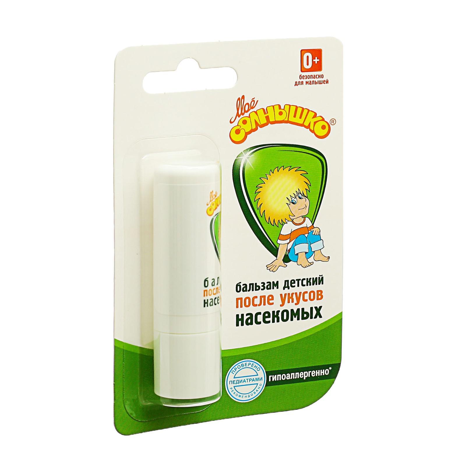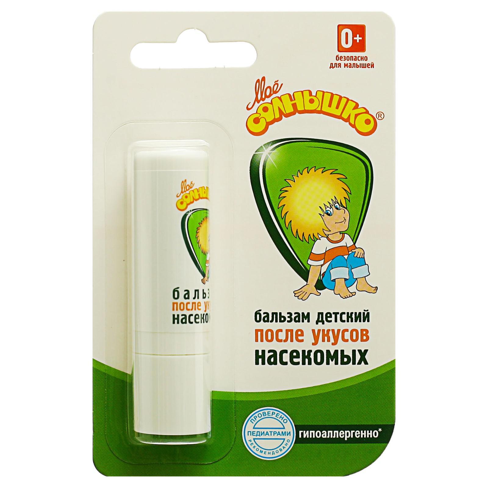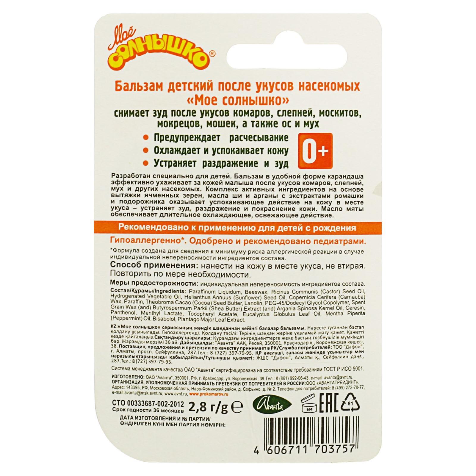 Бальзам детский после укусов насекомых "моё солнышко", 2,8 г. Состав: Вода, октокрилен, этилгексил салицилат, метилен бис-бензотриазол тетраметилбутилфенол (бисоктризол) (и) вода (и) децилглюкозид (и) пропиленгликоль (и) ксантановая камедь, глицерилстеарат (и) ПЭГ-100 стеарат, диэтиламиногидроксибензол гексилбензоат, этилгексил триазин, глицерин, цетеариловый спирт, бутилметоксидибензол метан (авобензон), дибутил адипат, 2- феноксиэтанол (и) каприлилгликоль, изопропилпальмитат, диоксид титана (и) силика, С12-С15 алкил бензоат, магний алюмосиликат, сорбитанстеарат, цетилфосфат калия, гидроксиацетофенон, ксантановая камедь, акрил/винил изодеканоат кроссполимер, полисорбат -20, ароматическая композиция, витамин Е-ацетат, гидроксиэтилмочевина, тетрадибутилпентаэритритилгидрокси-гидроциннамат, динатрий ЭДТА, экстракт цветков календулы, натрия гидроксид ч. , х. ч, кислота лимонная пищевая. ИнструкцияЗа 20 минут до выхода на солнце, нанесите крем равномерным слоем на кожу лица и тела ребенка. Возобновляйте нанесение в течение дня, особенно после продолжительного купания или при очень длительном пребывании на солнце. Вид средства: Бальзам Назначение: После укусов насекомых  развернуть описание ▼