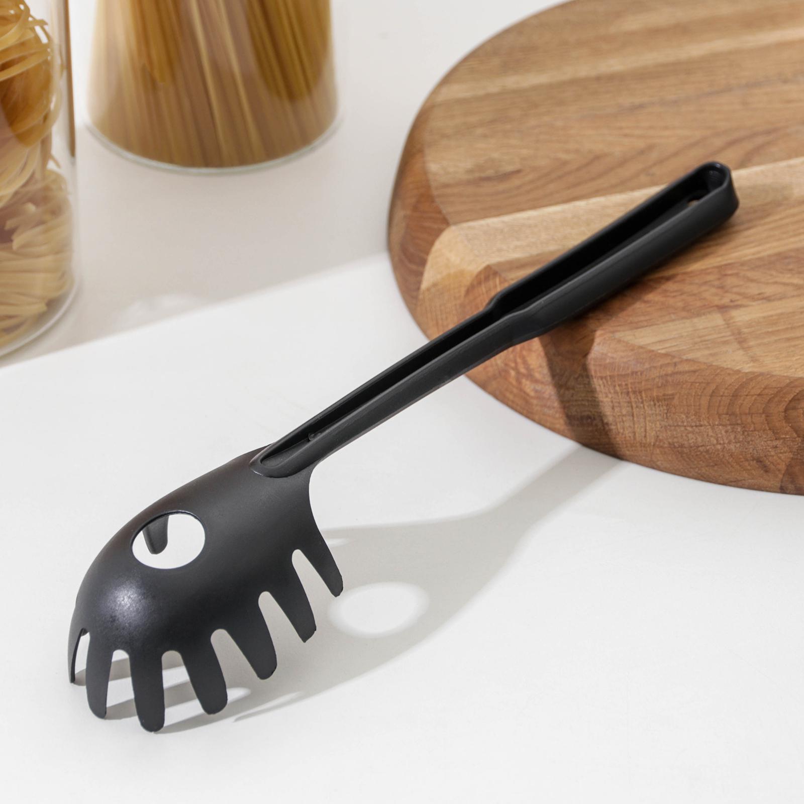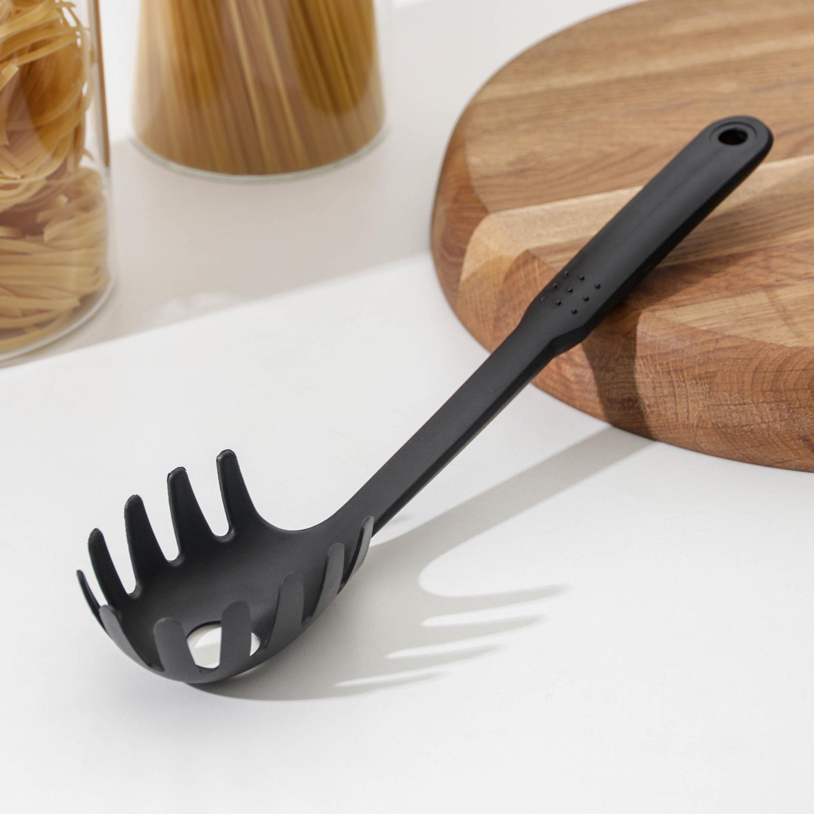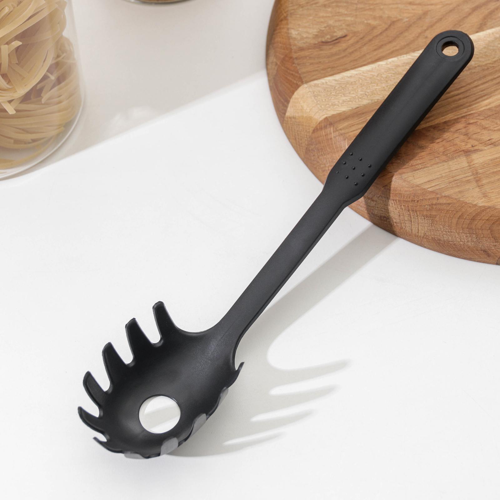Ложка для спагетти доляна «орихалк», 30 см, цвет чёрный. Специальная ложка для спагетти не даст длинным макаронным изделиям соскользнуть обратно в кастрюлю. Эргономичный инструмент оснащен длинной ручкой и тупоносыми зубчиками. Такая конструкция позволяет забыть о привычных трудностях при раскладывании горячего блюда по порциям. Предлагаемое изделие выполнено из нейлона и обладает рядом эксплуатационных преимуществ: Термостойкость кухонных инструментов из нейлона достигает 210 °C. Изделия пригодны для мытья в посудомоечной машине. Подходят для готовки в посуде с антипригарным покрытием. Следует помнить о правилах эксплуатации предмета: Необходимо избегать прямого контакта с источником нагрева. В ходе готовки не следует оставлять прибор в посуде. Цвет: Чёрный Материал ручки: Пластик Материал: Пластик Можно мыть в посудомоечной машине: Да  развернуть описание ▼