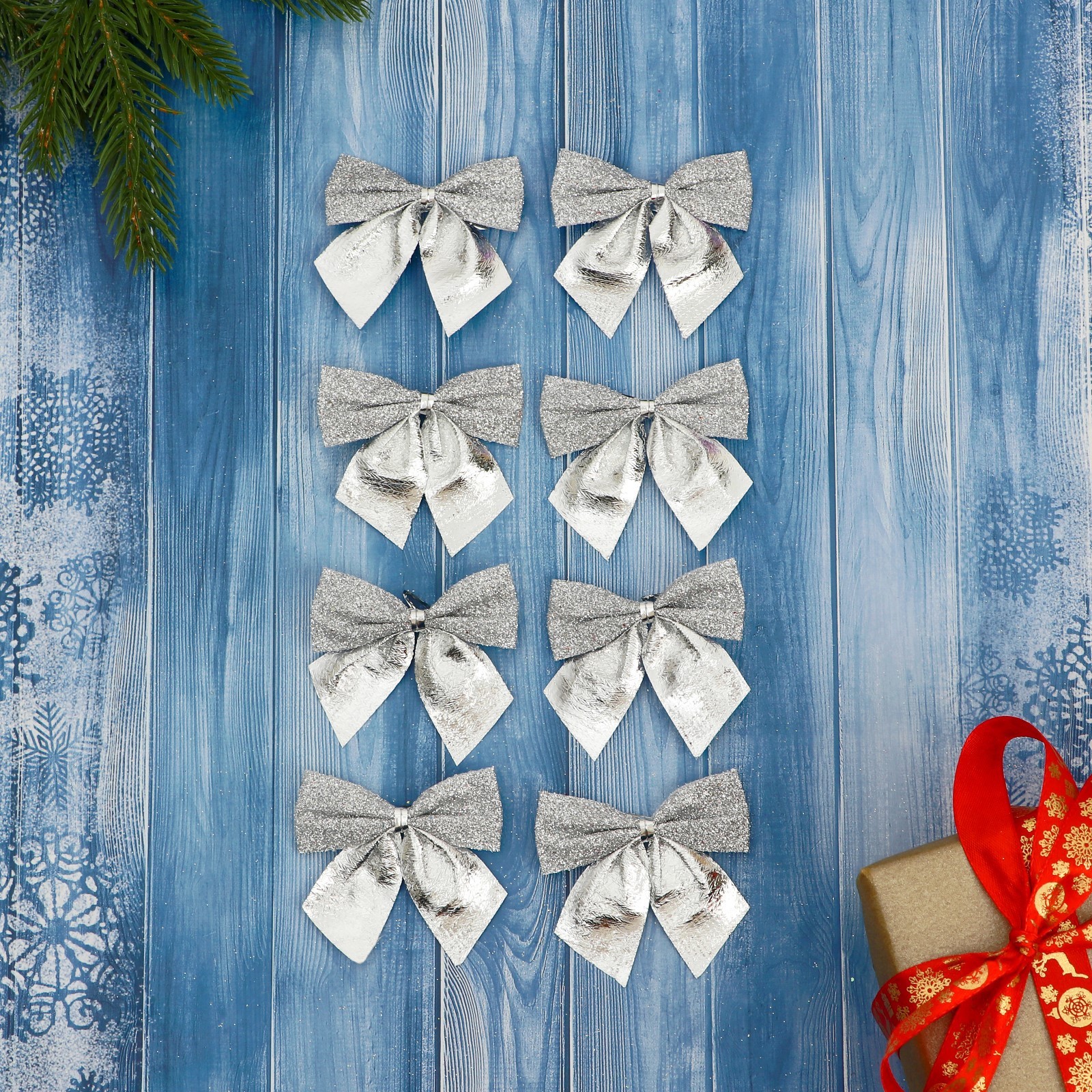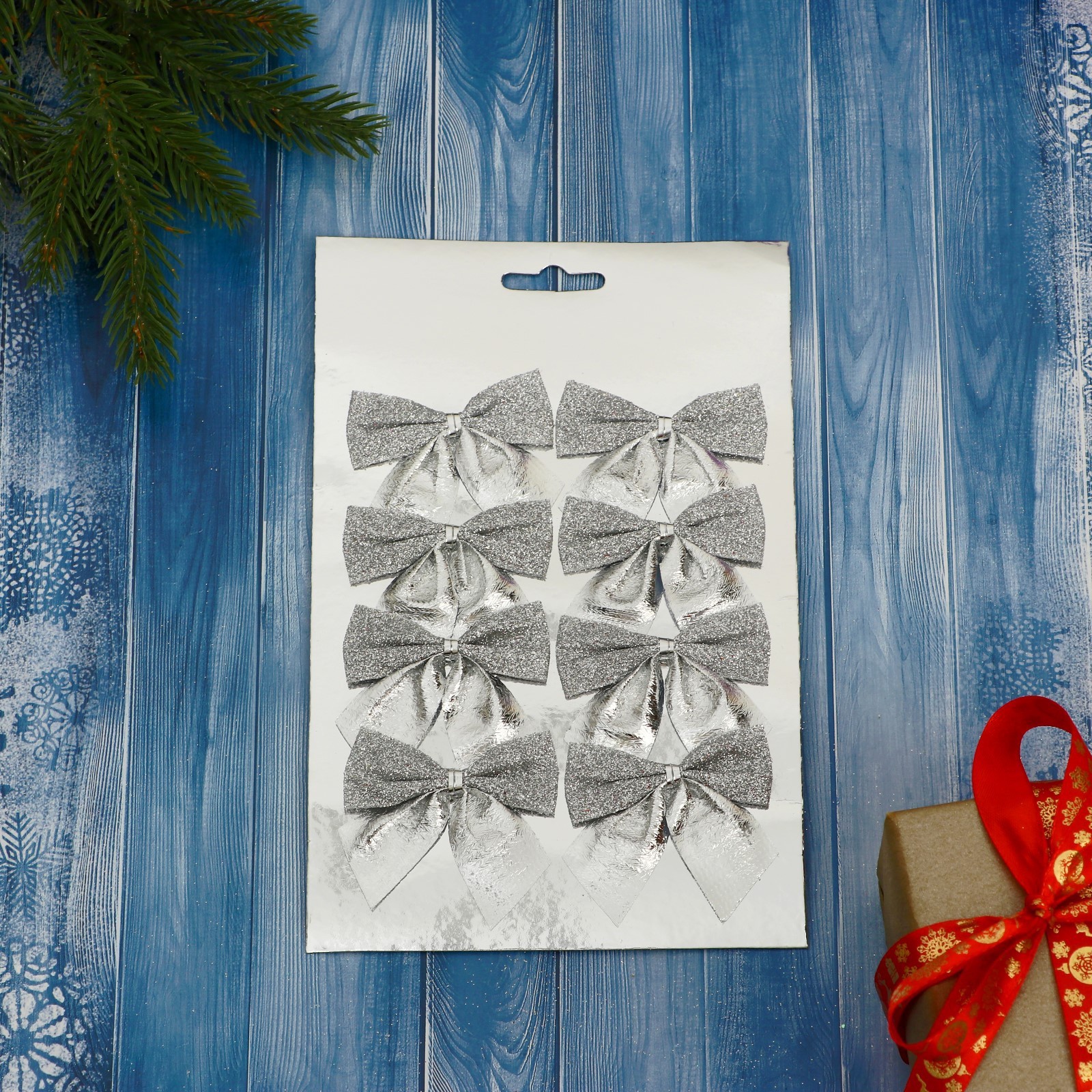 Ёлочные игрушки 8 шт., «зимнее волшебство. бантик с блеском» пластик, 4.5 5.5 см, серебро