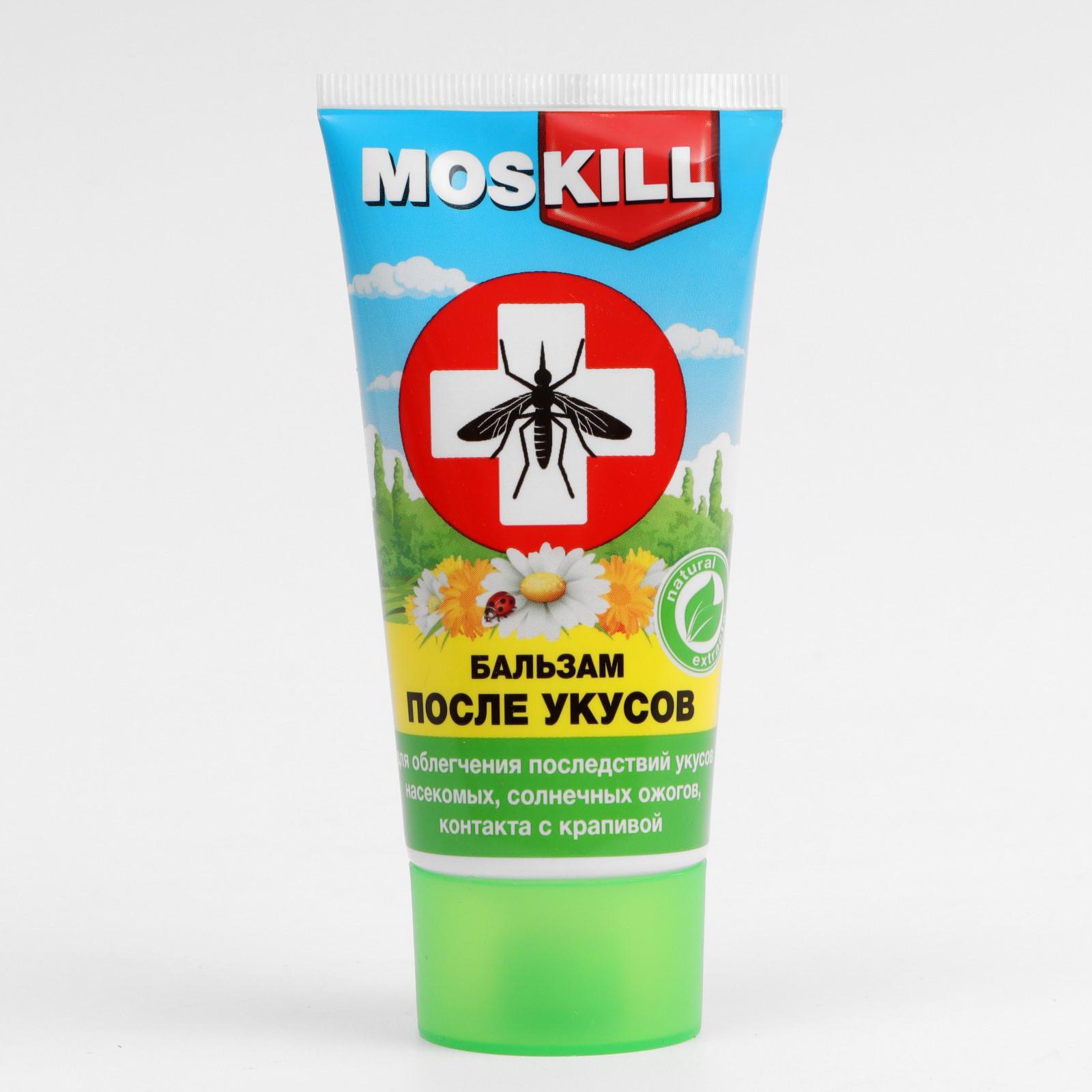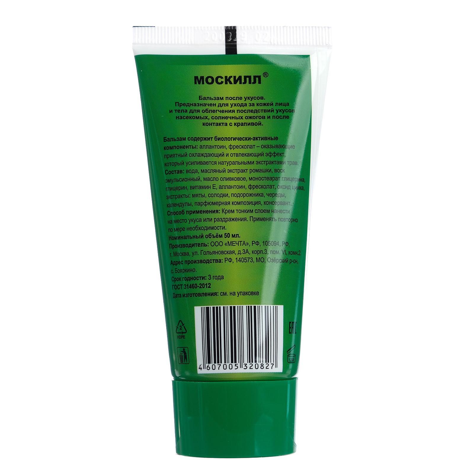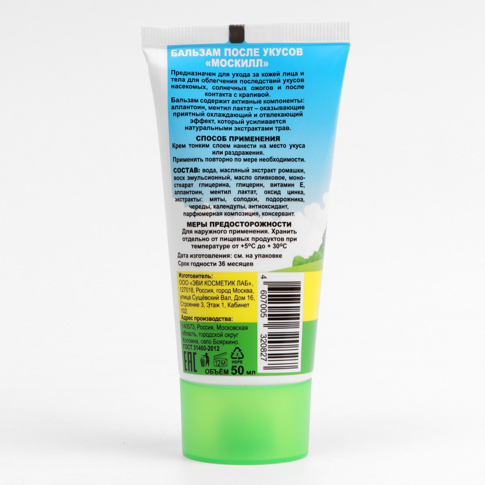 Бальзам после укусов насекомых "москилл", 50 мл. Косметический бальзам снимает различные раздражения и воспаления кожи в результате укусов насекомых, солнечных ожогов и после контакта с крапивой. Нежная ароматная эмульсия уменьшает боль, зуд и жжение, предотвращает отек и воспаление. Состав: вода, масляный экстракт ромашки, воск эмульсионный, масло оливковое, моностеарат глицерина, глицерин, витамин Е, аллантоин, ментиллактат, оксид цинка, экстракты: мяты, солодки, подорожника, череды, календулы, парфюмерная композиция, консервант. Вид средства: Бальзам Назначение: После укусов насекомых  развернуть описание ▼