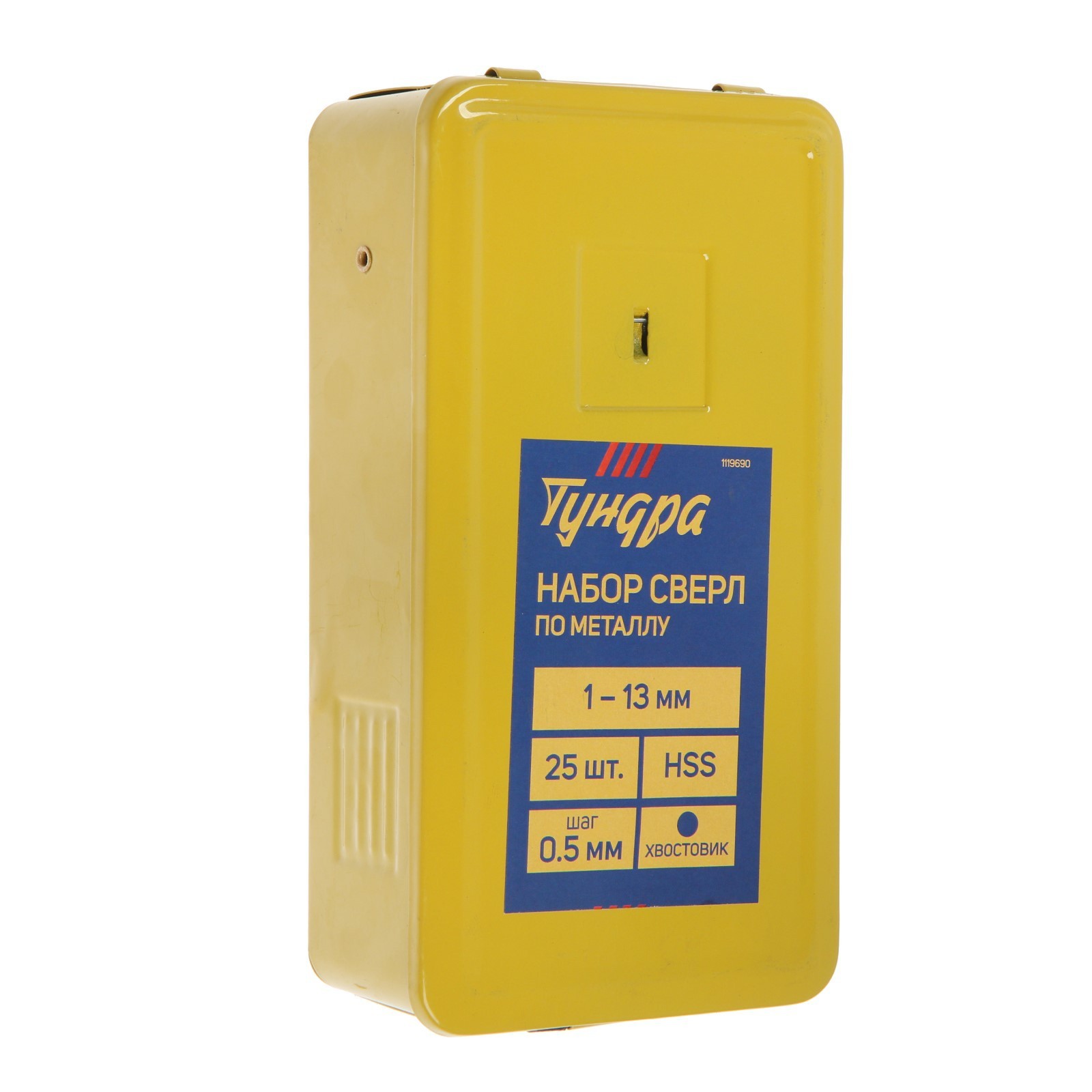 Набор сверл по металлу тундра, hss, цилиндрический хвост., 1 - 13 мм (через 0.5 мм), 25 шт.. Быстрорежущие свёрла ТУНДРА изготовлены из стали HSS, обладают повышенной прочностью, сильны к ударным нагрузкам, имеют высокую теплостойкость, продолжительный срок службы. Используются с шуруповёртами, электродрелями и на сверлильных станках для выполнения отверстий конструкциях. Данная модель предназначена для работы: c пластмассой.c углеродистой сталью;c цветным металлом;c чугуном.Набор:Да|Диаметр, мм:1|Диаметр, мм:1.5|Диаметр, мм:2|Диаметр, мм:2.5|Диаметр, мм:3|Диаметр, мм:3.5|Диаметр, мм:4|Диаметр, мм:4.5|Диаметр, мм:5|Диаметр, мм:5.5|Диаметр, мм:6|Диаметр, мм:6.5|Диаметр, мм:7|Диаметр, мм:7.5|Диаметр, мм:8|Диаметр, мм:8.5|Диаметр, мм:9|Диаметр, мм:9.5|Диаметр, мм:10|Диаметр, мм:10.5|Диаметр, мм:11|Диаметр, мм:11.5|Диаметр, мм:12|Диаметр, мм:12.5|Диаметр, мм:13|В наборе, шт.:25|Тип хвостовика:Цилиндрический|Применение:Металл|Вид сверла:Спиральное|Страна:Китай  развернуть описание ▼