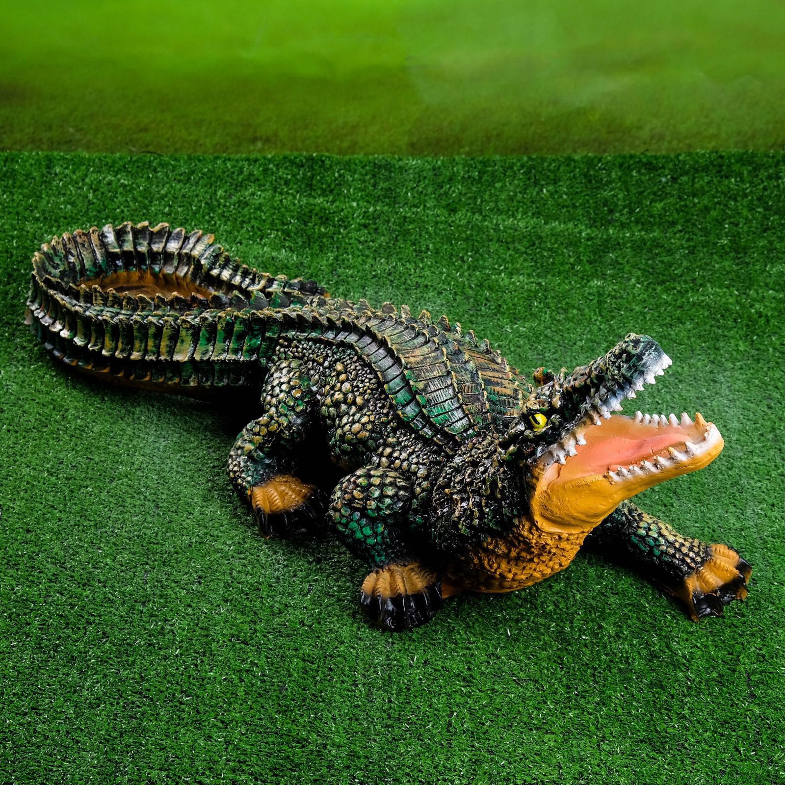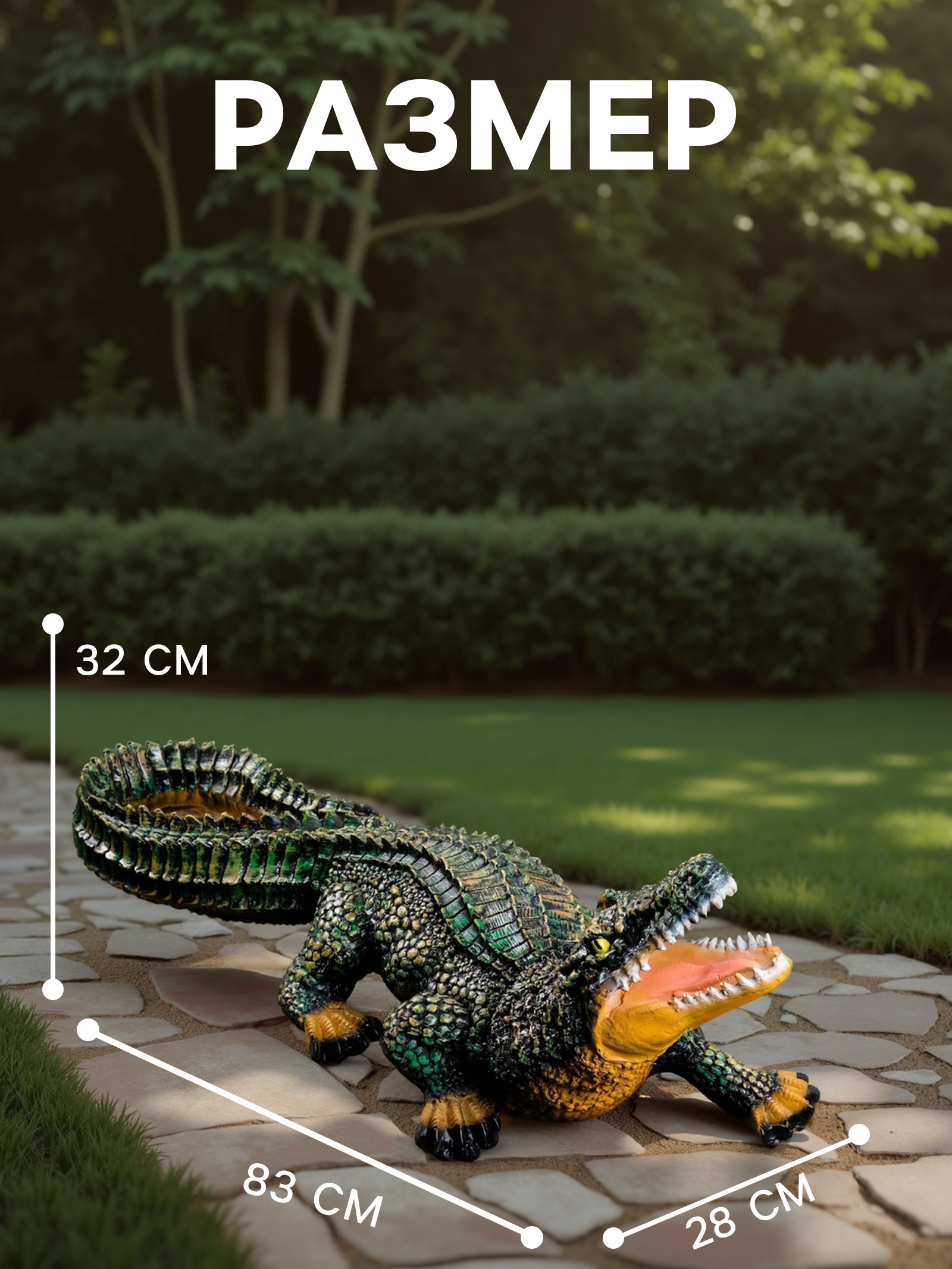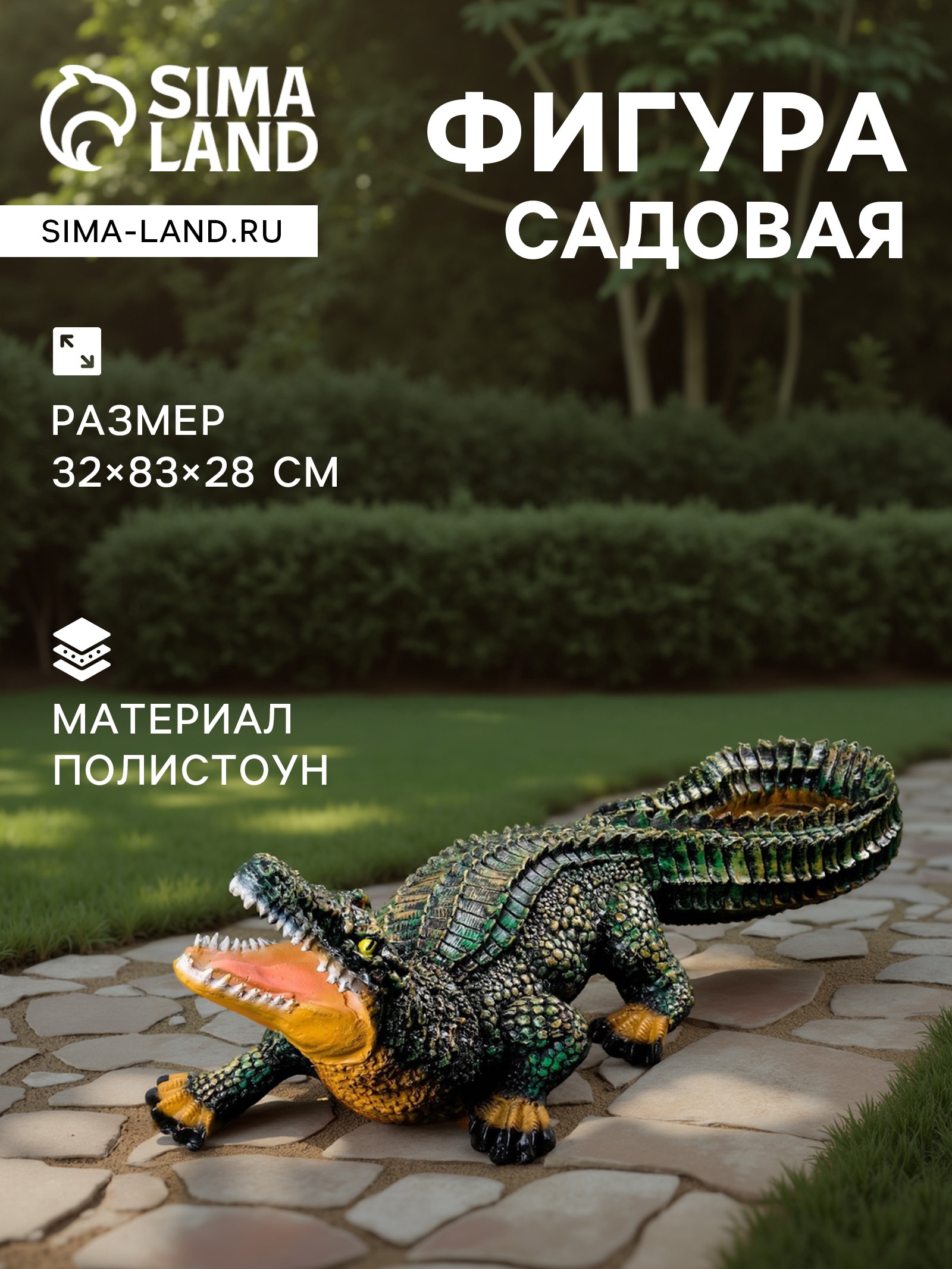 Садовая фигура из полистоуна «крокодил», 32 83 28 см. Садовая фигура — это всегда стильное и яркое решение для ландшафтного декора, который добавит уюта и индивидуальности дачному участку, саду, огороду или клумбе. С ее помощью можно оформить вход на участок, разграничить пространство, разметить дорожку, создать тематическую атмосферу и превратить сад в единую композицию (узнать, как это сделать, можно в статье 5 причин использовать садовые фигуры на даче). Чтобы украшение радовало вас дольше, рекомендуем следовать Инструкции по уходу за садовыми фигурами. Цвет:Разноцветный|Цвет:Зелёный|Высота, см:32|Материал:Полистоун|Одноцветный:Нет|Можно оставлять зимой на улице:Да|Страна:Россия  развернуть описание ▼