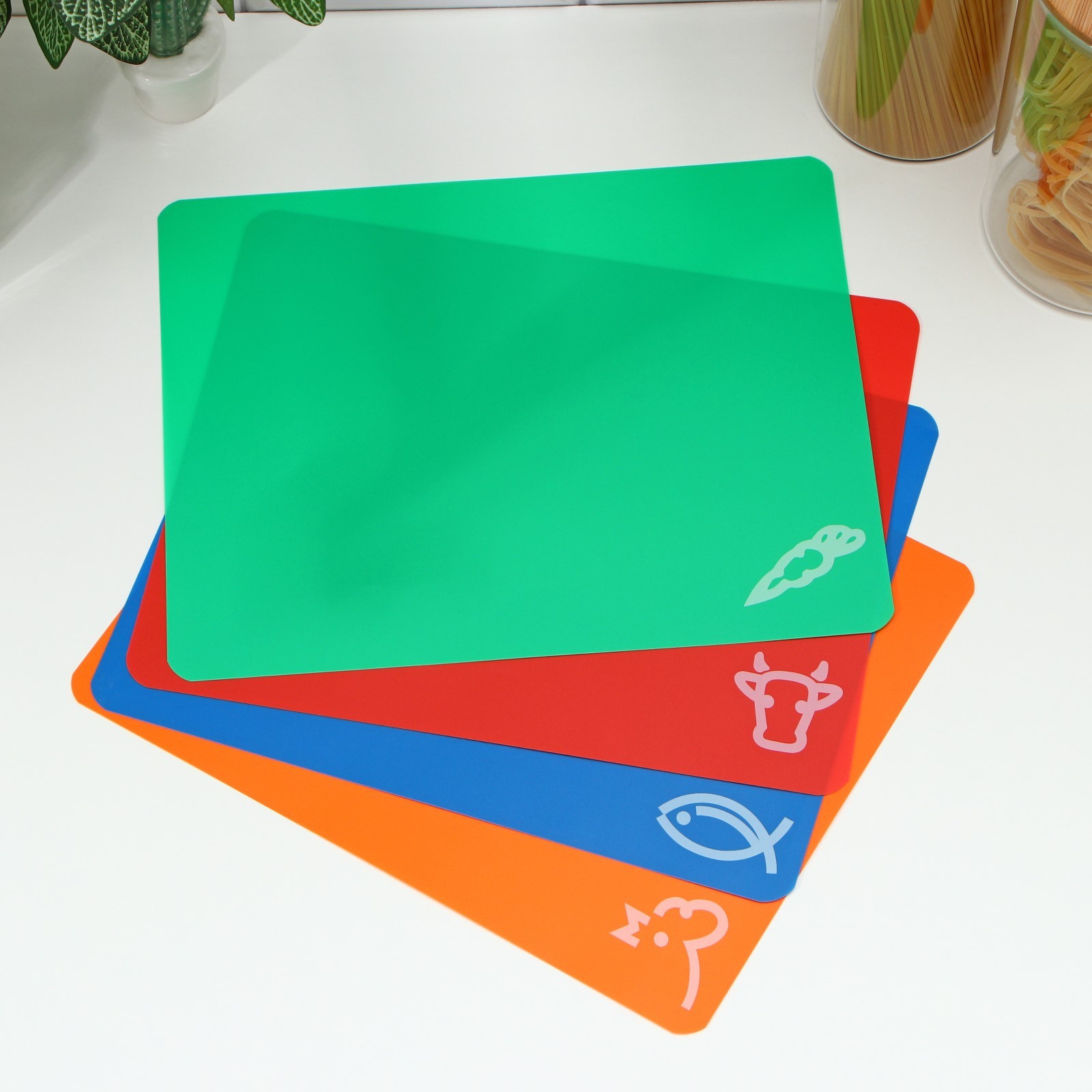 Набор досок разделочных пластиковых гибких прямоугольных доляна, 4 шт, 34,5x27,5x0,1 см, цвет микс. В приготовлении блюд разделочная доска играет не меньшую роль, чем сковорода, нож или плита. Качественная разделочная доска поможет получить от процесса приготовления пищи максимум пользы. Преимущества: Имеет оптимальный размер, многофункционально и при необходимости может заменить подставку для горячих сковород. Подойдет для разделки рыбы, мяса курицы или говядины, шашлыка, овощей, хлеба, теста, фруктов, продуктов, нарезок сыра и колбасы, картофеля, картошки. Материал легко очищается от грязи и жира, более экологичен, чем деревянное покрытие, которое впитывает запахи и влагу. Кроме того, разделочные доски можно использовать в качестве оригинального элемента сервировки стола - подать сыр к вину, фрукты, овощи, мясные закуски. Цвет: МИКС Форма: Прямоугольная Длина, см: 34 Ширина, см: 27.5 В наборе, шт.: 4 Материал: Пластик Тип доски: Гибкая Можно мыть в посудомоечной машине: Да Особенности: Противоскользящая  развернуть описание ▼