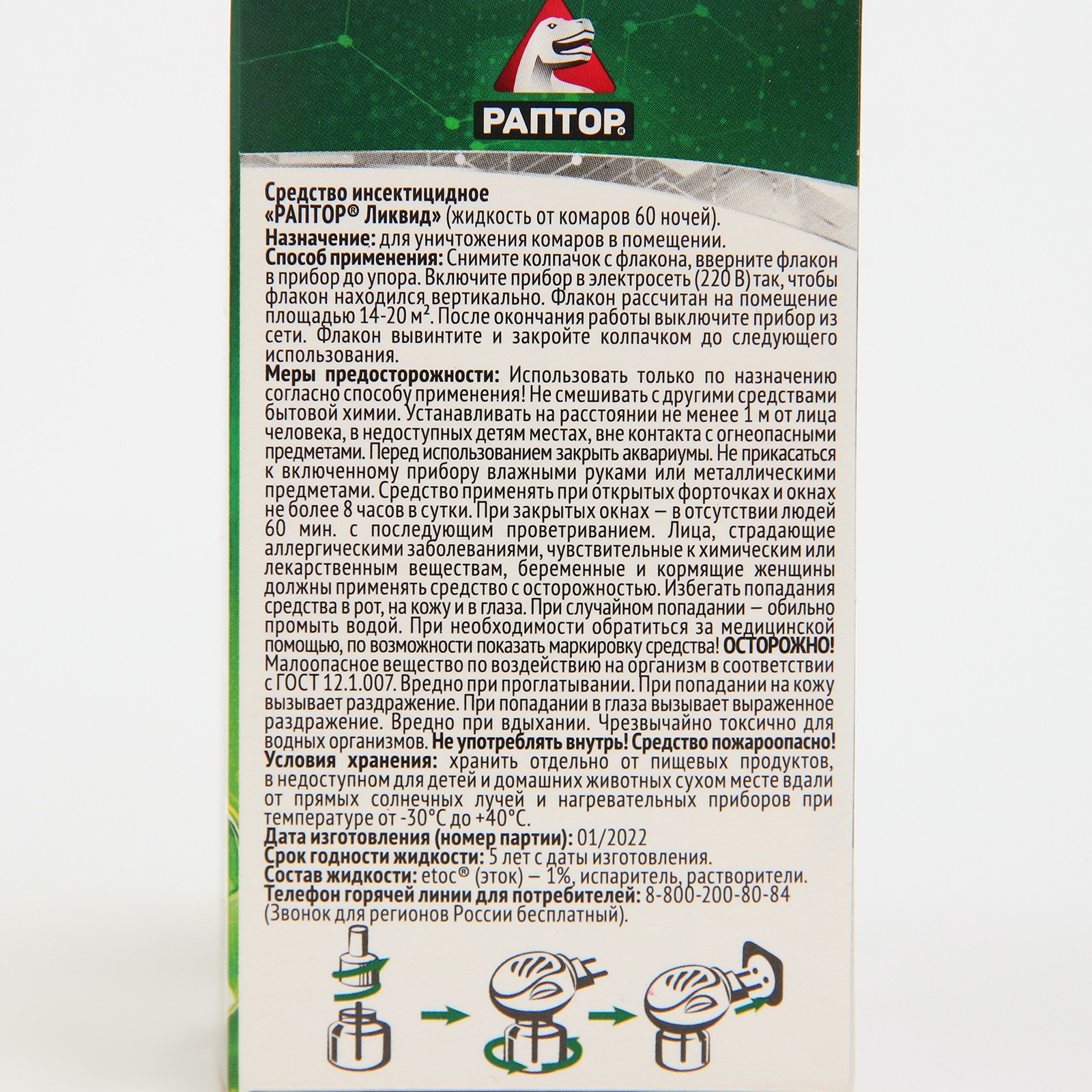 Дополнительный флакон-жидкость от комаров "раптор", без запаха, 60 ночей