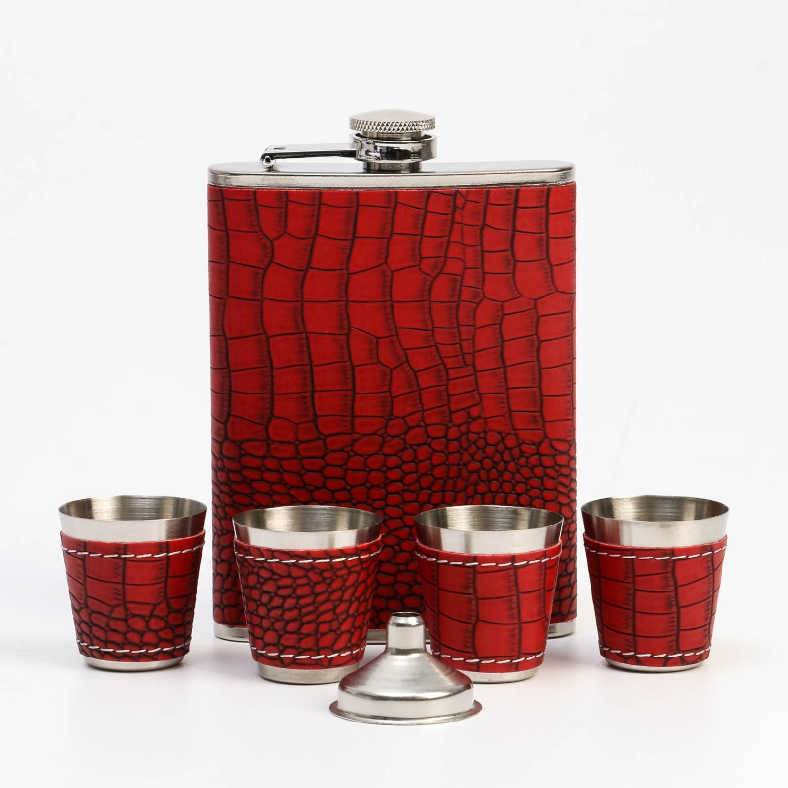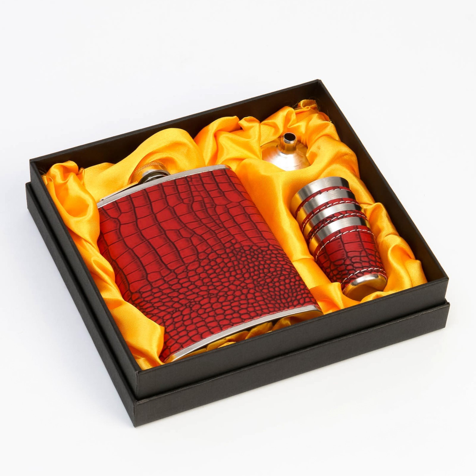 Подарочный набор 5 в 1 "кожа питона": фляжка 240 мл + 4 рюмки. Когда речь идёт о том, что подарить сильному, брутальному и мужественному мужчине, на какой либо повод, то голова идёт кругом! Но мы представляем один из самых интересных, памятных а так же практичных вариантов подарка - это набор с фляжкой! Содержимое набора порадует сильную половину человечества, т. к. в наборе есть фляжка из нержавеющей стали, две стопки и воронка, что очень удобно и практично! Мужчины точно оценят! Упаковано в подарочную коробку, что тоже очень удобно и не надо дополнительно тратить время на выбор подарочного оформления! Цвет: Красный Цвет: Хромированный Для кого: Унисекс В наборе, шт.: 6 Объём, мл: 240 Вид упаковки: Коробка картонная Адресат: Без адресата Материал: Искусственная кожа Материал: Металл Составляющие набора: Рюмки (стопки) Составляющие набора: Фляга Возраст: Для взрослых Тематика подарка: Посуда Тематика подарка: Туризм Тематика подарка: Сувениры  развернуть описание ▼