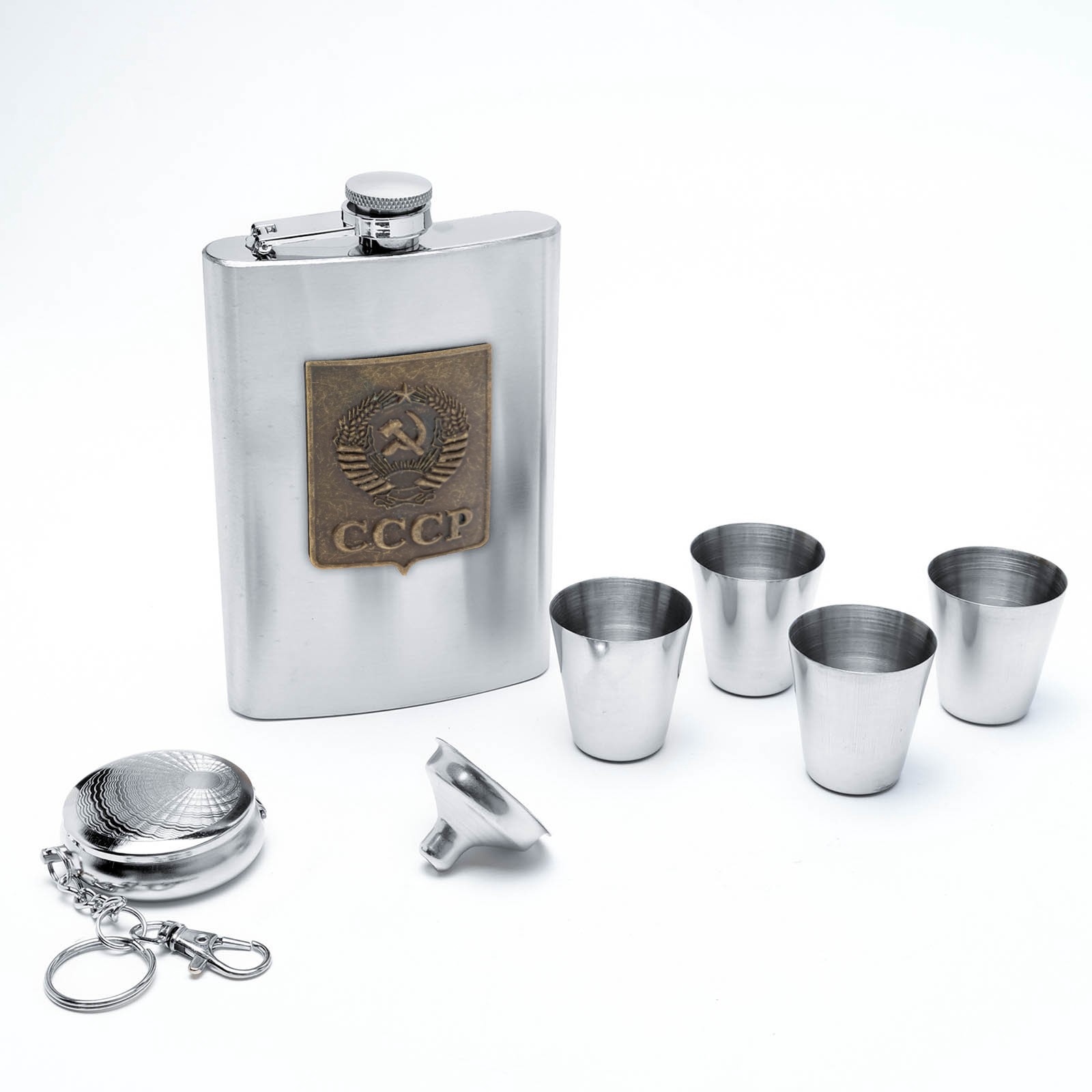Подарочный набор «ссср»: фляжка 270 мл 4 стопки, воронка, брелок. Когда речь идёт о том, что подарить сильному, брутальному и мужественному мужчине на какой либо повод, то голова идёт кругом! Один из самых интересных, памятных а так же практичных вариантов подарка-это набор с фляжкой! В наборе есть фляжка 270 мл, 4 стопки по 30 мл, воронка, карманная пепельница-брелок, что очень удобно и практично! Мужчины точно оценят! Упаковано в подарочную коробку Цвет:Хромированный|Цвет:Серебристый|Для кого:Для мужчины|В наборе, шт.:7|Объём, мл:30|Объём, мл:270|Вид упаковки:Коробка картонная|Рисунок:Да|Тематика праздника:23 Февраля|Адресат:Без адресата|Материал:Металл|Составляющие набора:Рюмки (стопки)|Составляющие набора:Воронка|Составляющие набора:Фляга|Составляющие набора:Пепельница|Возраст:Для взрослых|Страна:Китай  развернуть описание ▼