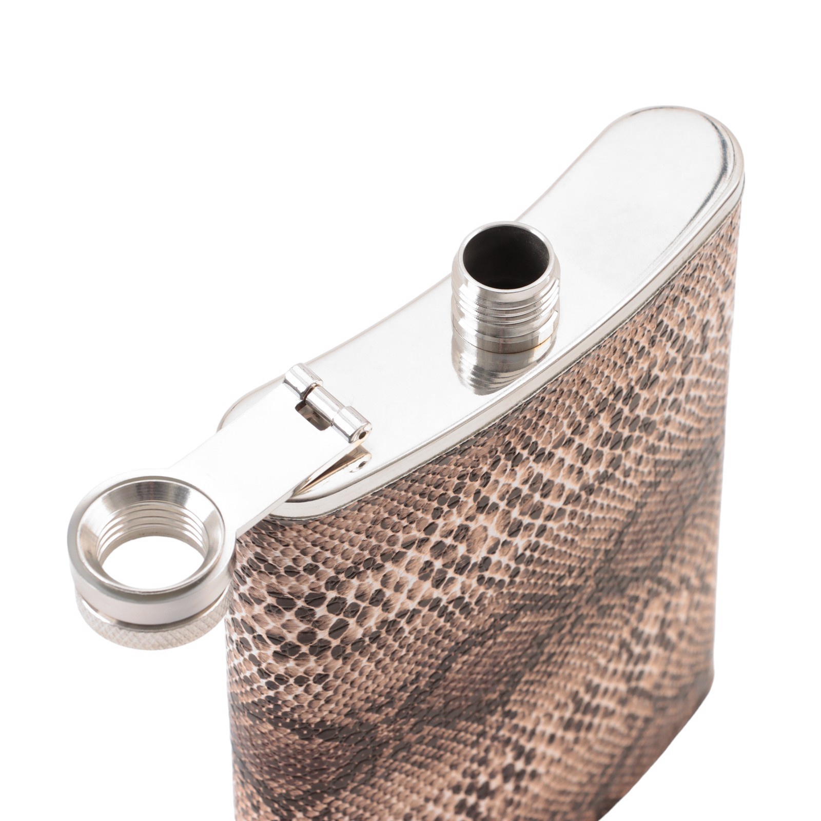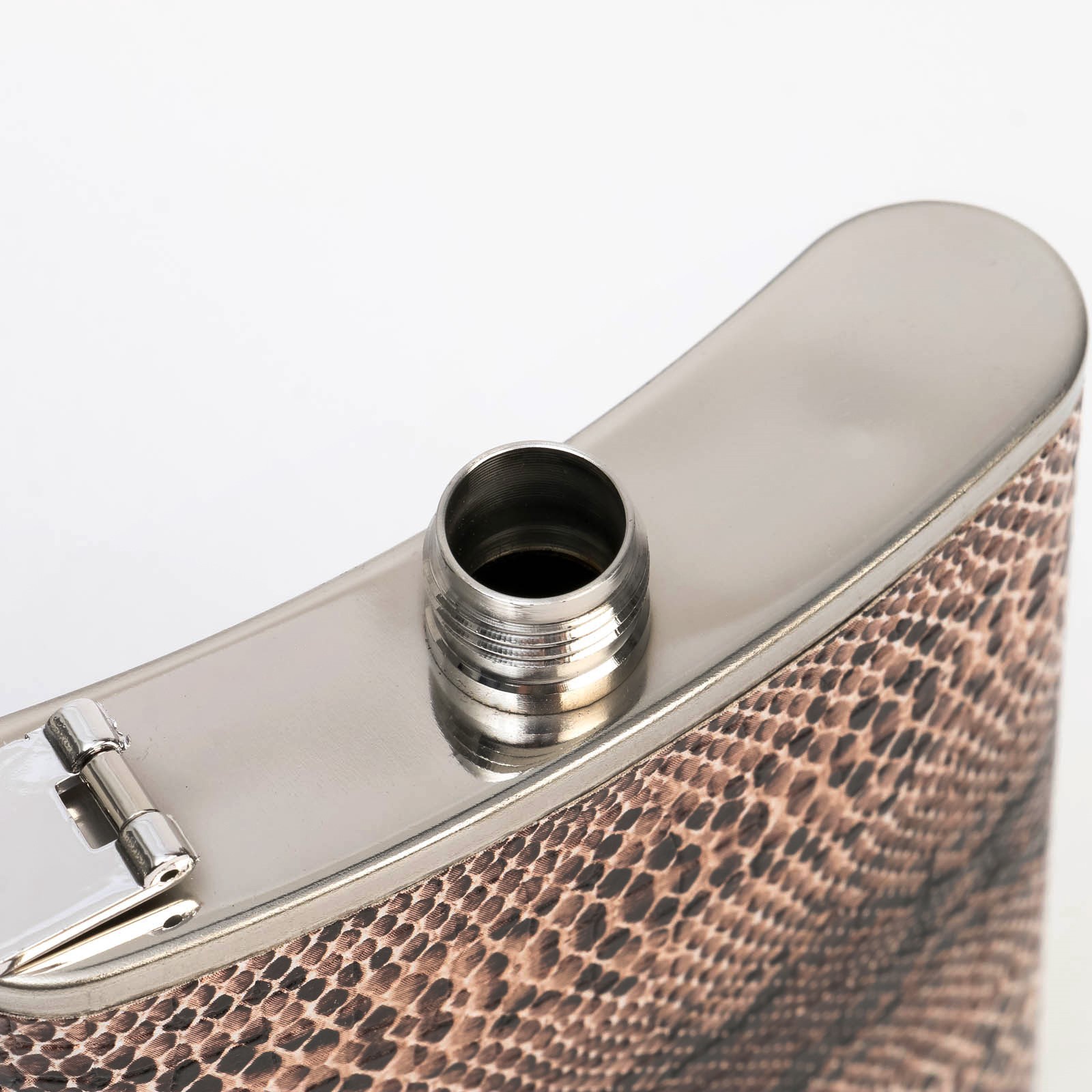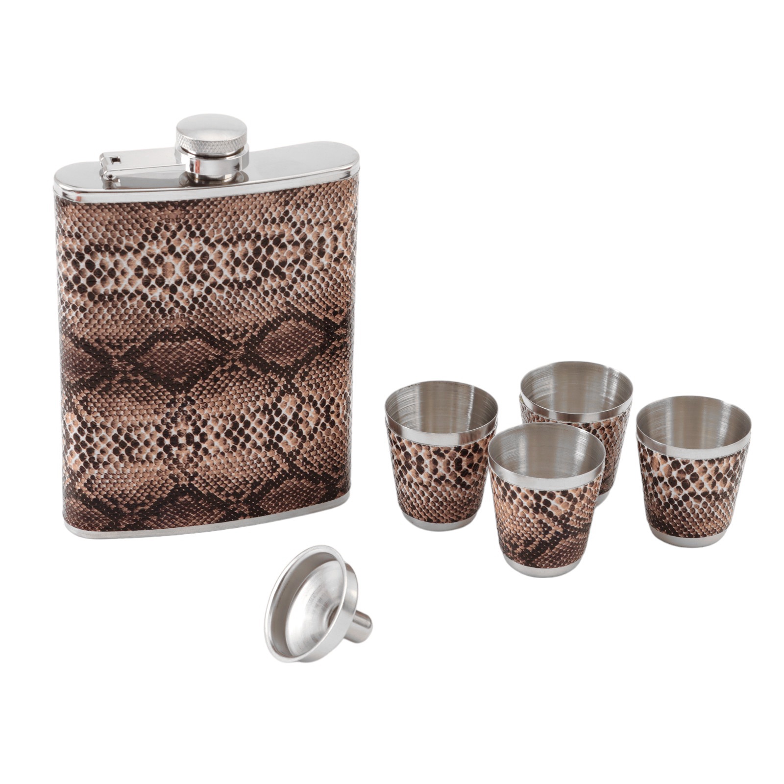 Подарочный набор «питон»: фляжка 240 мл, 4 рюмки, воронка. Фляжка — это небольшой сосуд, который используется для хранения и переноса жидкостей. Они популярны среди путешественников, спортсменов и любителей активного отдыха. Легкий и функциональный аксессуар - станет незаменимым спутником любых приключений. Фляжка - это оригинальный способ хранить и переносить жидкость в стильном форм-факторе, модный аксессуар, который привлекает внимание и поднимает настроение. Фляжка будет вашим верным спутником, готовым утолить вашу жажду в любых ситуациях. Компактный размер фляжки делает ее идеальным выбором для путешествий и прогулок. Фляга предназначена для хранения и транспортировки питьевой воды. В нее также можно наливать любые согревающие напитки, в том числе алкогольные. Отличным дополнением в наборе с фляжкой являются 4 рюмки и воронка для удобного переливания жидкостей, упакованы в подарочную коробку. Подарочный набор подойдёт в качестве подарка папе, брату, другу, брату, дедушке на 23 февраля, день рождения или любой другой праздник. Цвет:Хромированный|Цвет:Бежевый|Цвет:Золотистый|Для кого:Для женщины|В наборе, шт.:6|Объём, мл:30|Объём, мл:240|Вид упаковки:Коробка картонная|Рисунок:Да|Тематика праздника:23 Февраля|Адресат:Без адресата|Материал:Металл|Материал:Искусственная кожа|Составляющие набора:Рюмки (стопки)|Составляющие набора:Воронка|Составляющие набора:Фляга|Возраст:Для взрослых|Страна:Китай  развернуть описание ▼