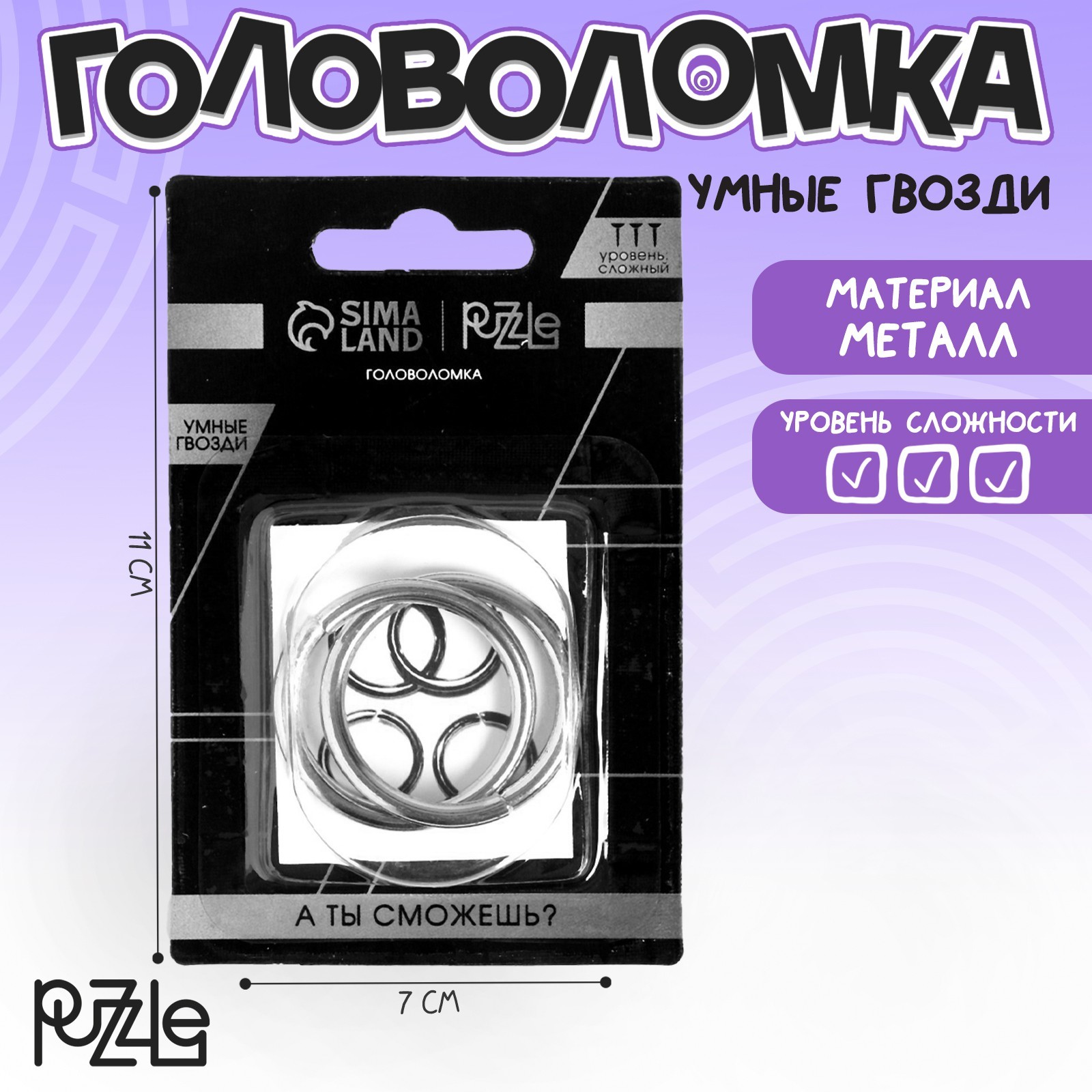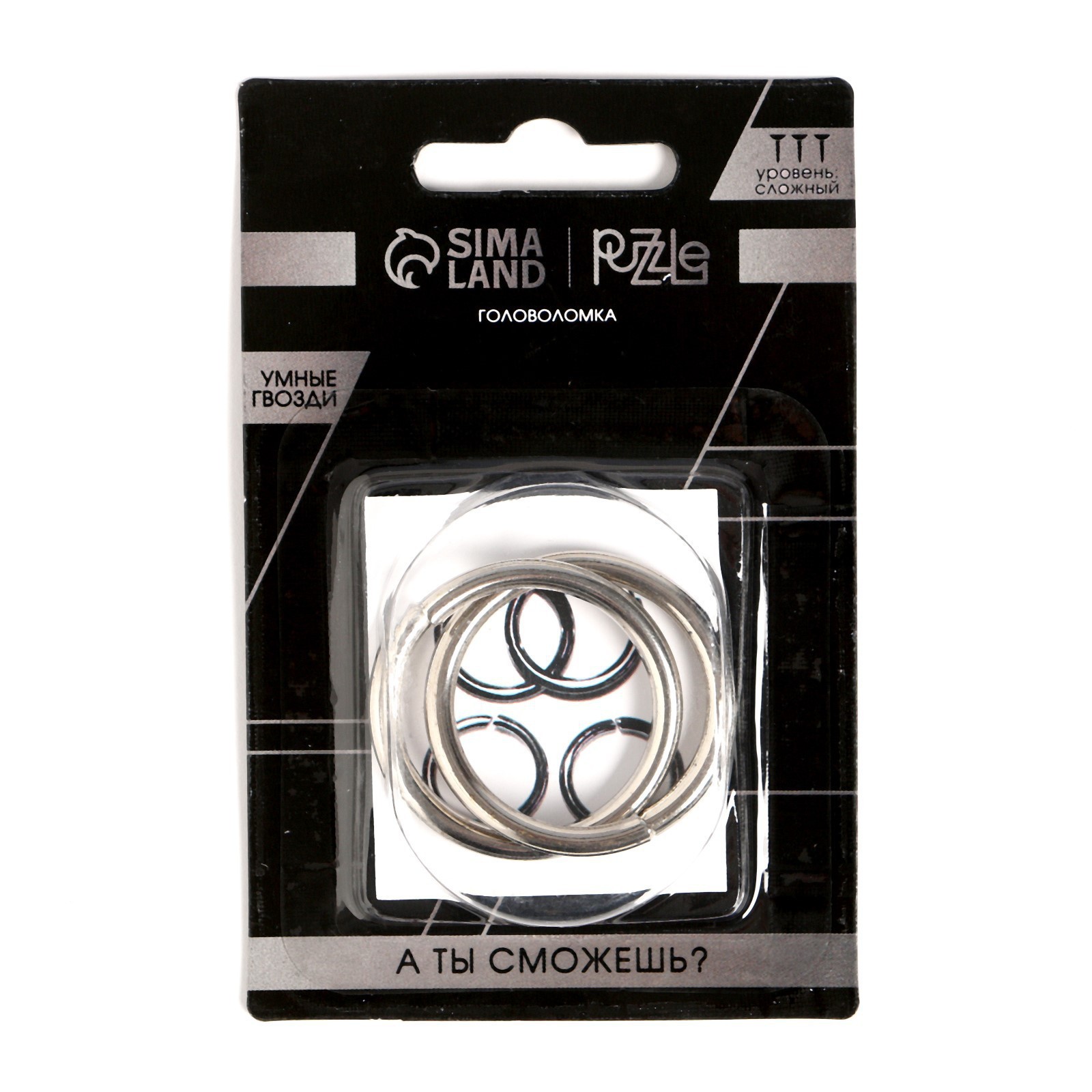 Головоломка «умные гвозди» №22,на блистере. Головоломка Игры разума "Умные гвозди" №22 - это уникальный товар, способствующий развитию эрудиции, воображения, логического мышления, смекалки и умения концентрировать внимание. Хотите продемонстрировать друзьям свои интеллектуальные способности? Головоломка Игры разума "Умные гвозди" №22 поможет Вам в этом поможет. Это отличный подарок для друзей и близких, который вы можете приобрести в розницу у нас по выгодной цене. Для кого: Унисекс Возраст: От 7 лет Лицензия: Нет Материал: Металл Вид головоломки: Кольца и замки Дополнительные функции: Развивающая Сложность головоломки: 2  развернуть описание ▼