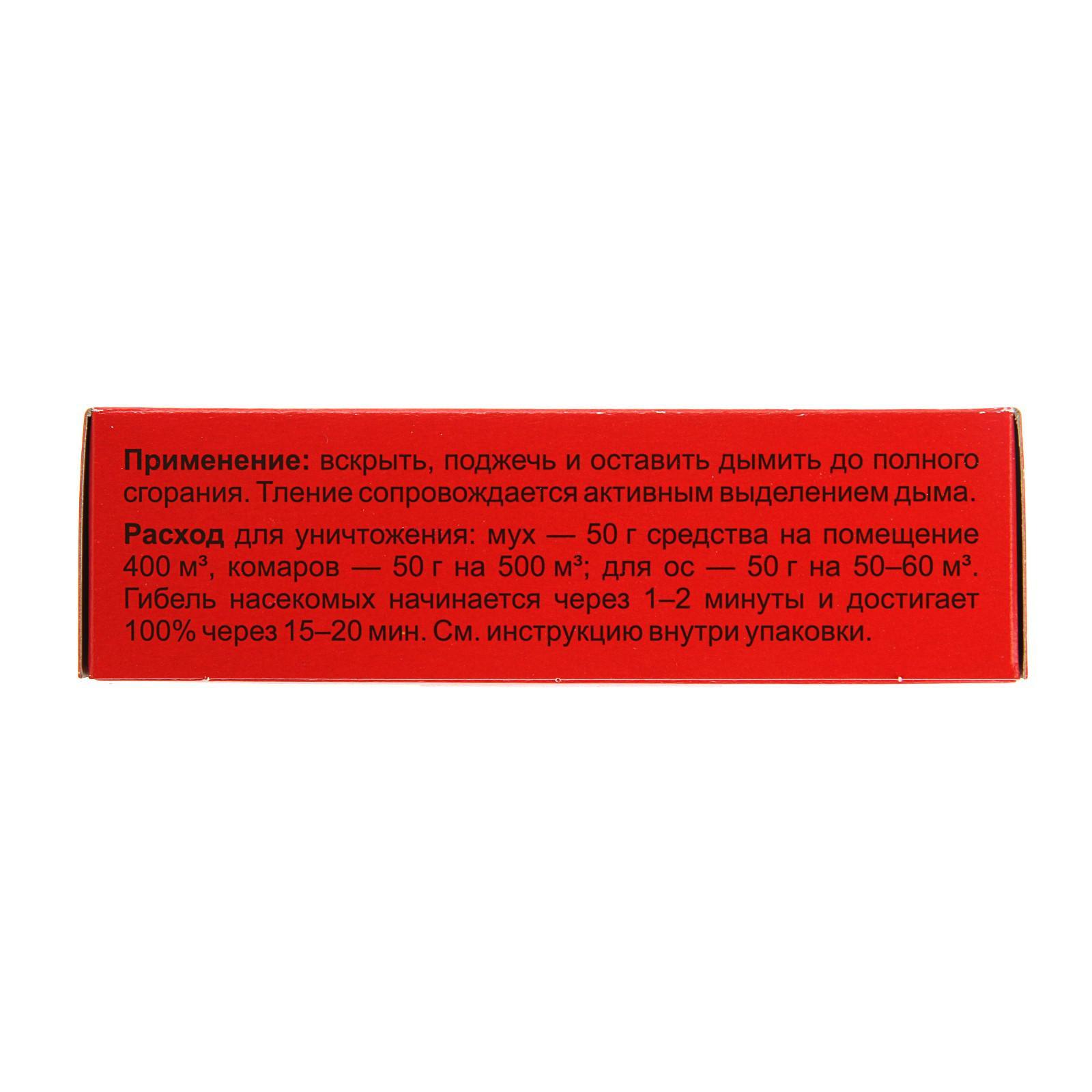 Дымовая инсектицидная шашка мухояр от мух, комаров и ос, 50г. Привычное средство против летающих насекомых в хлевах, дворовый и хозяйственных помещениях являются аэрозоли (типа дихлофоса). Но, при всей эффективности, они имеют ряд недостатков. При обработке помещений надо защищать органы дыхания и слизистые, т. к. велик риск «нахвататься» ядовитых испарений. Способ применения: средство разместить внутри помещения и поджечь. Дымовая шашка интенсивно дымит (но не горит!). Дымление происходит в течение 1-2 мин после поднесения спички, и человек успевает покинуть помещение. Дым проникает во все щели и уничтожает спрятавшихся там насекомых. Одинаково легко обработать как низкие, так и очень высокие помещения. А при уничтожении ос исключена опасность быть ужаленным. Остатки дыма полностью удаляются при проветривании. Дымовая шашка «Мухояр» уничтожает не только мух, ос и комаров, но и блох, пухо-пероедов, тараканов. Состав: перметрин — 5%, окислитель, пламегаситель, наполнитель (тальк). Назначение: От комаров Назначение: От мух Тип средства: Инсектицид  развернуть описание ▼