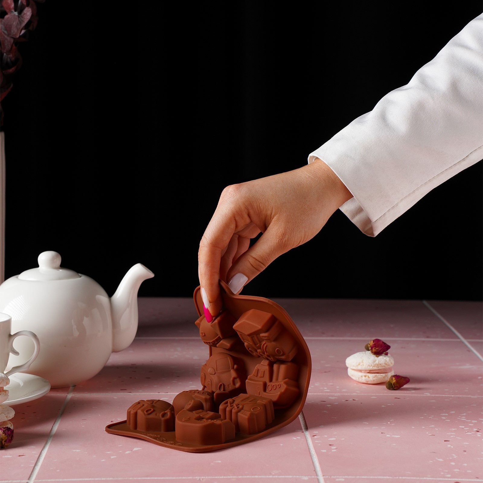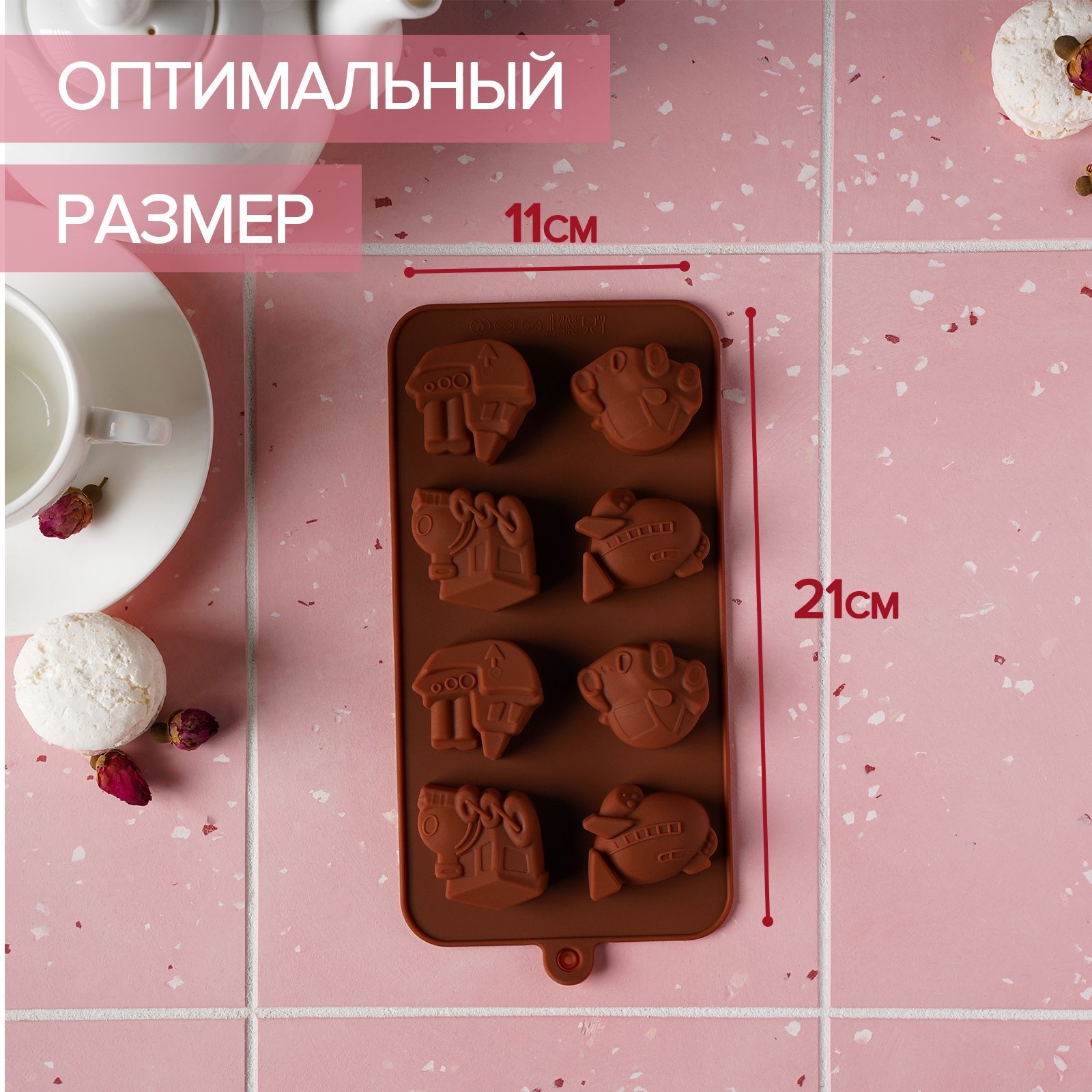 Форма для мармелада доляна «машинки», 21,1x10,2x1,8 см, 8 ячеек (4,3x3,5 см), цвет коричневый. Силиконовые формы для мармелада помогут приготовить вкусные и натуральные желейные десерты в домашних условиях! Форма изготовлена из качественного силикона, что гарантирует долгий срок службы. Удобный дизайн позволяет легко извлекать готовый мармелад, а благодаря своей гибкости, форма обеспечивает идеальную текстуру мармелада. Достоинства: содержимое не прилипает к стенкам изделия;силикон выдерживает температуру от -40 до 230 °С;материал не впитывает запахов и полностью безопасен для продуктов питания;форма легко отмывается, в том числе в посудомоечной машине. Создавайте неповторимые кулинарные шедевры вместе с формой «Машинки»! Цвет: Коричневый Форма: Фигурная Количество ячеек: 8 Крышка: Нет Материал: Силикон Тип покрытия: Без покрытия Ячейки: Да Наличие палочек для форм: Нет Разъёмная форма: Нет Съёмное дно: Нет Тематика: Транспорт, здания  развернуть описание ▼