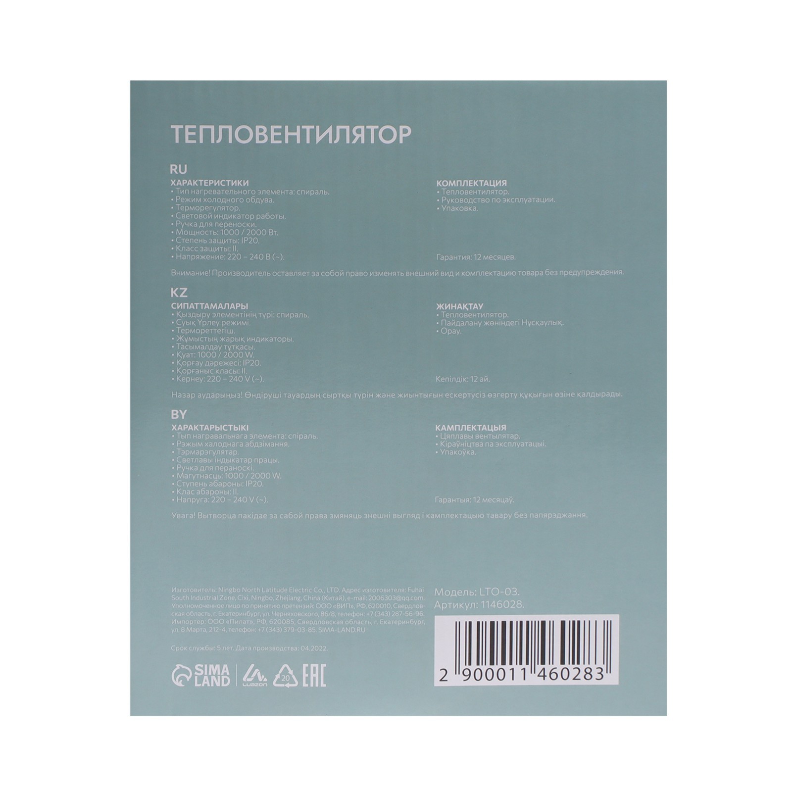Тепловентилятор Luazon Lto-03, спиральный, напольный, 1000/2000 вт, 2 режима, белый