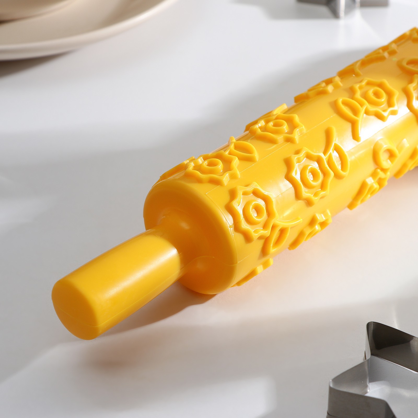 Скалка кондитерская «цветочки», 37 см, рабочая часть 25 см, фактурная, цвет жёлтый
